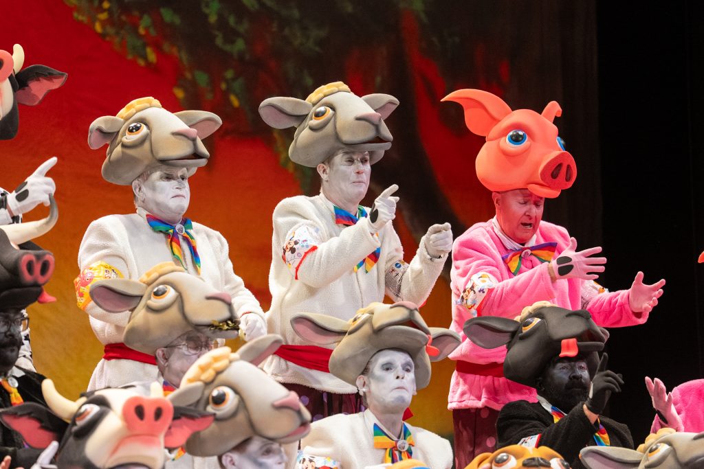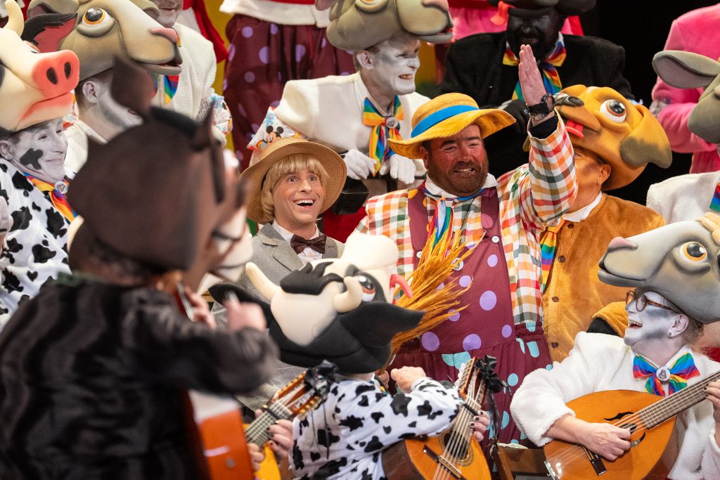 La presentación funciona mejor desde lo visual que desde lo escénico. La imagen de la granja resulta amable y fácilmente identificable, pero el arranque no consigue generar la energía necesaria para enganchar al teatro desde el inicio. El humor se apoya en juegos de palabras, sonidos animales y situaciones disparatadas que buscan la risa constante, aunque sin un golpe inicial que marque diferencia dentro de una fase tan exigente como los cuartos.