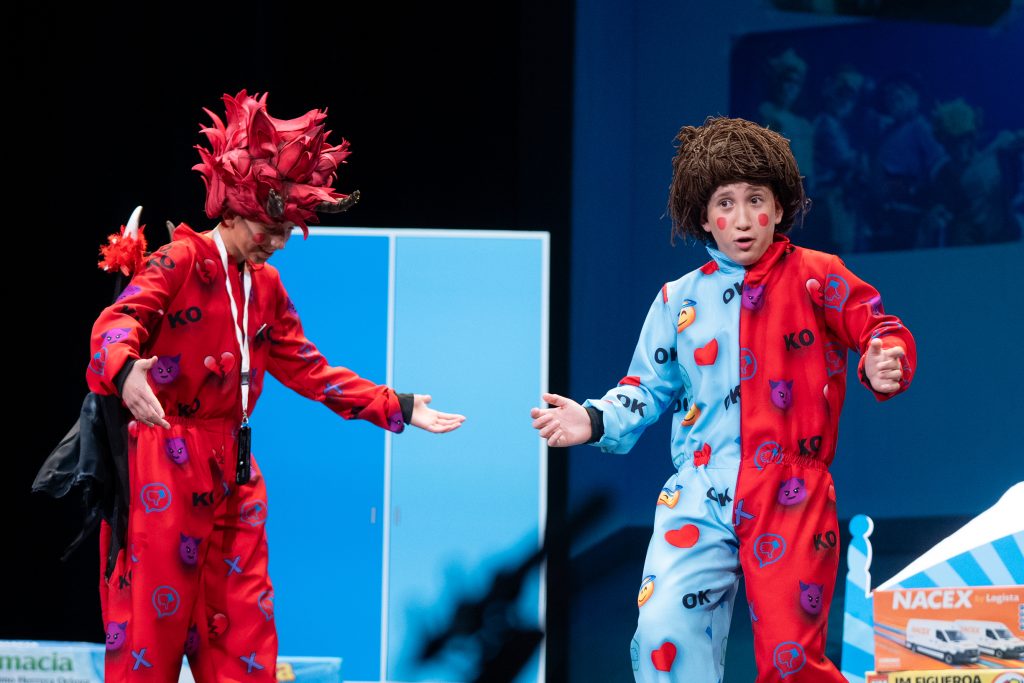 Los cuplés continuaron esa línea, apostando por ejemplos concretos y fácilmente reconocibles. El primero giró en torno al bochorno que sienten los hijos al ver a sus padres bailar en la barra libre, mientras que el segundo profundizó en el contraste entre lo que se critica y lo que se hace. Ambos remates reforzaron la idea central del repertorio, siempre desde la óptica del niño que observa y juzga, a su manera, el mundo que le rodea.