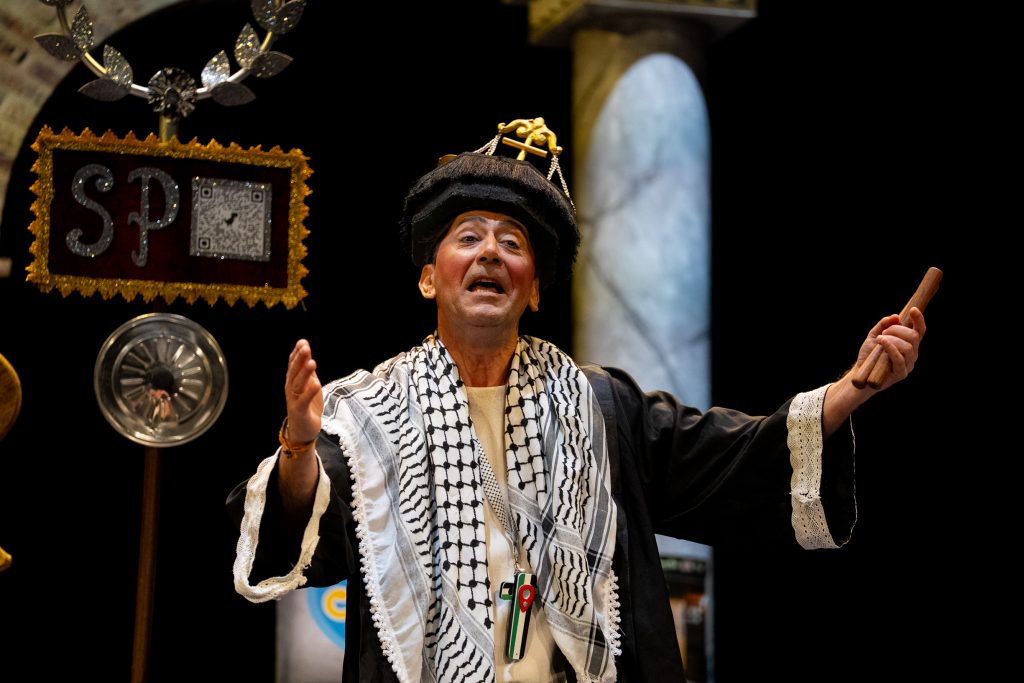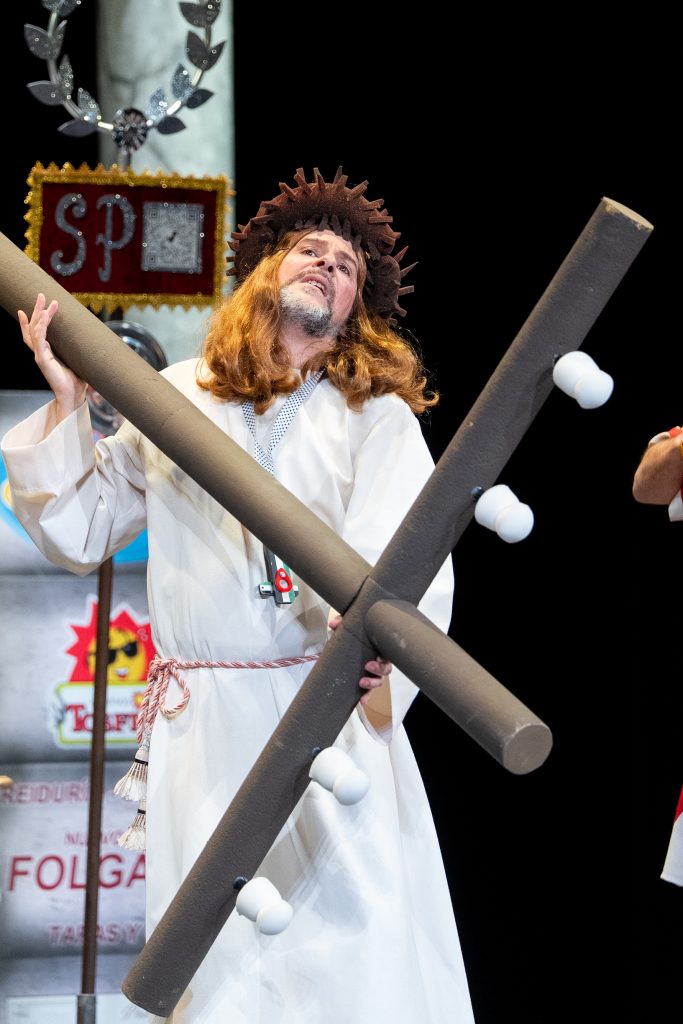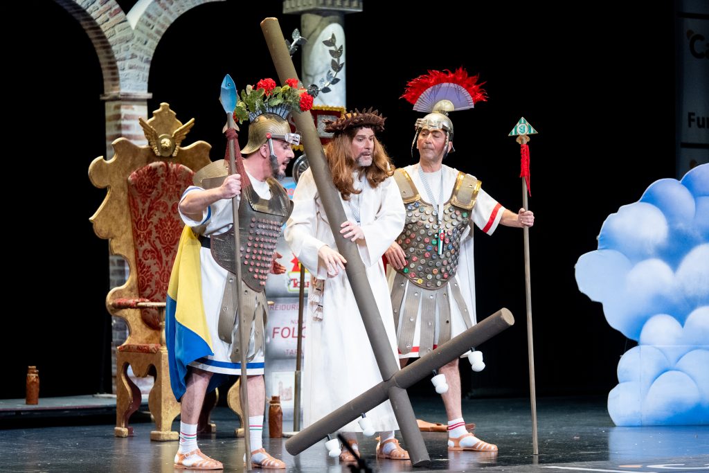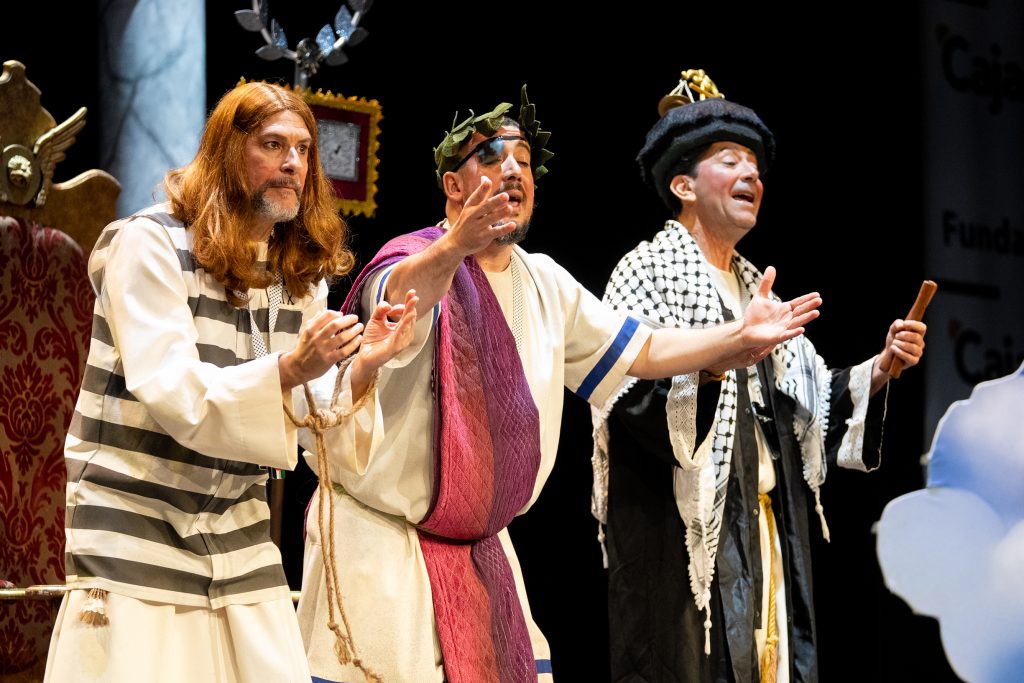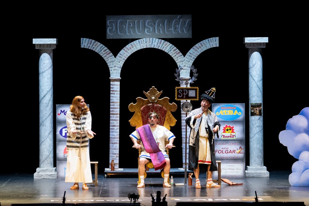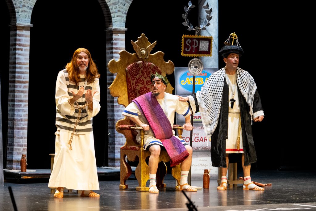 Uno de los momentos más destacados llega con la acusación del abogado cristiano, que convierte a Jesús en un personaje incómodo por su defensa de los pobres y su cuestionamiento del poder. La escena, lejos de buscar el golpe fácil, construye una sátira sostenida que provoca la risa desde la incomodidad y la reflexión. El veredicto popular, resuelto con la participación del público, refuerza ese juego metateatral tan propio de la modalidad y conecta directamente con el concurso como espacio de juicio y sentencia.