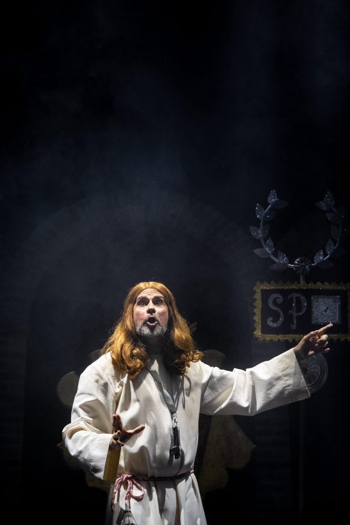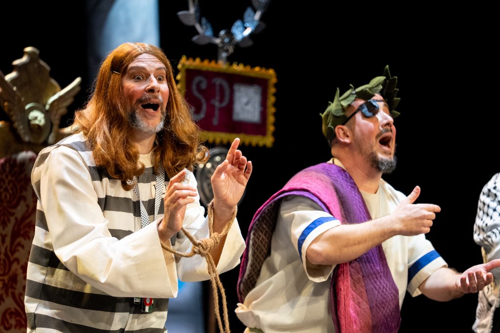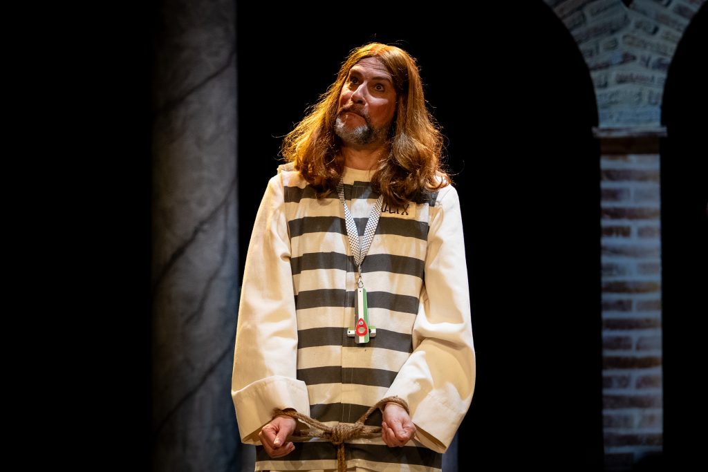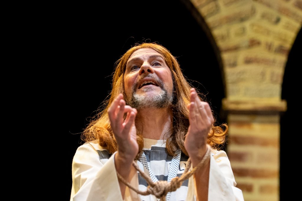 La propuesta mantiene como eje narrativo la figura de un Jesucristo contemporáneo, sometido a un proceso judicial que funciona como espejo deformante —pero reconocible— de la realidad política, judicial y social actual. Desde los primeros compases, el cuarteto deja claro que el juicio será “cortito”, introduciendo un ritmo ágil y un tono marcadamente irónico que sostiene buena parte del pase. El planteamiento escénico es sencillo y funcional, reforzando el peso del texto y la interpretación por encima de cualquier artificio visual.