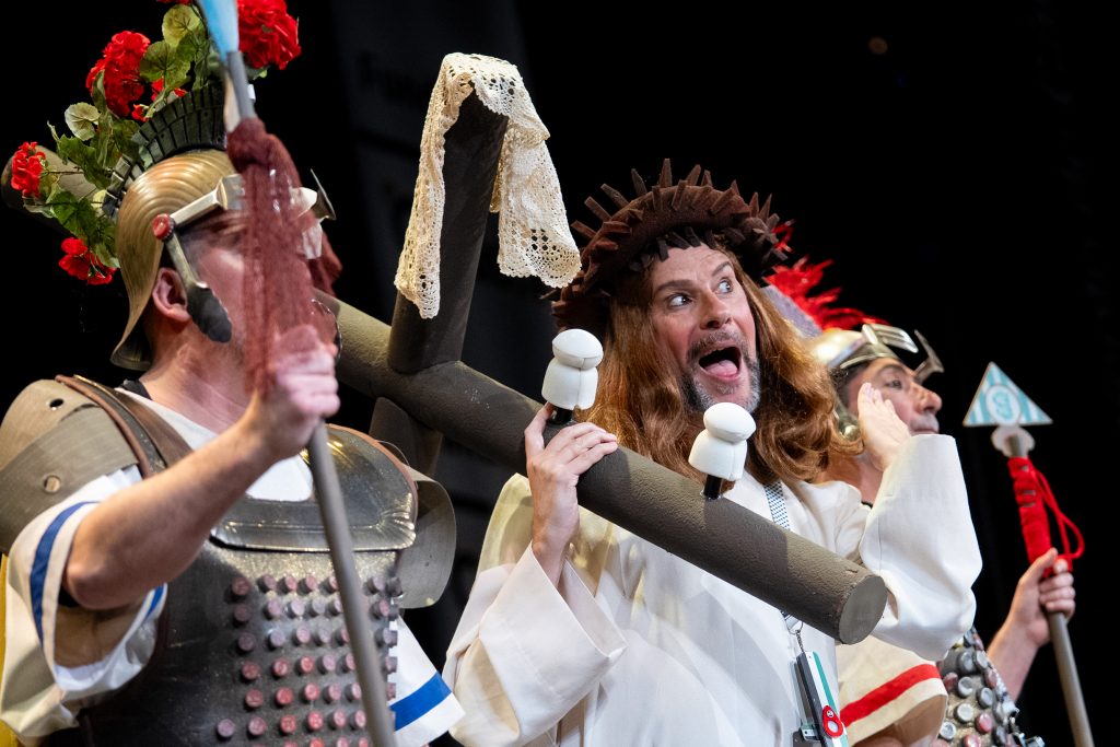 La agrupación gaditana continúa su particular relectura de la Pasión de Jesucristo en los cuartos del COAC 2026 con una parodia sólida, muy verbal y cargada de ironía política y religiosa en el Gran Teatro Falla