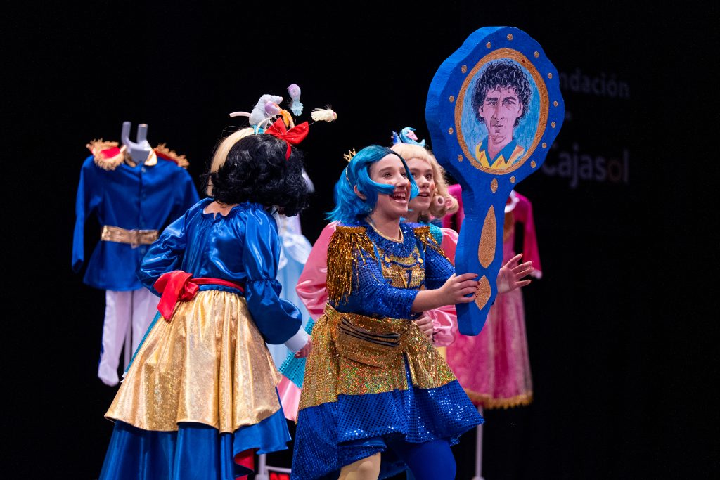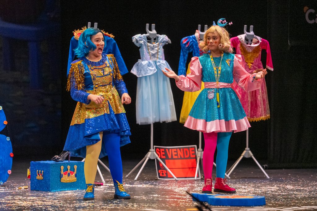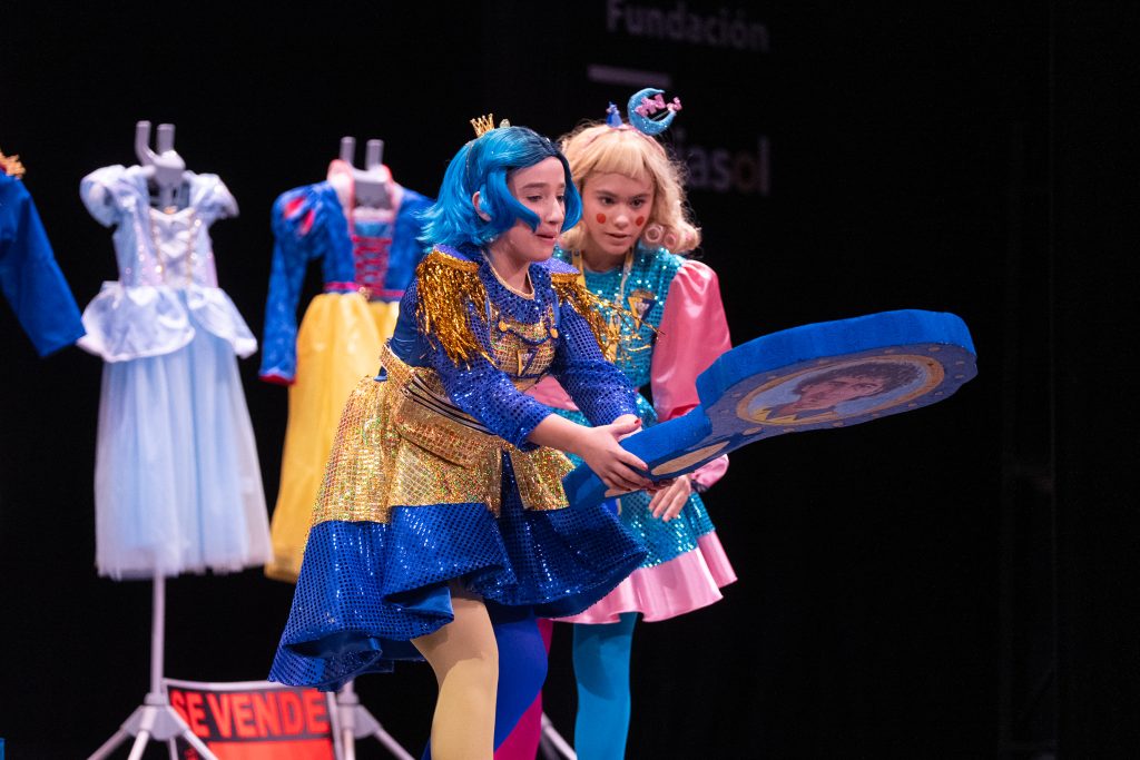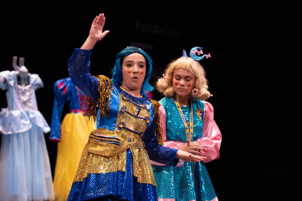 En el desarrollo de la escena aparecieron personajes como Cenicienta y Blancanieves, reescritas desde una mirada actual. Uno de los diálogos más celebrados fue el de la princesa que aseguraba necesitar “tai-chín” por el cansancio acumulado entre madrugón, clase y deberes, reflejando una lectura cotidiana del mundo escolar. La parodia también abordó el universo digital mediante la aparición de la “princesita del internet”, que defendía su rol de influencer ante otra que insistía en estudiar para tener un “futuro coherente”, contraponiendo ocio y responsabilidad sin moralina ni juicio duro.
