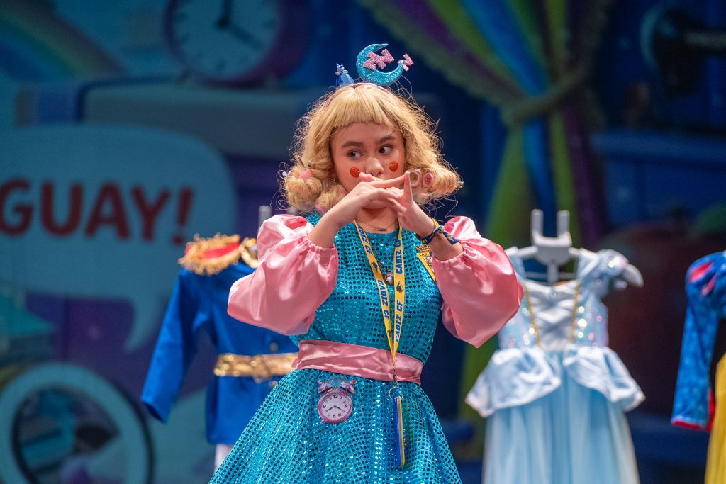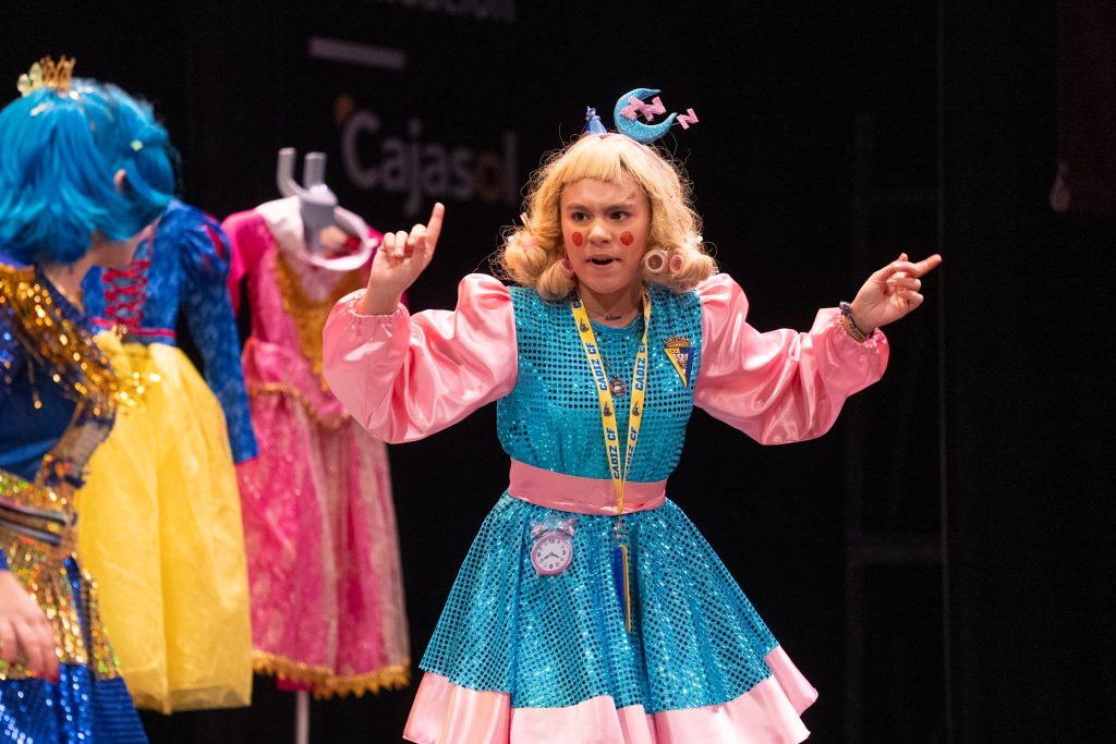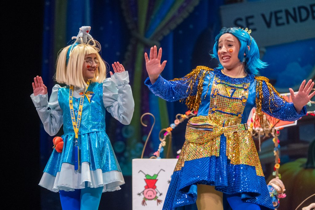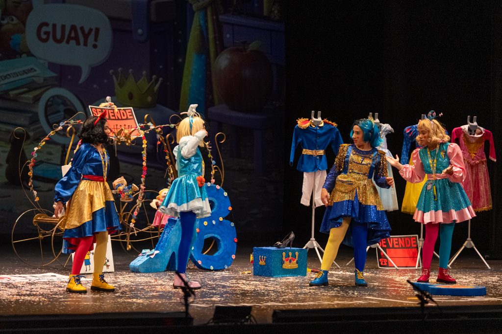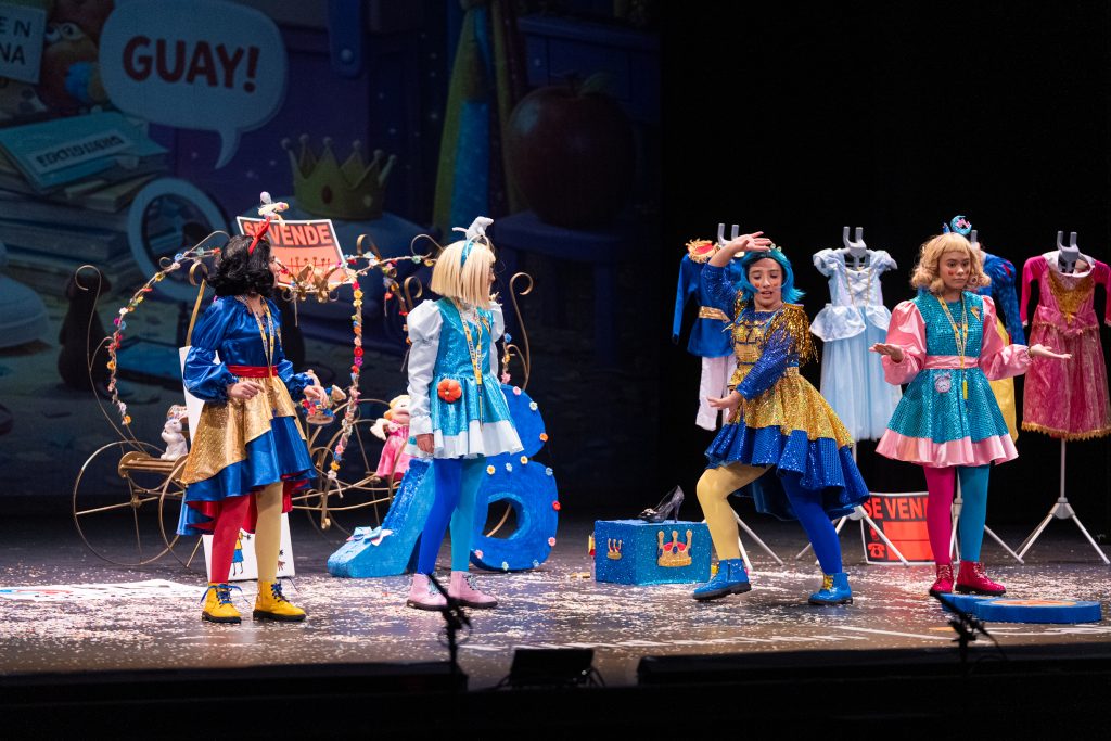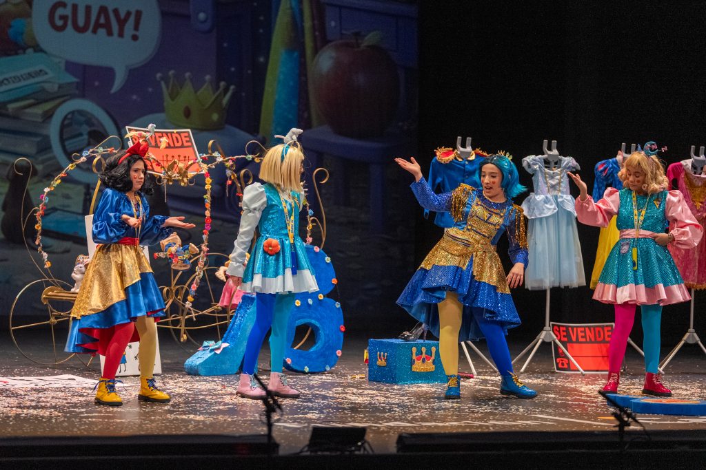 La parodia inicial reveló el punto de partida narrativo: las princesas viajan entre cuentos, se equivocan de época o de relato y descubren que la vida cotidiana implica madrugar, ir al colegio, estudiar y mantener el ritmo de actividades. Las situaciones se resolvieron con un humor limpio y apto para público familiar, basado en la exageración gestual, los equívocos y la sorpresa, recursos habituales del cuarteto infantil. El patio de butacas acompañó con atención y piropos, dentro del ambiente característico de la modalidad.