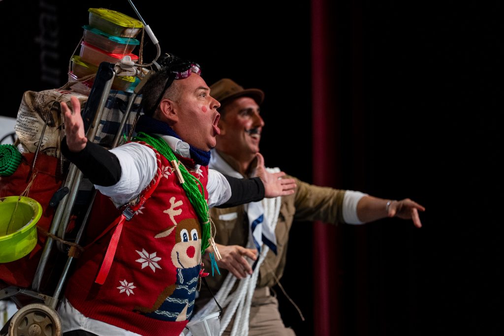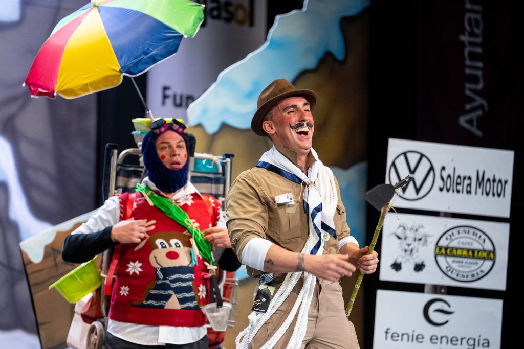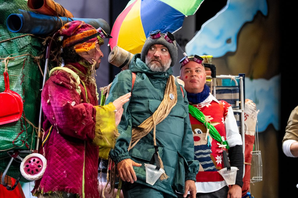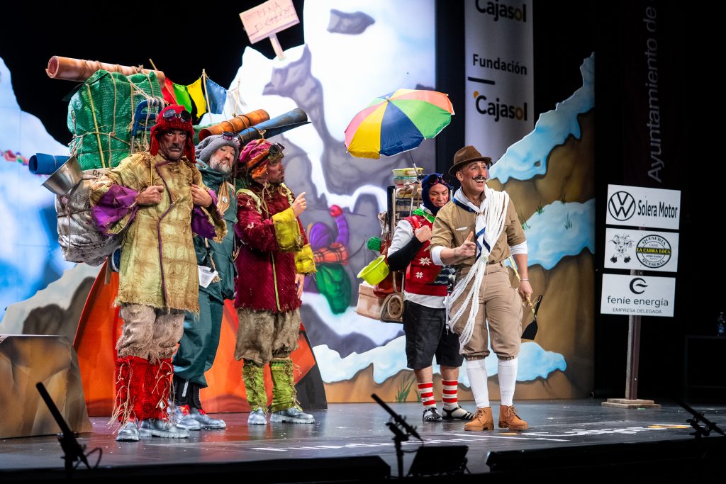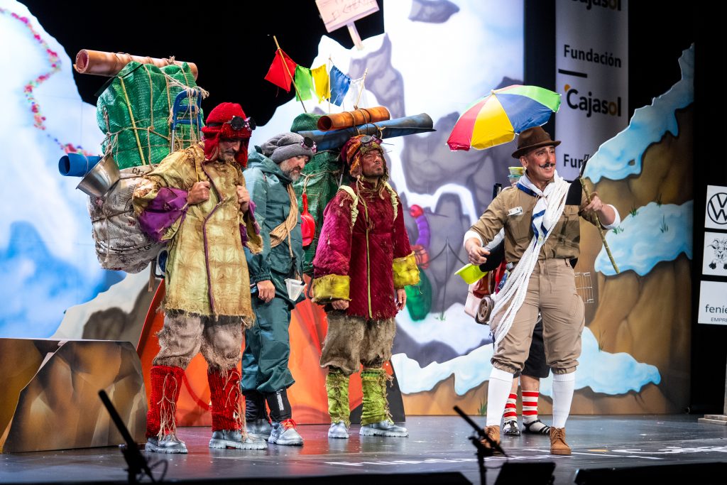 El humor se sostuvo en la construcción de personajes, en el ritmo de la réplica y en un uso eficaz del lenguaje coloquial gaditano, con referencias a la indumentaria, el frío, la alimentación y los protocolos de montaña. La doble lectura apareció con la frase “esto está masificado”, enunciada para el Everest pero vinculada inmediatamente a la percepción del concurso en los últimos años. El diálogo permitió al cuarteto introducir elementos de sátira cívica (“no hay quien suba el contenedor”, “ocho kilos de residuos para bajar por la puerta”), siempre desde el humor y sin perder el control de la escena.