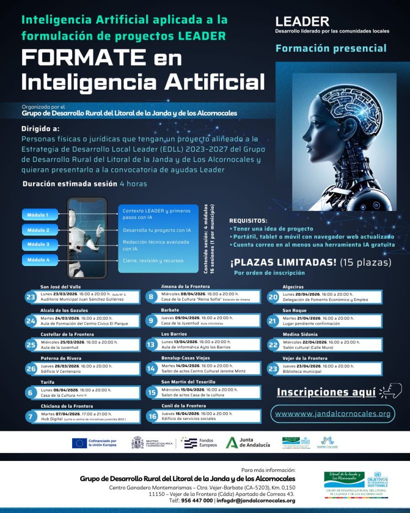 El Grupo de Desarrollo Rural (GDR) del Litoral de la Janda y de Los Alcornocales ha puesto en marcha un programa de formación en Inteligencia Artificial para proyectos LEADER dirigido a personas y entidades interesadas en concurrir a la próxima convocatoria de ayudas vinculadas a la Estrategia de Desarrollo Local Leader (EDLL) 2023–2027.