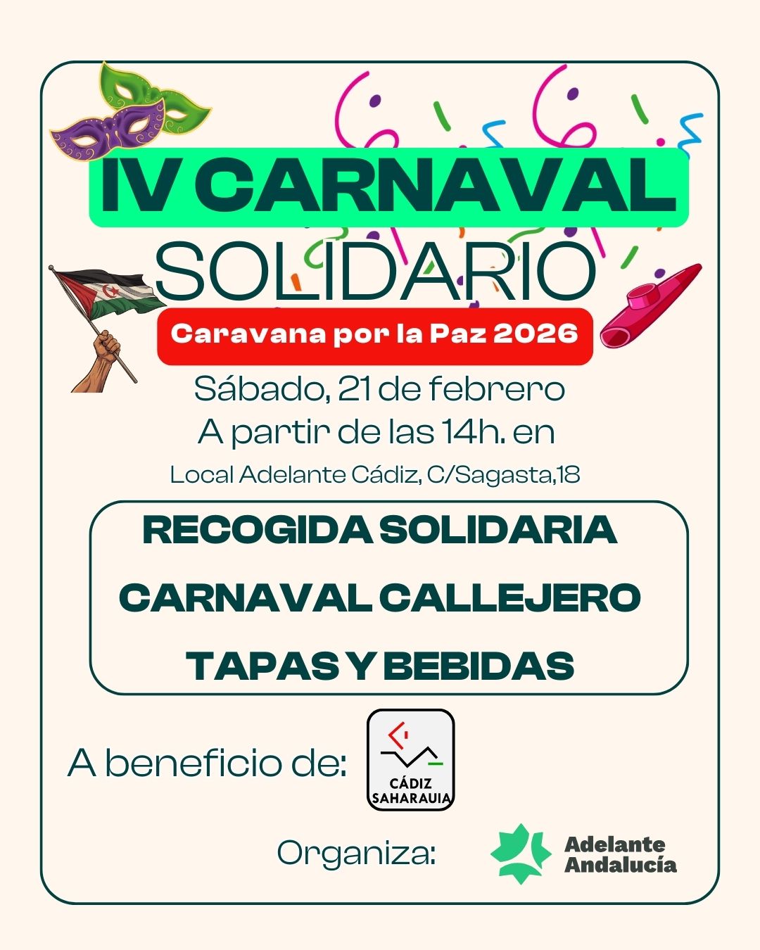El IV Carnaval Solidario en Cádiz se celebrará este sábado, 21 de febrero, a partir de las 14.00 horas en el local de Adelante Andalucía, situado en la calle Sagasta 18. El evento tiene como objetivo recaudar fondos y recoger materiales para la Caravana por la Paz que cada año coordina la Federación de Asociaciones de Cádiz Al Huriya en apoyo al pueblo saharaui.
