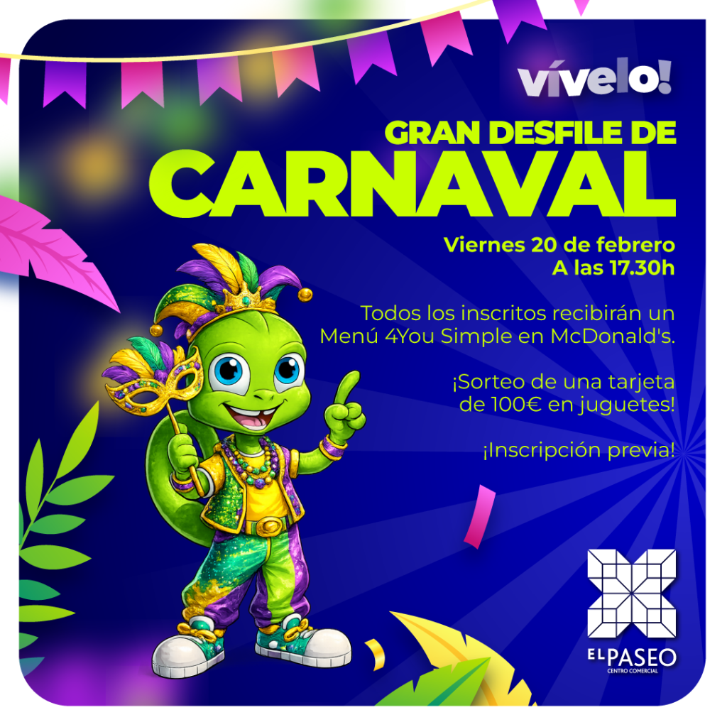 El centro comercial El Paseo, en El Puerto de Santa María, celebrará este viernes 20 de febrero un desfile de carnaval infantil en sus instalaciones. La actividad, prevista a partir de las 17:30 horas, está dirigida a niños y niñas que deseen participar con sus disfraces en una jornada organizada con motivo del Carnaval.