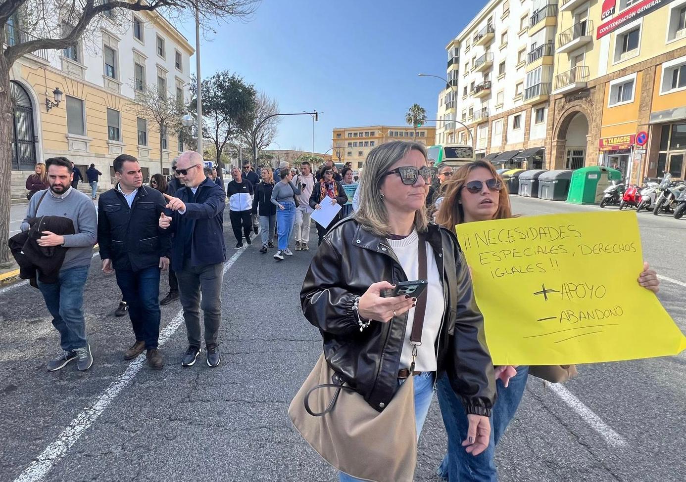 La protesta, celebrada en la capital gaditana, ha recorrido el trayecto entre Puertas de Tierra y la Delegación Territorial de Desarrollo Educativo y Formación Profesional. Padres y madres reclamaron más personal especializado y mayores medios para garantizar una atención adecuada a sus hijos e hijas en las aulas.