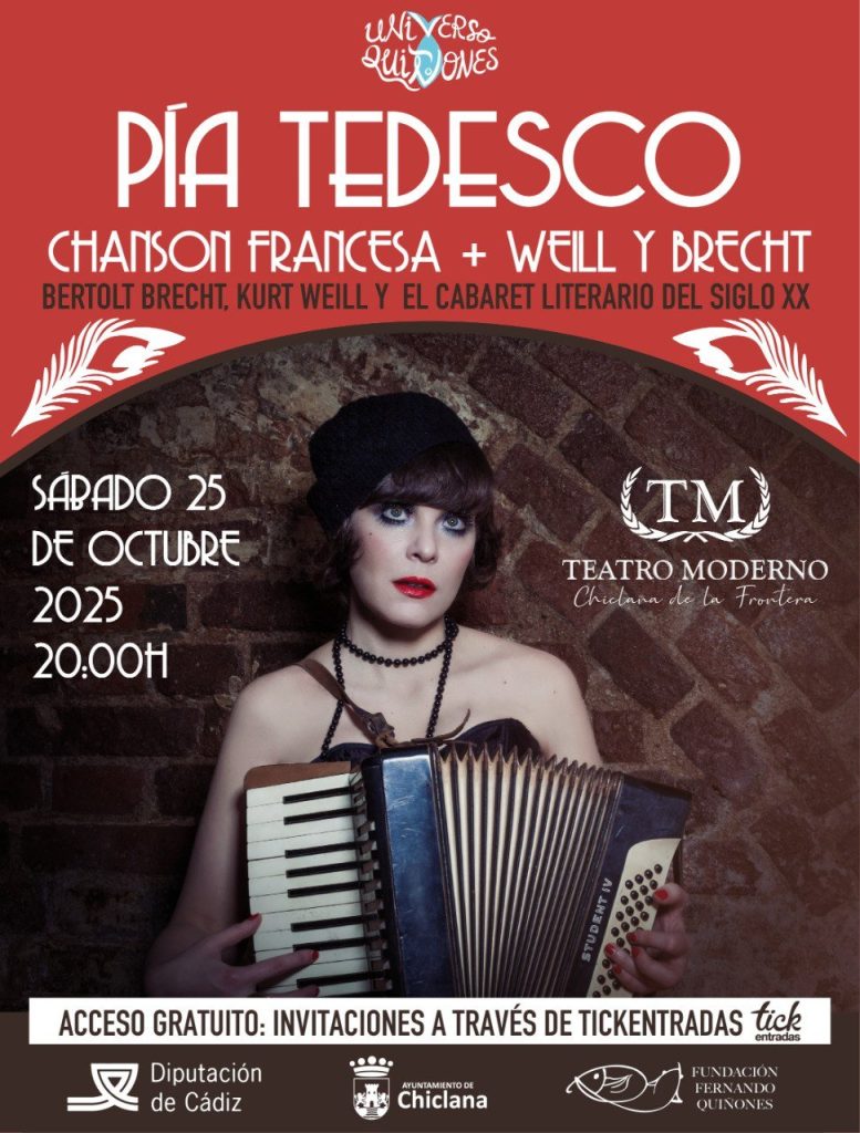 El Teatro Moderno de Chiclana se transformará este sábado 25 de octubre en un viaje musical al corazón de los cabarets europeos del siglo XX con el espectáculo protagonizado por la cantante, actriz y compositora argentina Pía Tedesco. La artista presentará una propuesta escénica basada en la Chanson Francesa y en el legado literario y musical de Bertolt Brecht y Kurt Weill, dos figuras esenciales en la historia del teatro político y la música del siglo pasado. La cita será a las 20:00 horas con entrada gratuita, previa reserva de invitaciones a través de la plataforma www.tickentradas.com.