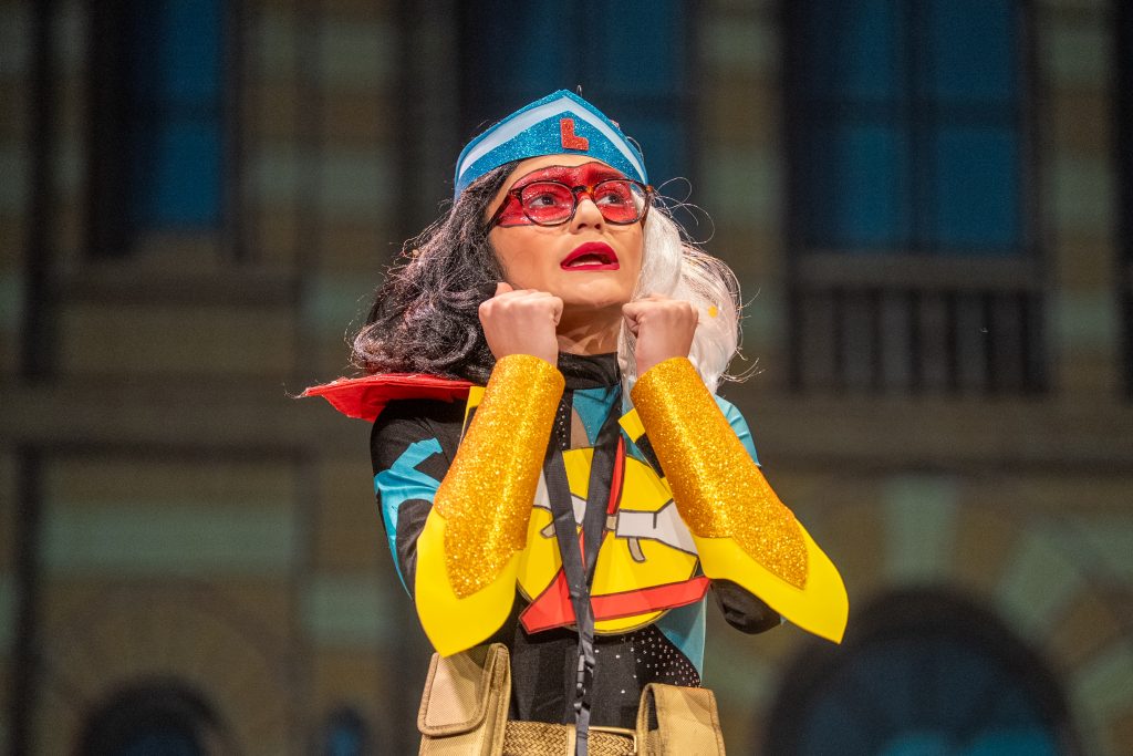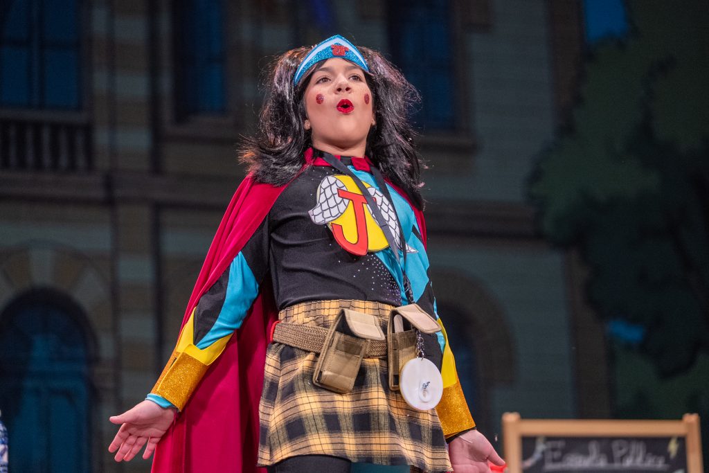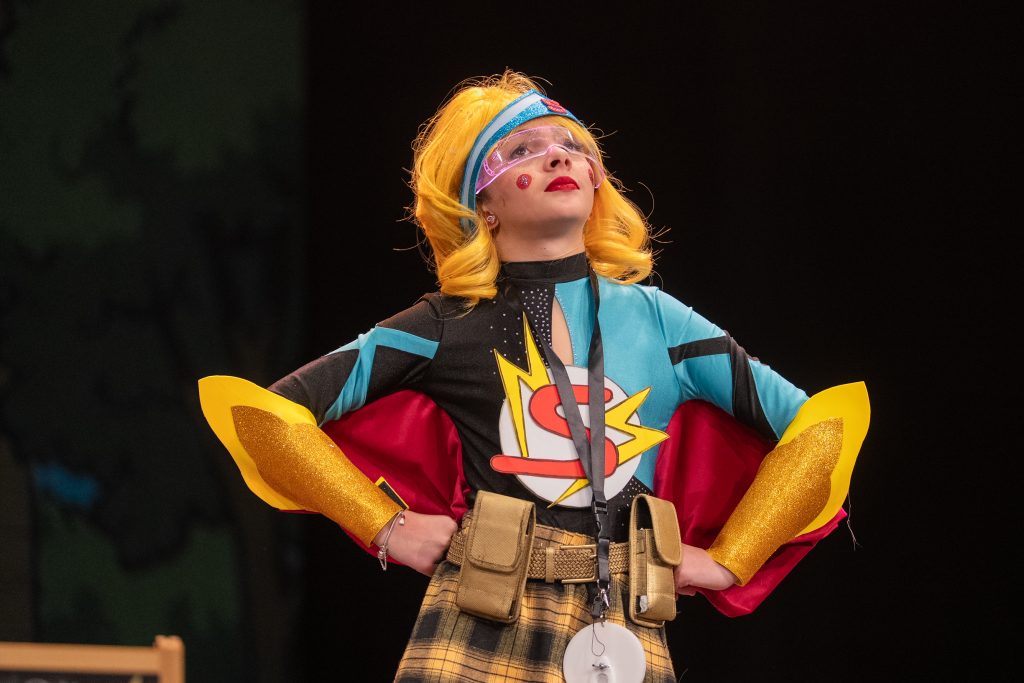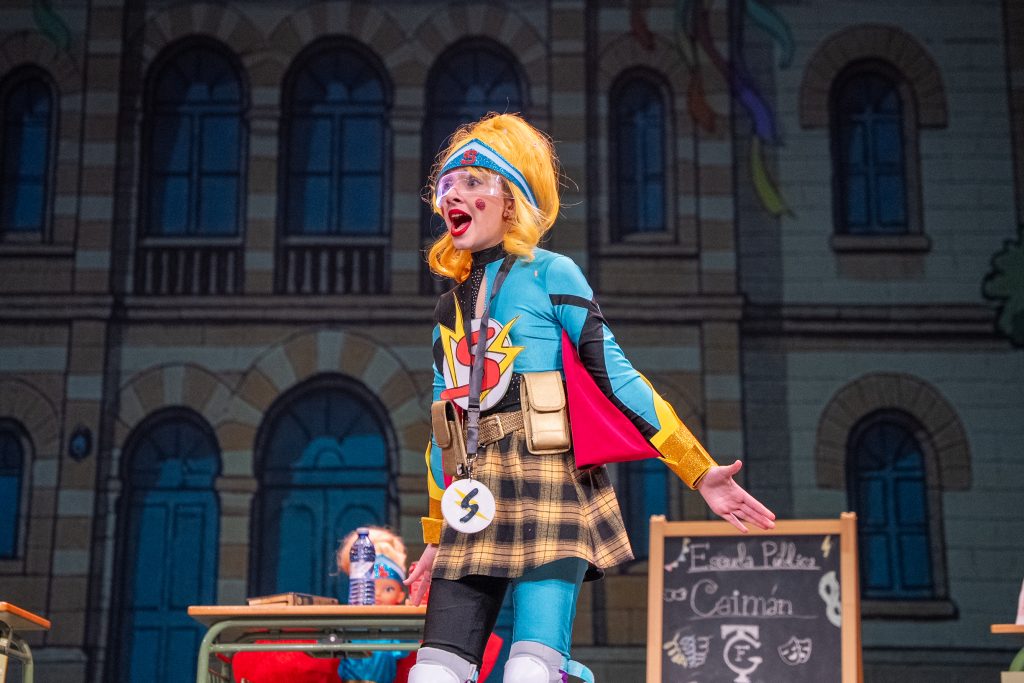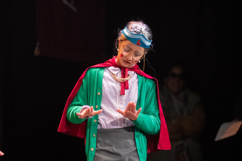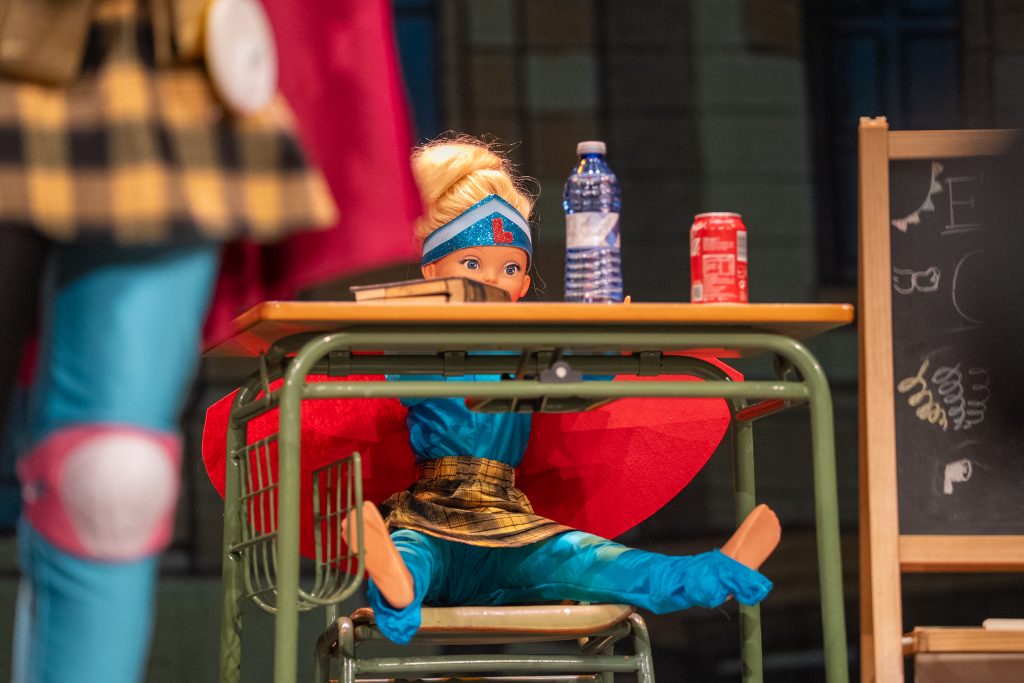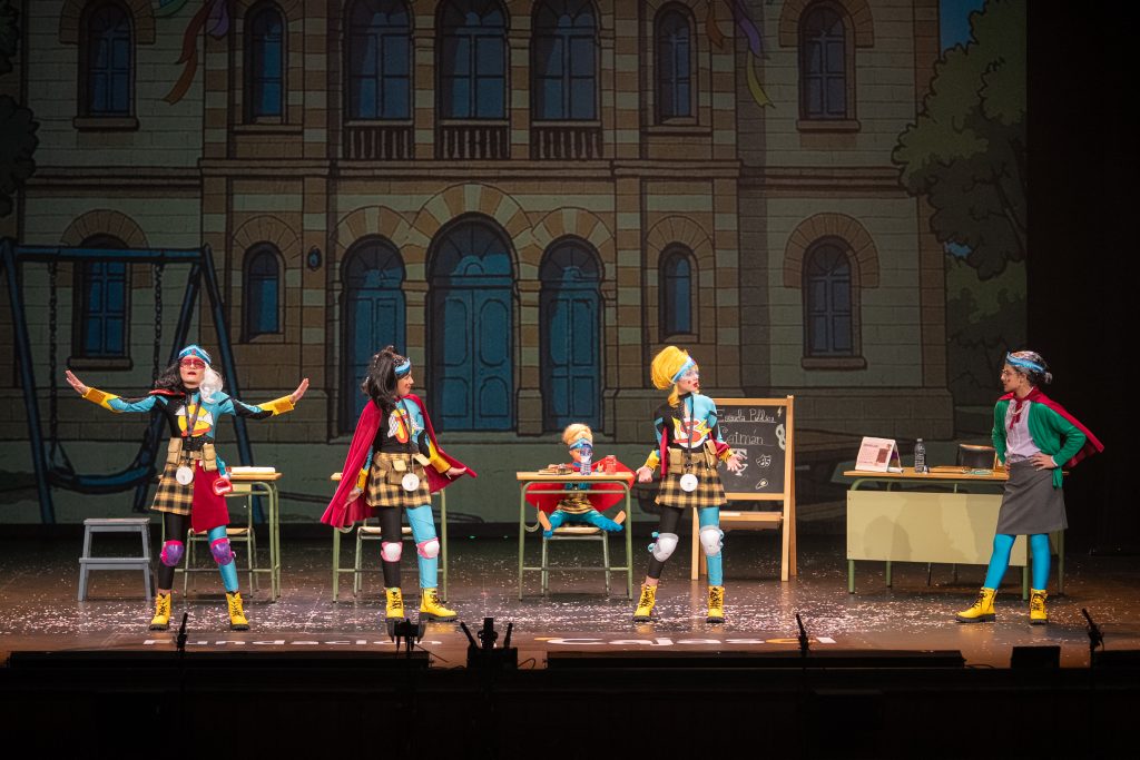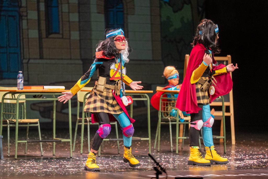La segunda mitad del repertorio se centró en la dinámica de la “Escuela de Superpoderes”, donde cada alumna explica su capacidad y la dificultad emocional que arrastra. Una de las niñas puede volar, otra hacerse invisible y otra mover objetos con la mente, pero todas comparten un componente vulnerabilizador que obliga a gestionar sociabilidad, miedo o inseguridad. La propuesta teatral utilizó la fórmula del examen o evaluación final como mecanismo para estructurar la escena.