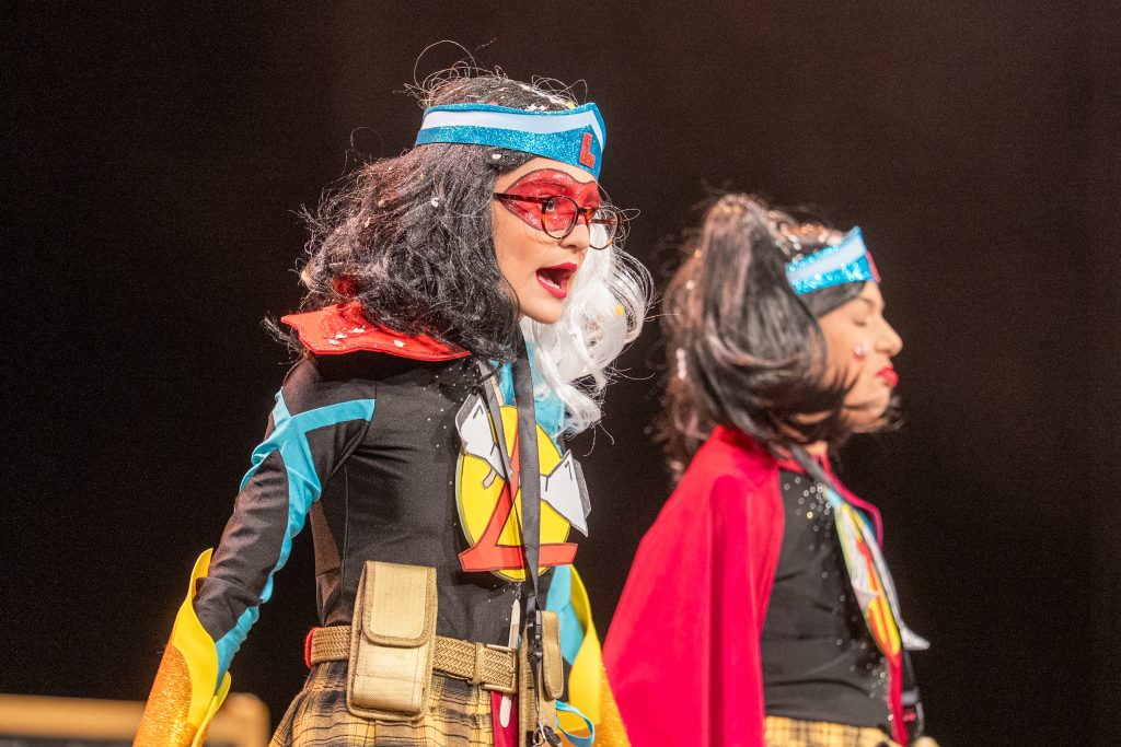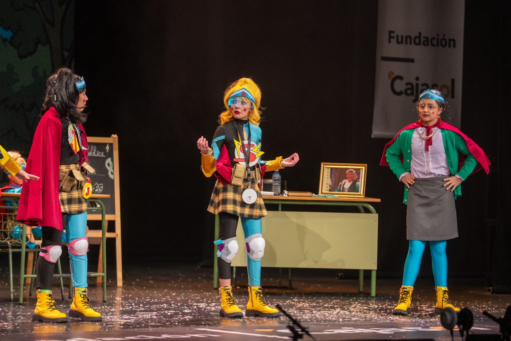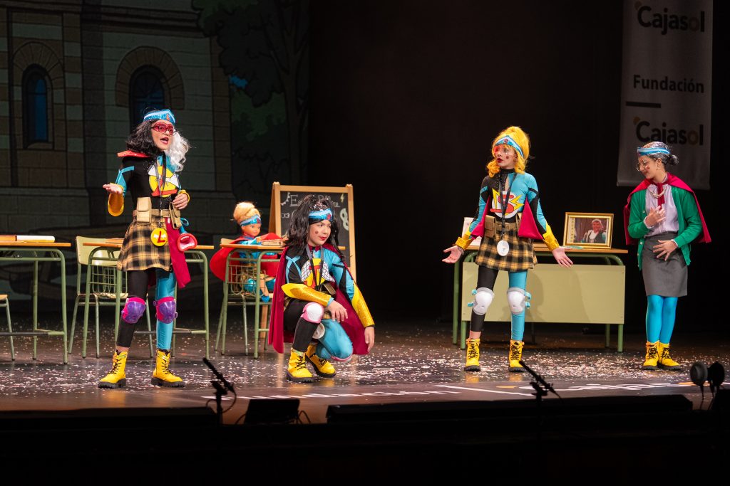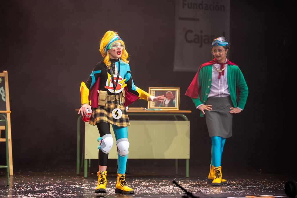 El telón descubrió un aula de diseño fantástico donde un grupo de superheroínas menores asiste a clase para aprender a controlar sus poderes. El punto de partida narrativo se expuso en la propia presentación: una “lluvia eléctrica” irrumpe en la playa de la Caleta y transforma a tres niñas aparentemente normales en heroínas con capacidades especiales. La puesta en escena articuló el discurso desde el humor, con guiños locales, lenguaje coloquial y un trabajo corporal bien dirigido.
