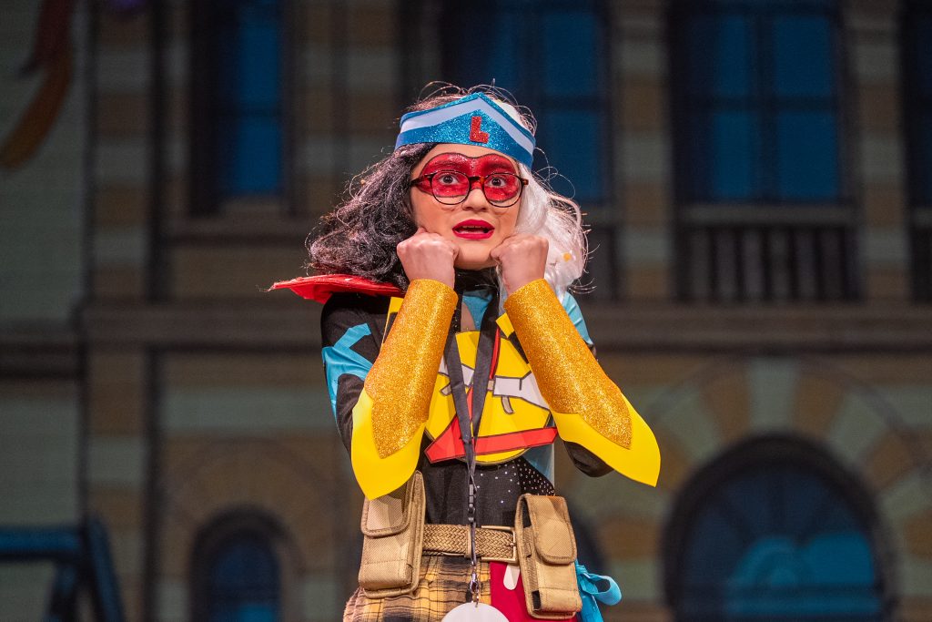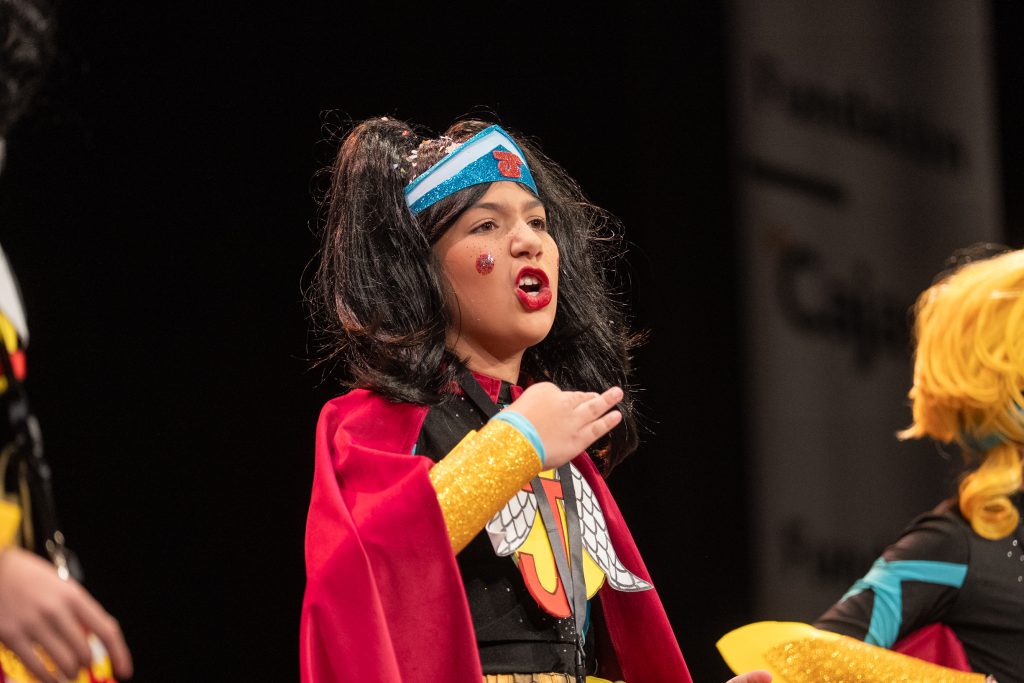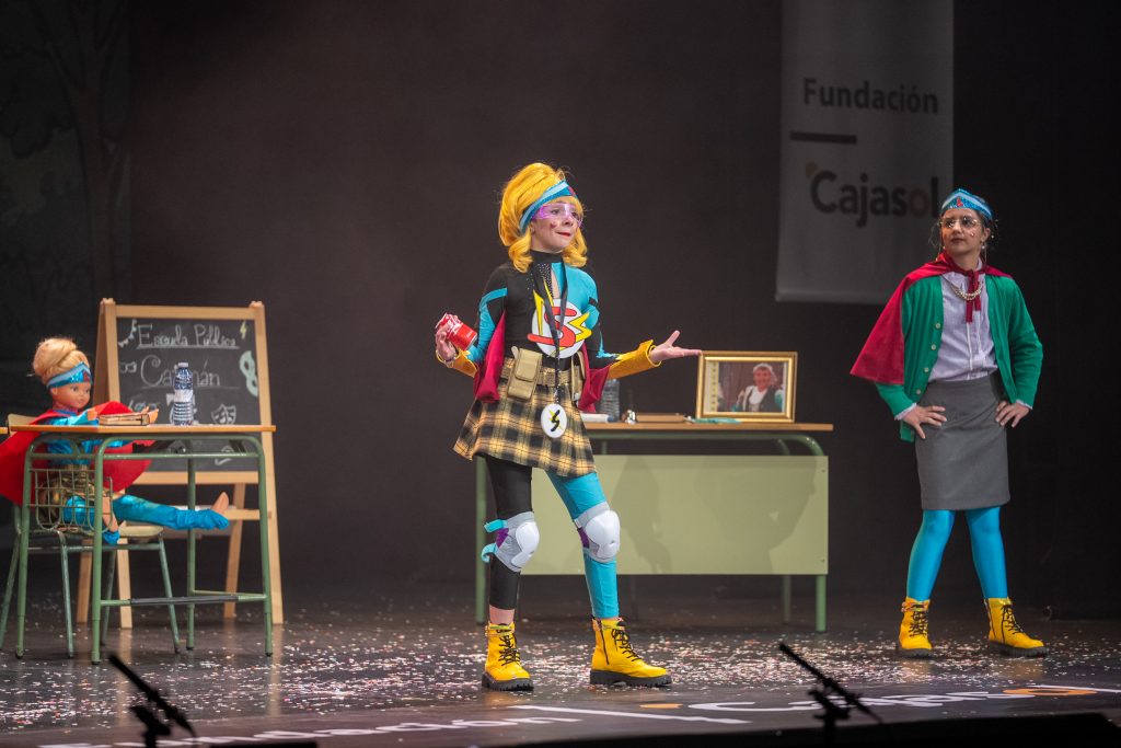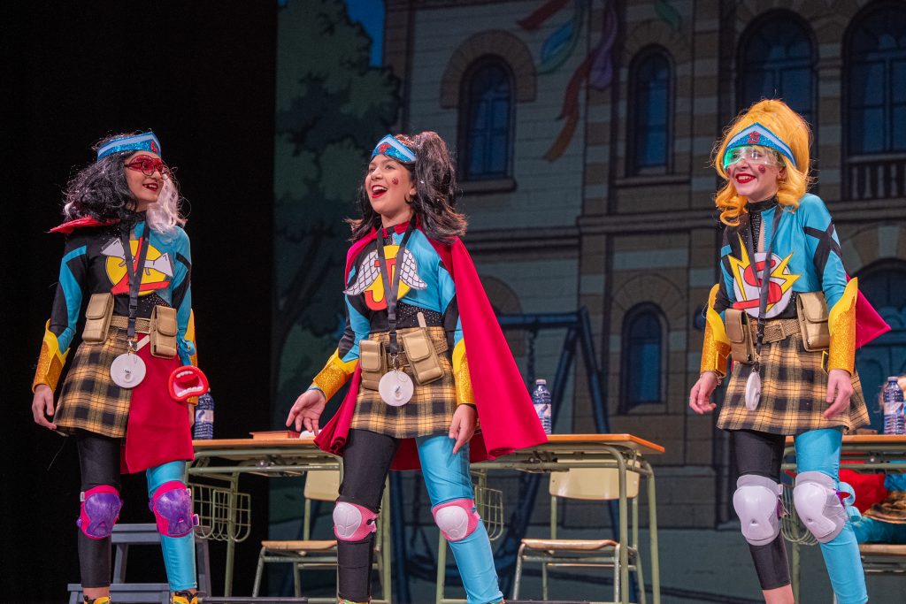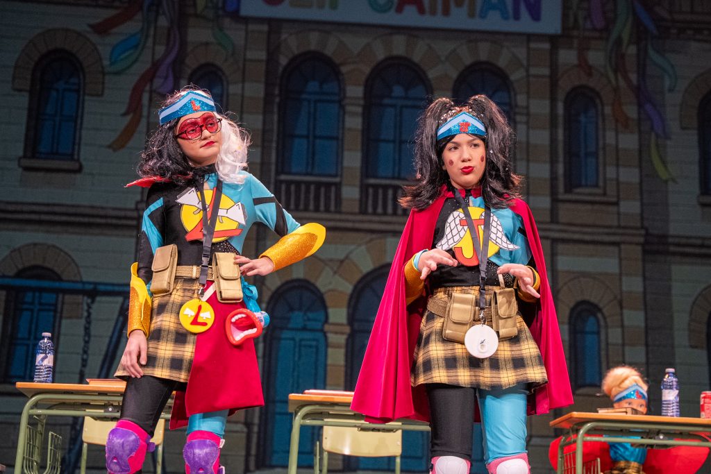El telón descubrió un aula de diseño fantástico donde un grupo de superheroínas menores asiste a clase para aprender a controlar sus poderes. El punto de partida narrativo se expuso en la propia presentación: una “lluvia eléctrica” irrumpe en la playa de la Caleta y transforma a tres niñas aparentemente normales en heroínas con capacidades especiales. La puesta en escena articuló el discurso desde el humor, con guiños locales, lenguaje coloquial y un trabajo corporal bien dirigido.