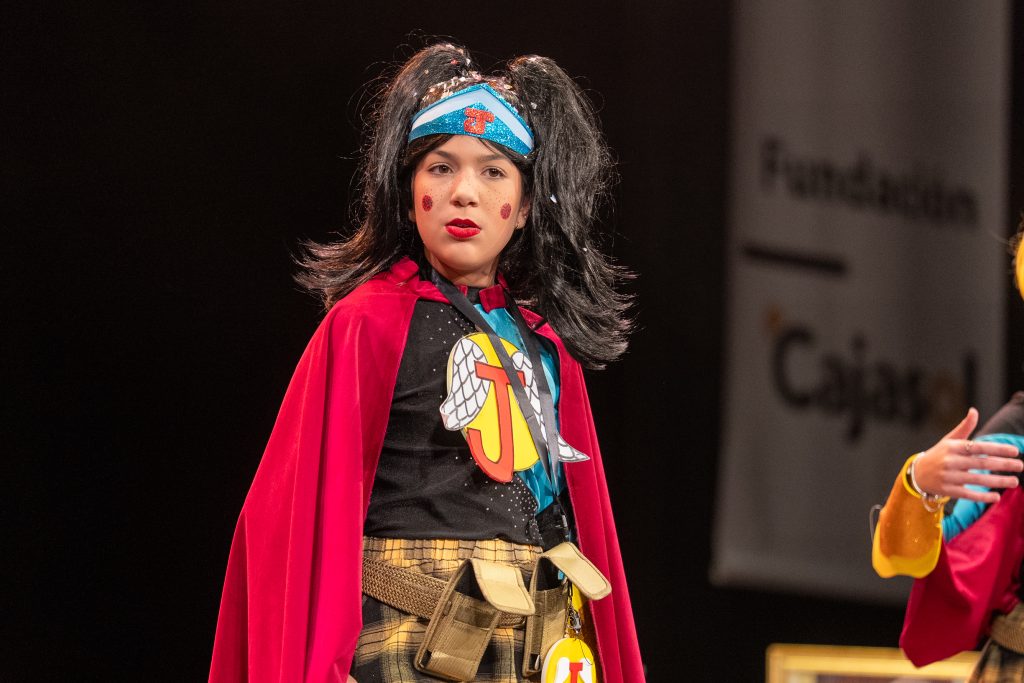 Los disfraces recrearon un universo infantil de superpoderes sin referencias bélicas ni armamento, optando por capas coloridas, gafas de plástico, accesorios textiles y elementos simbólicos. La estética evitó la imitación literal de marcas audiovisuales y se resolvió en códigos propios del carnaval infantil gaditano.
