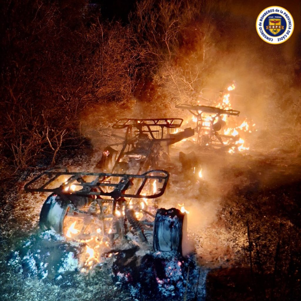 Según el CBPC, el fuego consumió por completo los dos quads, mientras que la vegetación afectada quedó reducida a una franja de pasto de aproximadamente 400 m², sin que se registraran personas heridas ni daños a inmuebles cercanos.