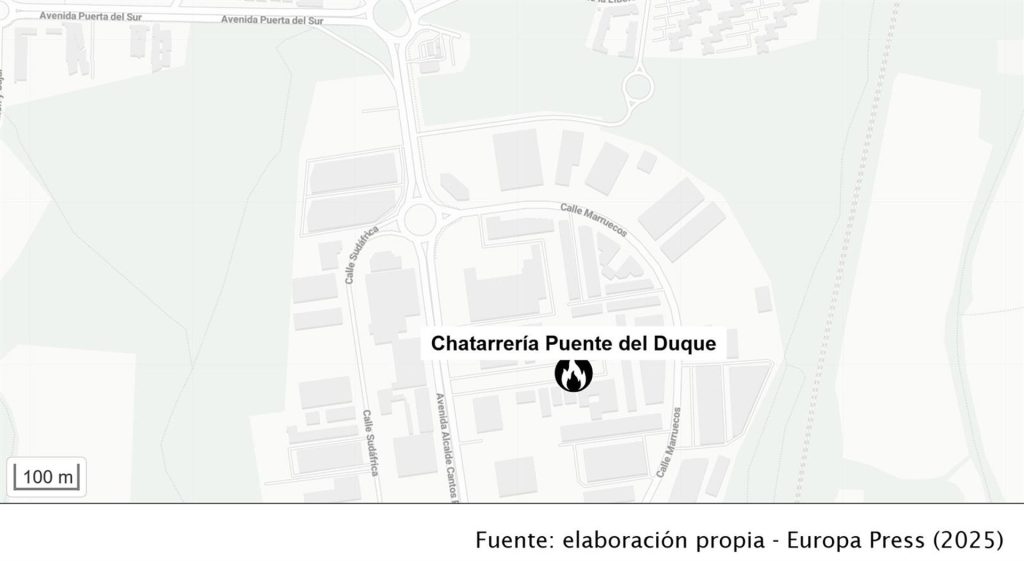 El incendio afecta principalmente a material exterior y neumáticos de la chatarrería situada en el Puente del Duque. Aunque el fuego se encuentra confinado a una zona concreta, se ha procedido a desalojar algunas naves próximas por precaución y ante la posible toxicidad del humo.