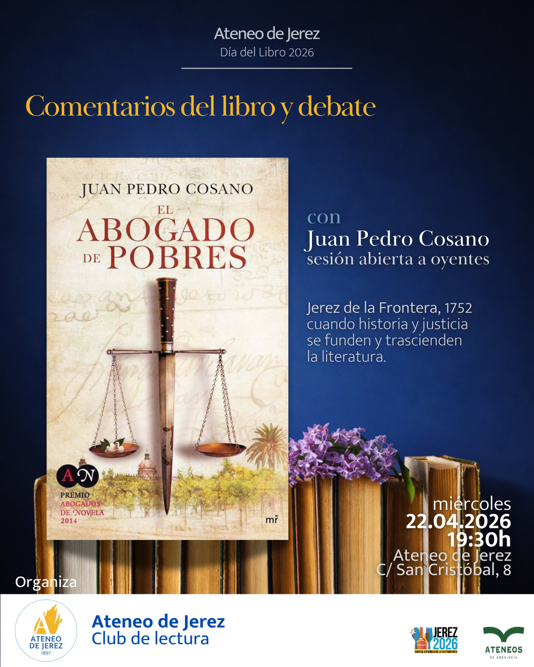 El escritor y abogado jerezano Juan Pedro Cosano participará este miércoles, 22 de abril, en una sesión abierta del club de lectura del Ateneo de Jerez dedicada al análisis de su novela *El abogado de pobres*. El encuentro se celebrará a las 19:30 horas en la sede de la entidad, situada en la calle San Cristóbal número 8, con entrada libre hasta completar aforo.
