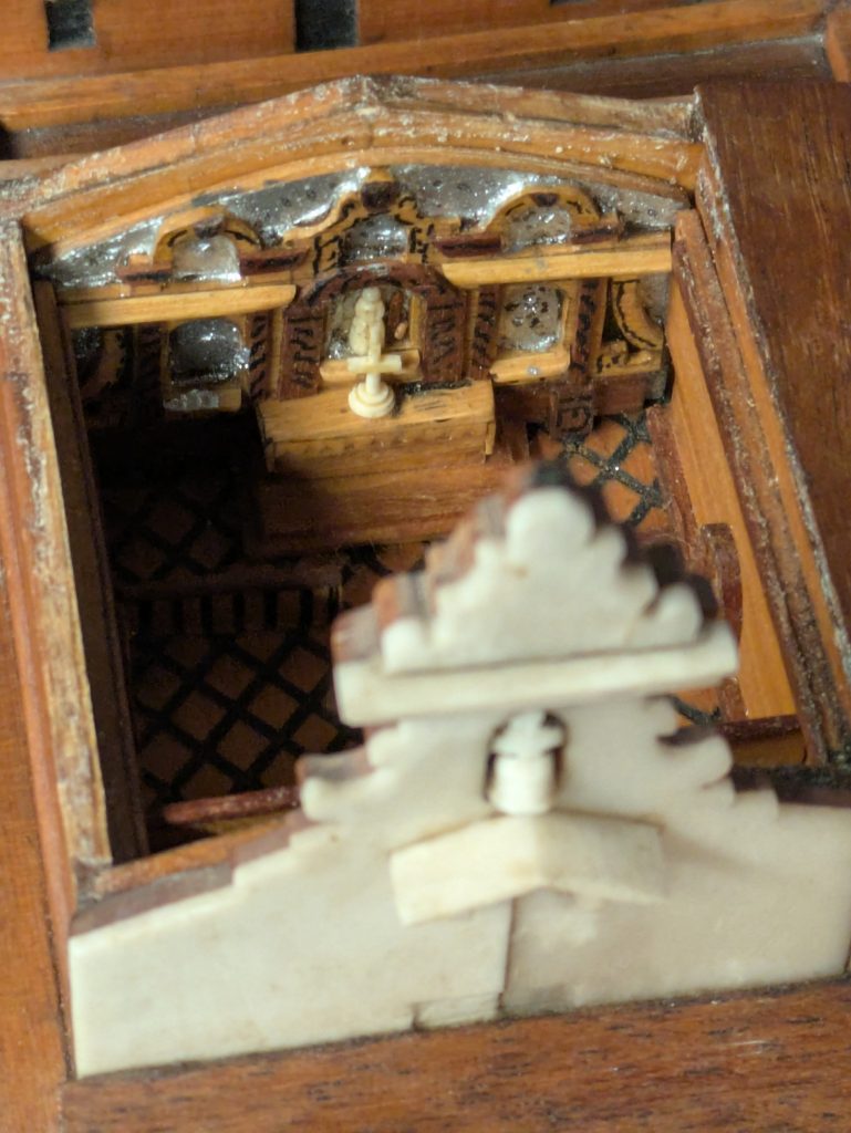 La capilla conserva un retablo en plata finamente trabajado, dividido en varias calles, y una figura central de Santa Catalina elaborada en marfil y hueso, acompañada de columnas salomónicas que enmarcan la imagen. Además, se aprecian una pila bautismal y un suelo en damero, elementos característicos de otras partes de la maqueta. El módulo del Castillo de Santa Catalina, que alberga esta capilla, presenta unas dimensiones de 46,5 x 58,5 x 11,5 centímetros.