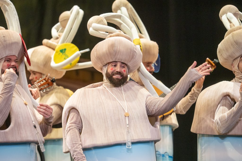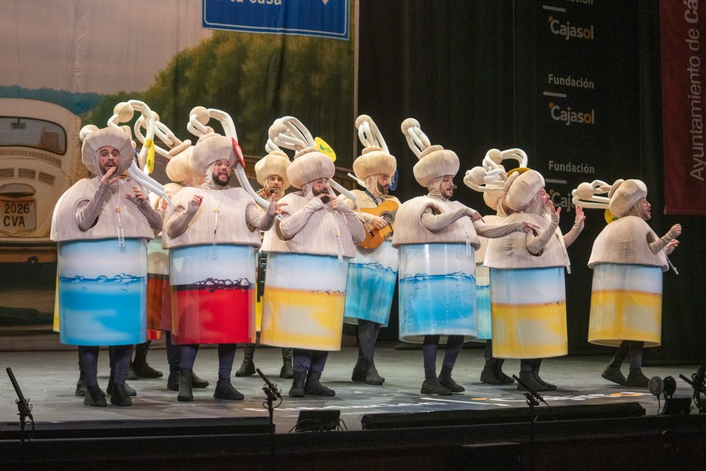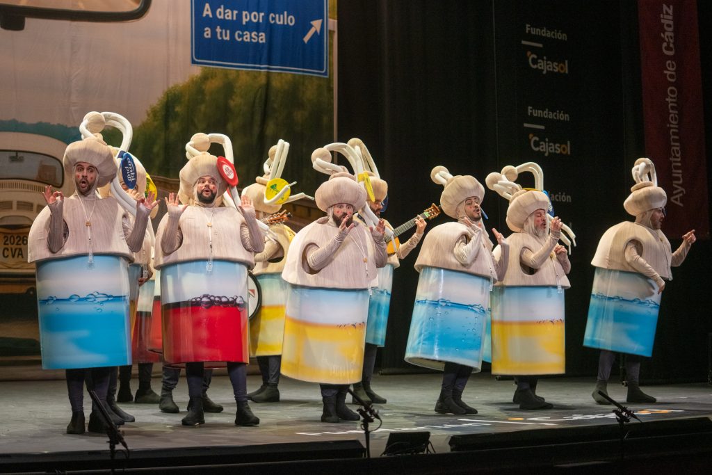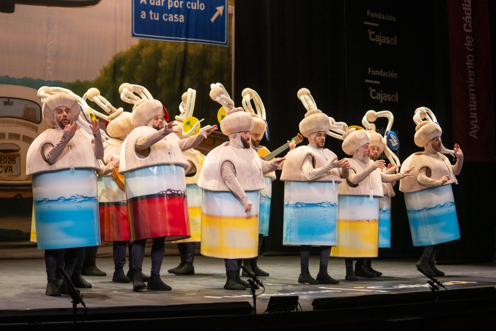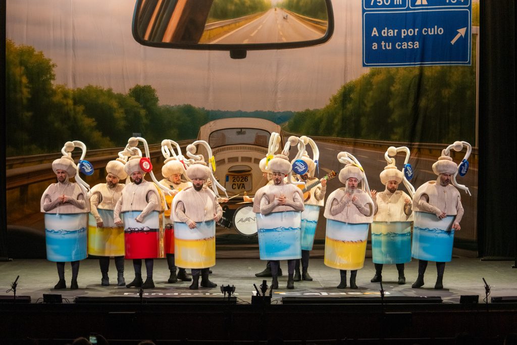 El primer pasodoble fue autorreferencial. El texto recordó la aventura del grupo el pasado año, la sorpresa del pase a cuartos y la ilusión de volver al teatro con un tipo improbable. La letra combinó cariño hacia Cádiz con un guiño de autocelebración por “hacer su Carnaval a su manera”. Funcional para preliminares, pero sin vuelo humorístico ni giro literario. El segundo pasodoble abordó el trastorno del espectro autista desde la anécdota en las atracciones de feria hasta llegar a las denominadas “horas sin ruido” en supermercados y ferias. La intención fue sensible y bienintencionada, aunque el enfoque resultó extraño en integración: el desarrollo narrativo llegó tarde y el remate se asentó más en la explicación que en el ingenio.