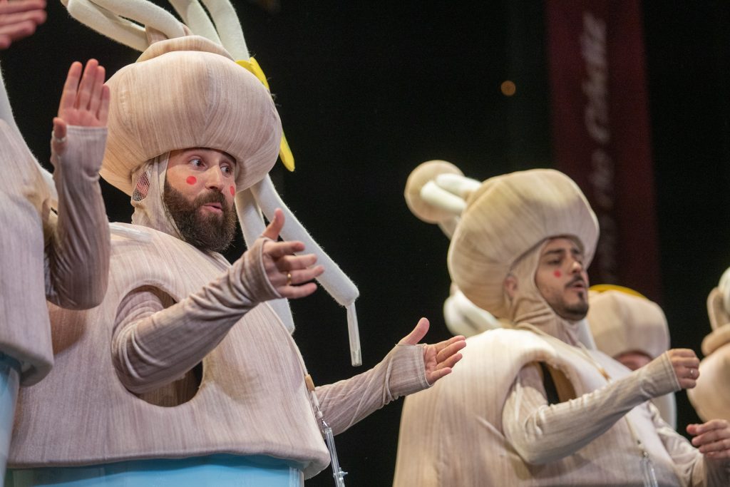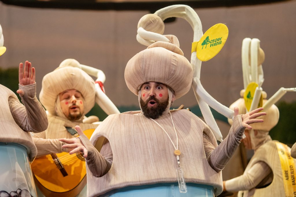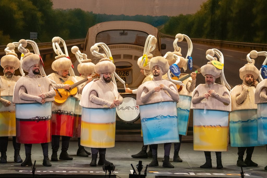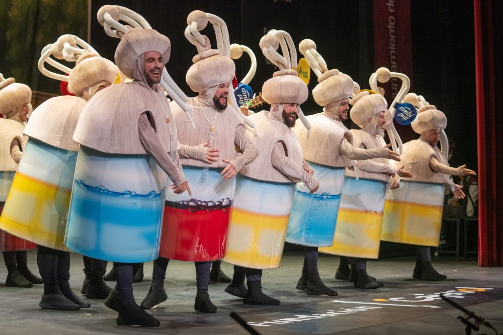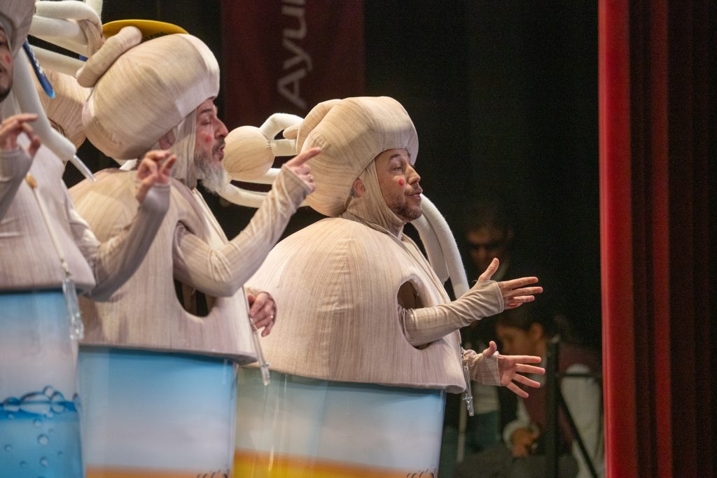 La tanda de cuplés quedó por debajo de lo exigible en la modalidad. El primero giró sobre un bebé de siete kilos para terminar alquilando la placenta como toldo para celebraciones; el segundo ironizó sobre la subida del precio de los huevos hasta derivar en contrabando de tortillas. Ambos funcionaron en registro de disparate, pero sin remate eficaz y con un humor al que le faltó precisión y tempo. El estribillo tampoco ayudó: correcto, pero nada memorable y sin capacidad de arranque coral en sala.