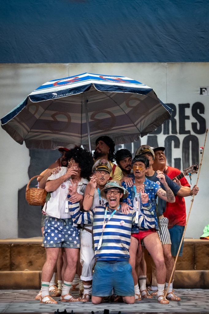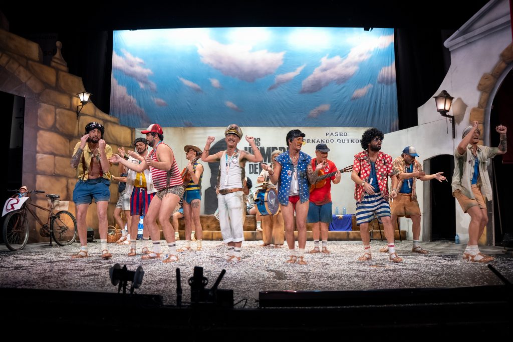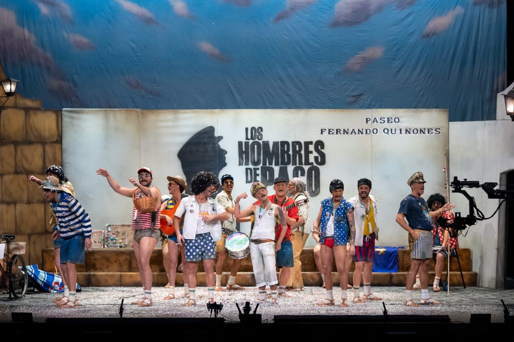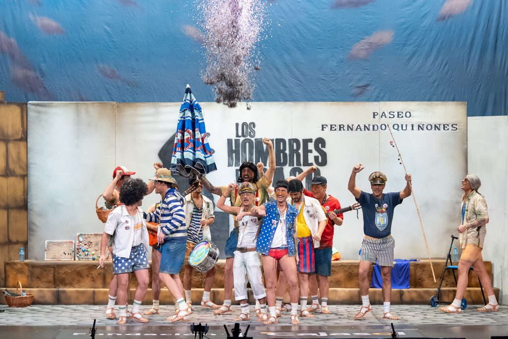 El tipo, caleteros curtidos a base de temporales y trabajo diario, vuelve a ser uno de los grandes aciertos del repertorio. Es un personaje muy gaditano, fácilmente identificable por el público del Falla y bien explotado desde la presentación hasta el popurrí. La entrada en escena arranca con un golpe de actualidad, utilizando la referencia a Sónsoles Ónega y su ya conocida confusión geográfica para situar rápidamente el tono humorístico del pase. El arranque funciona por ritmo y por intención, reforzado por un shoniquete reconocible que actúa como carta de presentación.