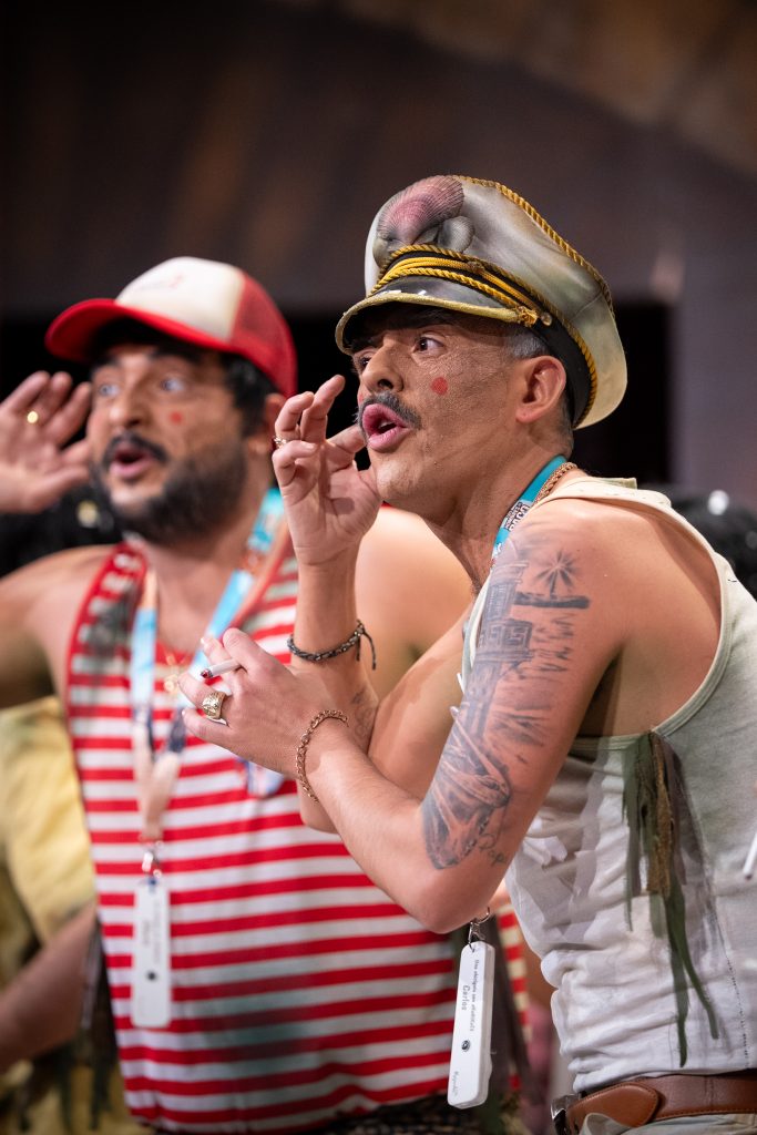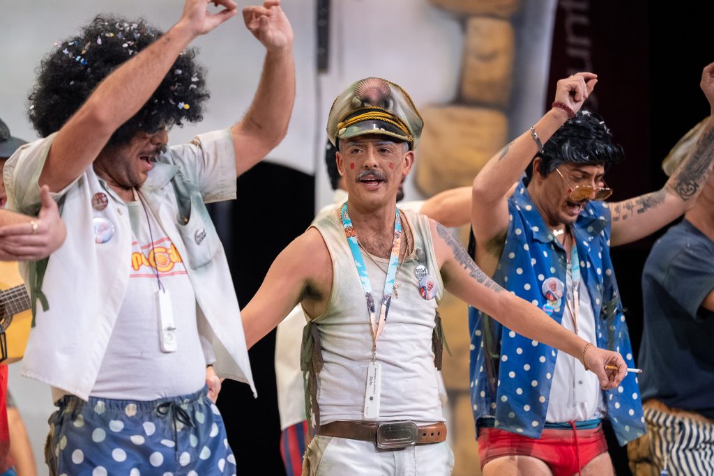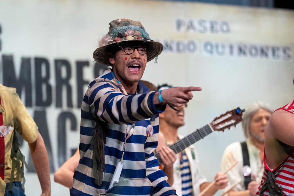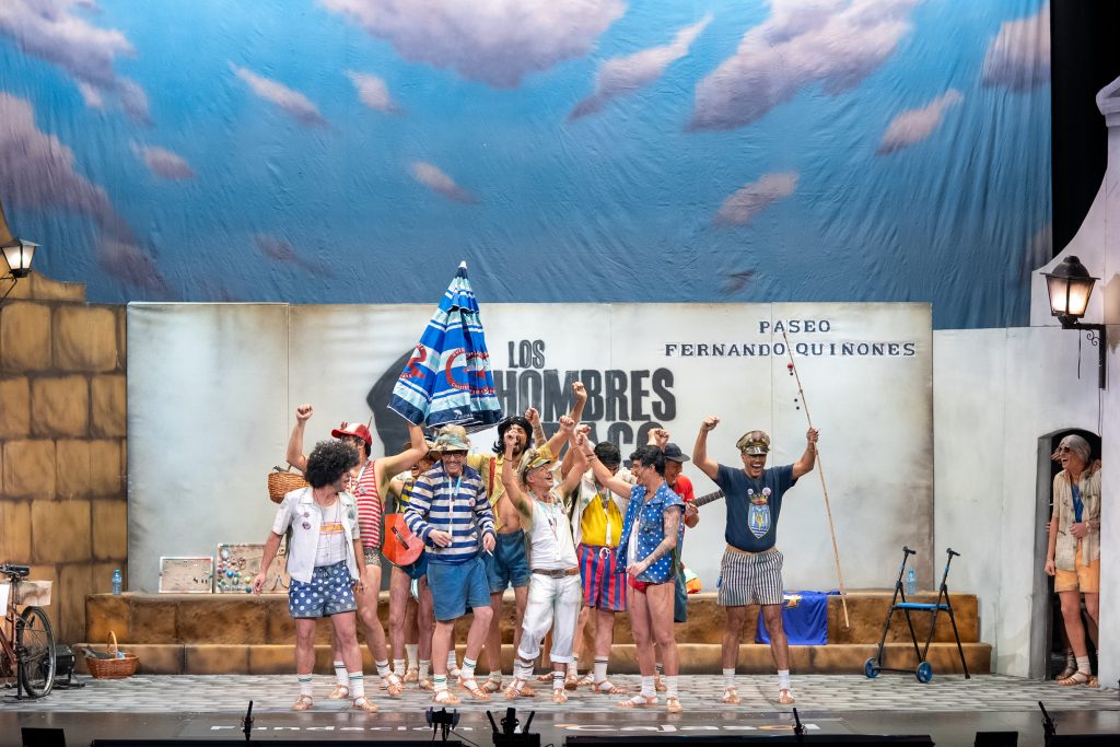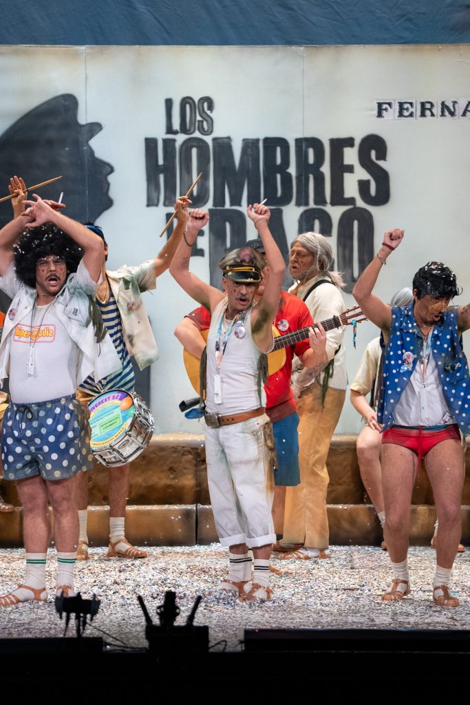 El tipo, caleteros curtidos a base de temporales y trabajo diario, vuelve a ser uno de los grandes aciertos del repertorio. Es un personaje muy gaditano, fácilmente identificable por el público del Falla y bien explotado desde la presentación hasta el popurrí. La entrada en escena arranca con un golpe de actualidad, utilizando la referencia a Sónsoles Ónega y su ya conocida confusión geográfica para situar rápidamente el tono humorístico del pase. El arranque funciona por ritmo y por intención, reforzado por un shoniquete reconocible que actúa como carta de presentación.