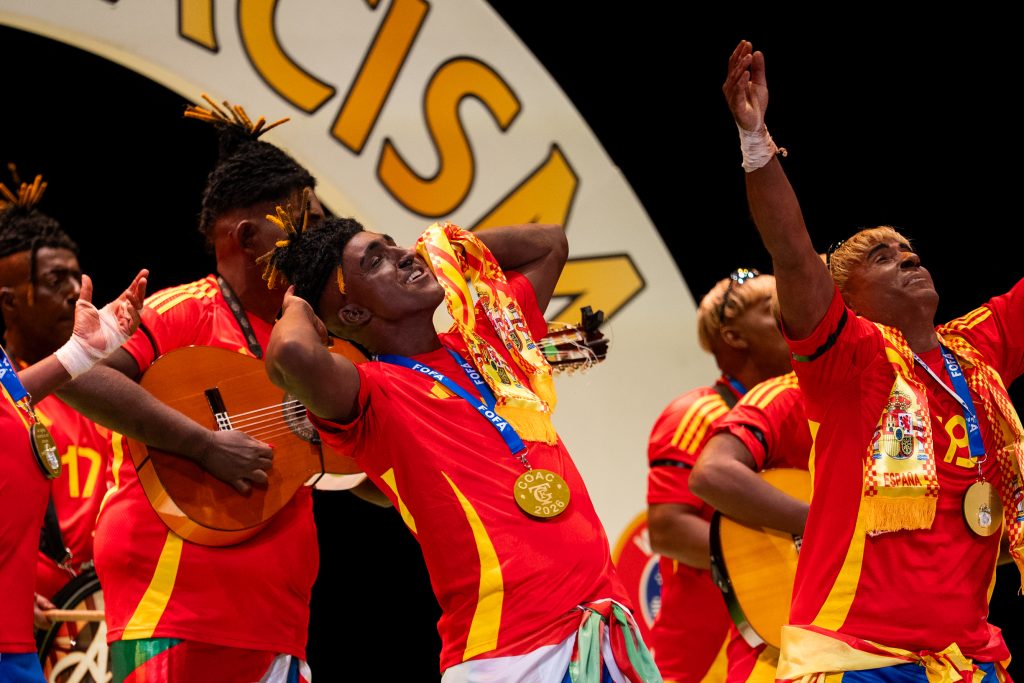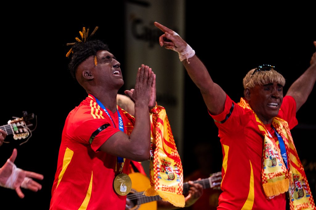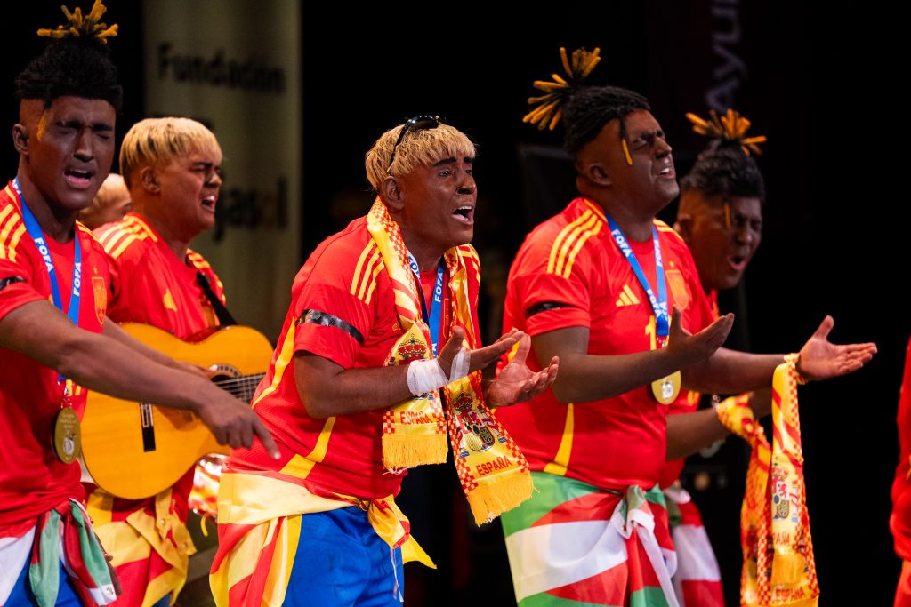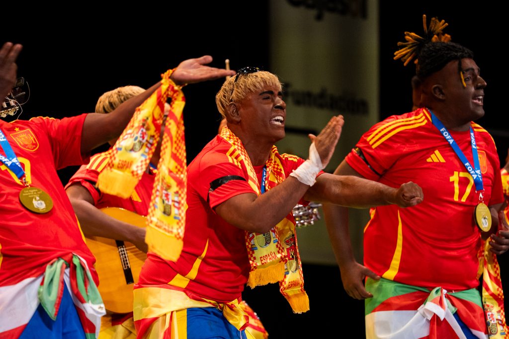 La primera parte del repertorio reveló el eje principal sobre el que giraba la sátira: la distinta percepción social respecto a personas racializadas en función de su origen, su estatus económico y su nivel de éxito. La chirigota utilizó los personajes para contraponer el discurso político sobre inmigración con la normalización del ídolo deportivo, con mención expresa a la contradicción entre discursos antiinmigración y elogio a figuras futbolísticas nacidas de familias migrantes. El tratamiento del racismo, la nacionalidad y el debate identitario estuvo presente desde el inicio, con referencias a la selección española, a la convivencia, al mercado deportivo y al marco político.