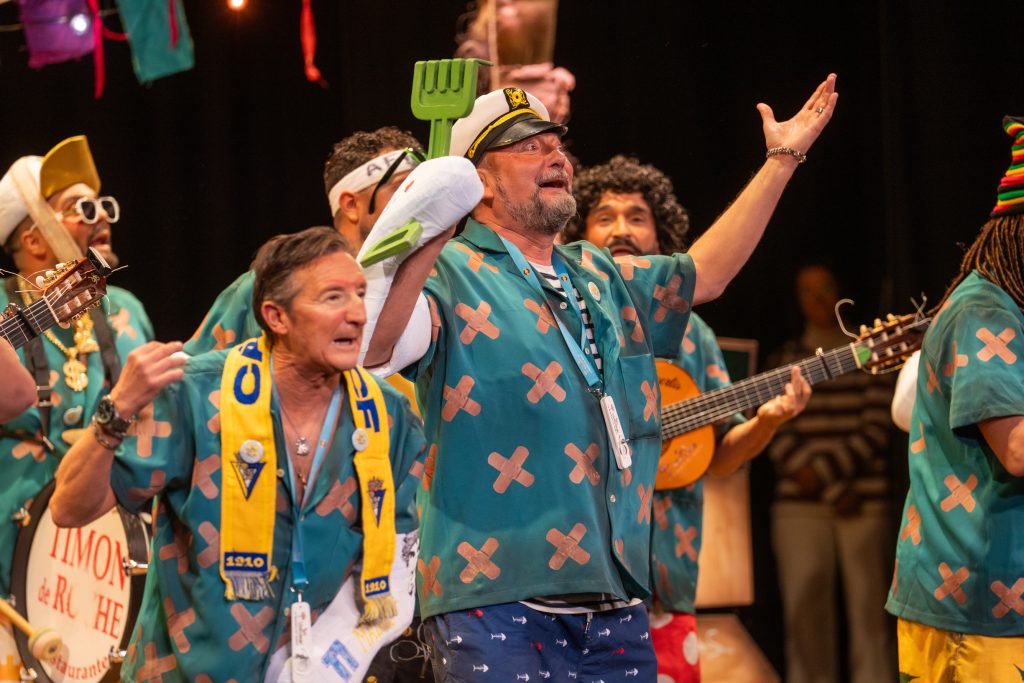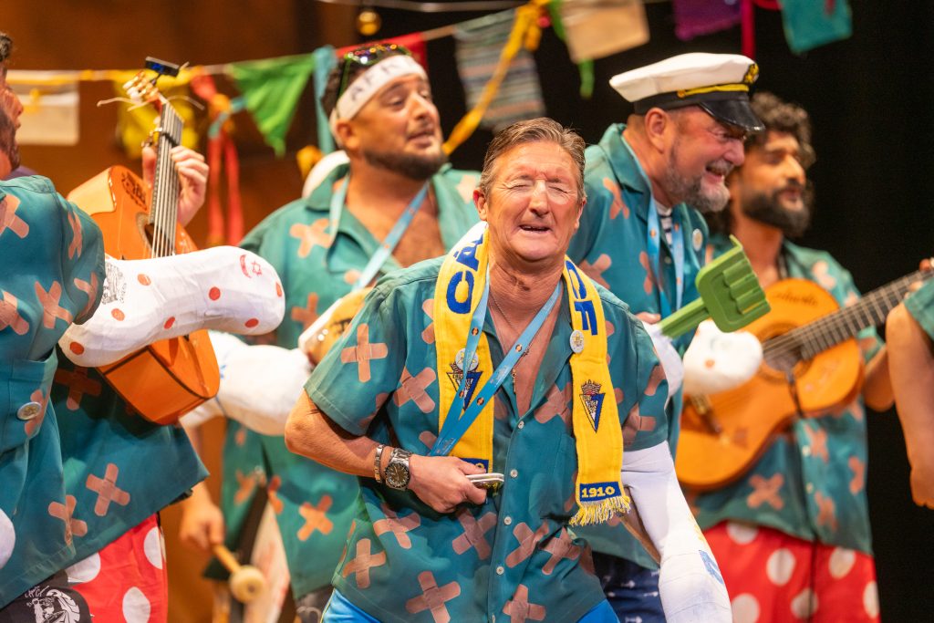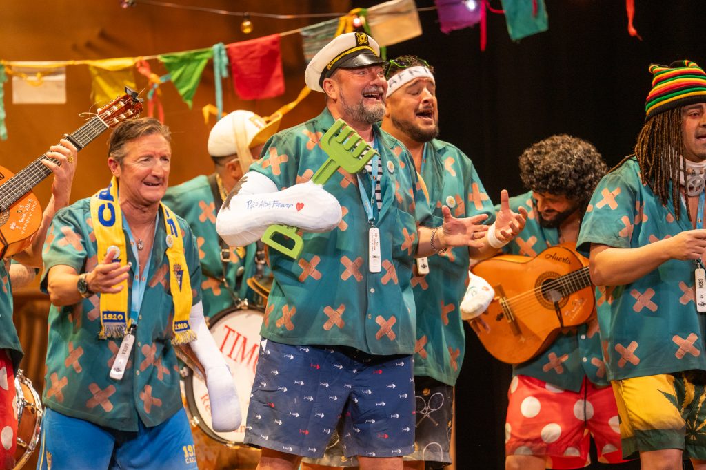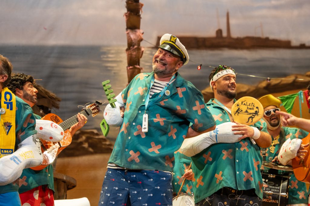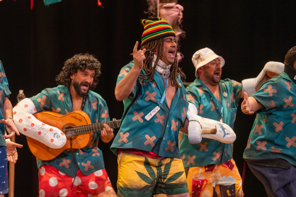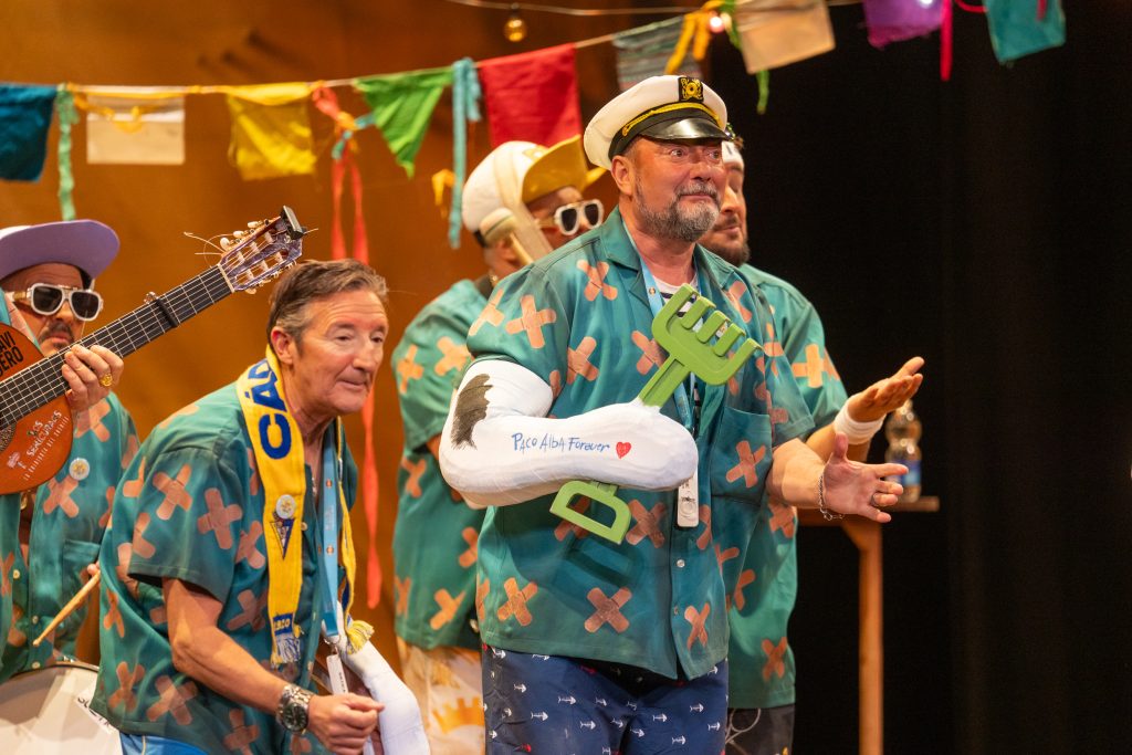 En lo interpretativo, la chirigota ofreció oficio. Afinación correcta, volumen equilibrado y una guitarra central sosteniendo el color clásico del grupo. El patio de butacas acompañó el pase con simpatía, sin momentos de rechazo ni de entusiasmo excepcional, confirmando la naturaleza templada del estreno.