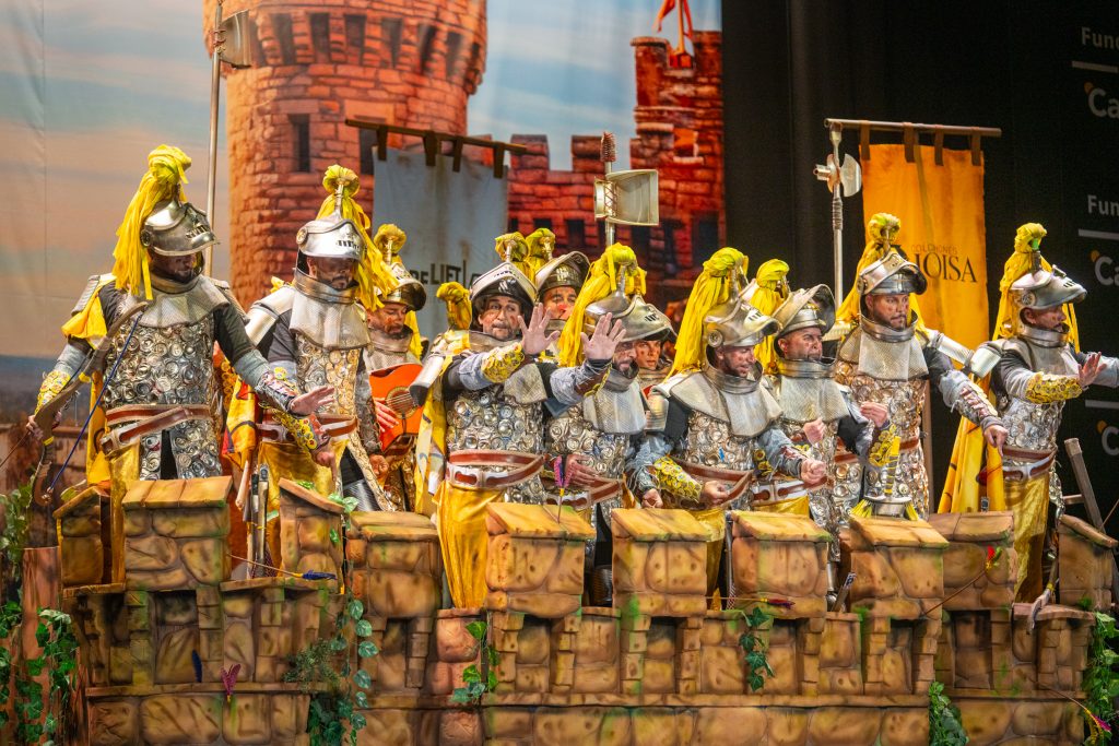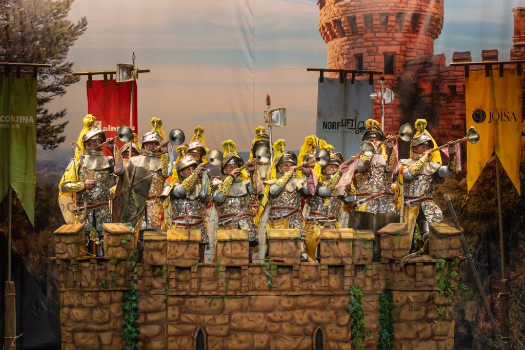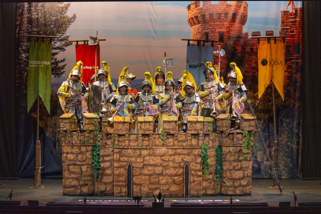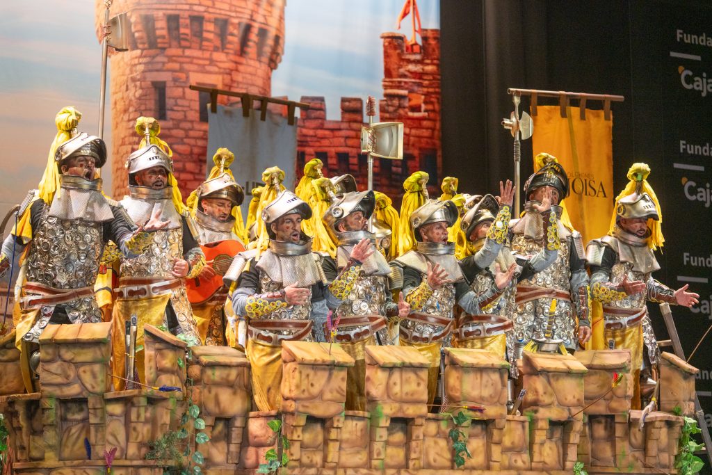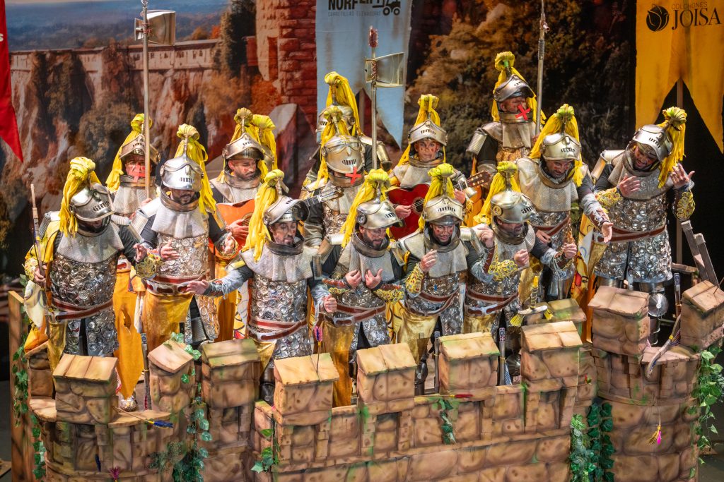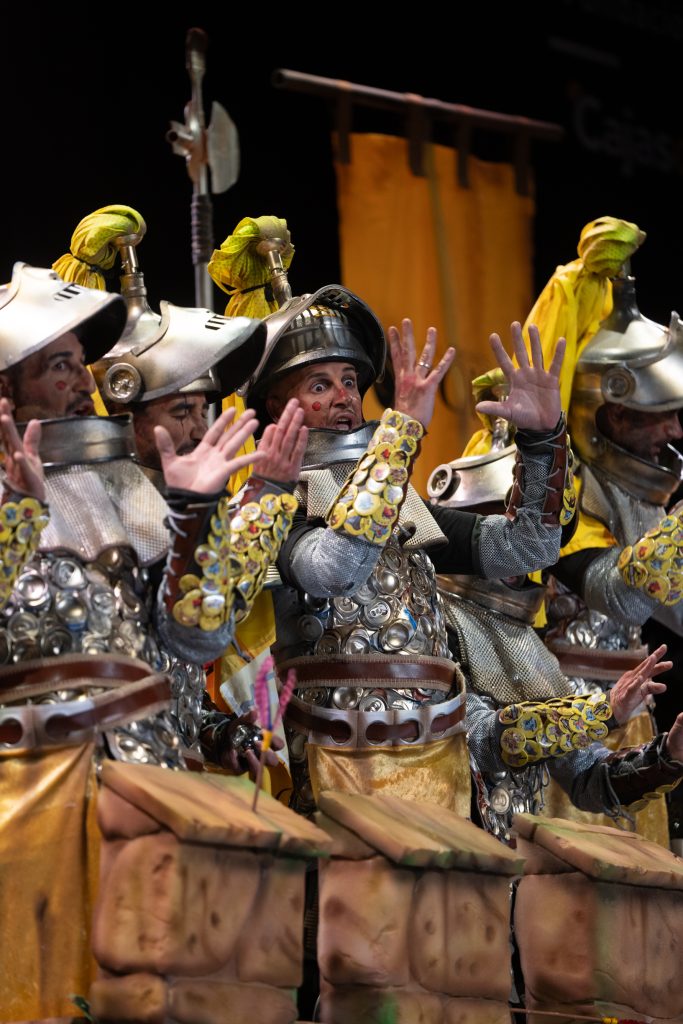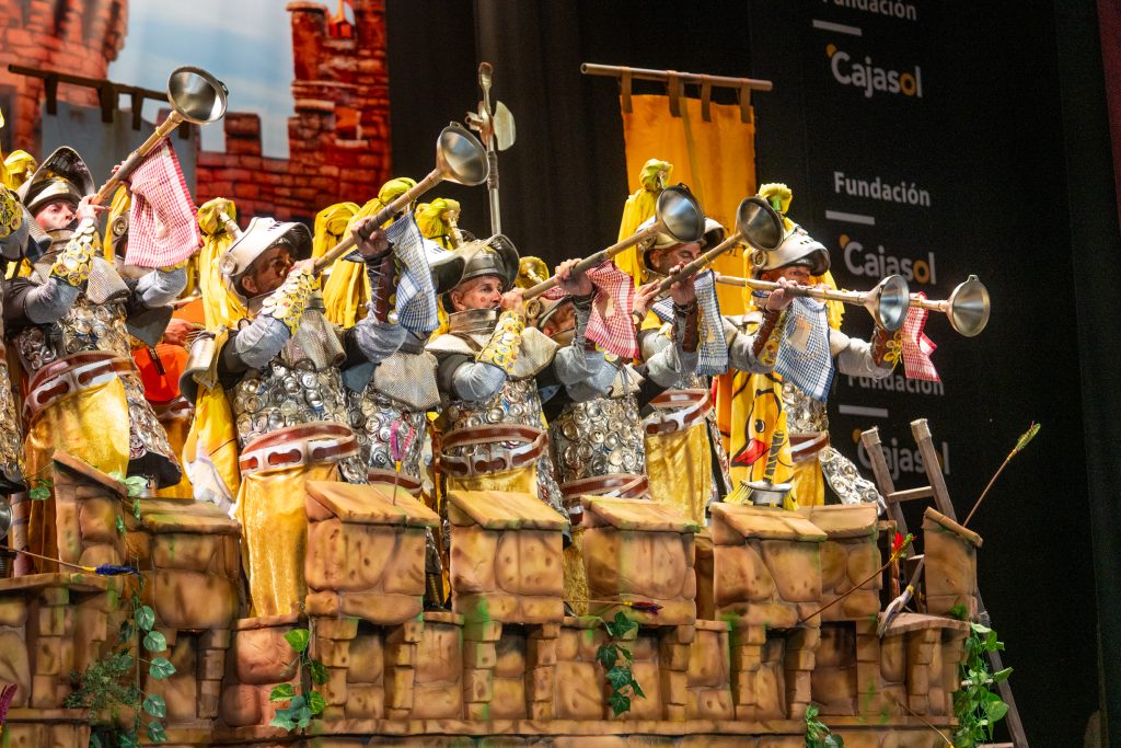 Desde lo musical, la chirigota confirmó lo que ya venía apuntando: interpretación limpia, segunda poderosa, afinación sin desajustes y soniquete reconocible. El tipo añadió valores en escena con el reciclaje de materiales, armaduras funcionales y un torreón que facilitó el juego metafórico. El humor se mantuvo agarrado al tipo, sin escapismos ni atajos, lo que aporta solidez en preliminares.