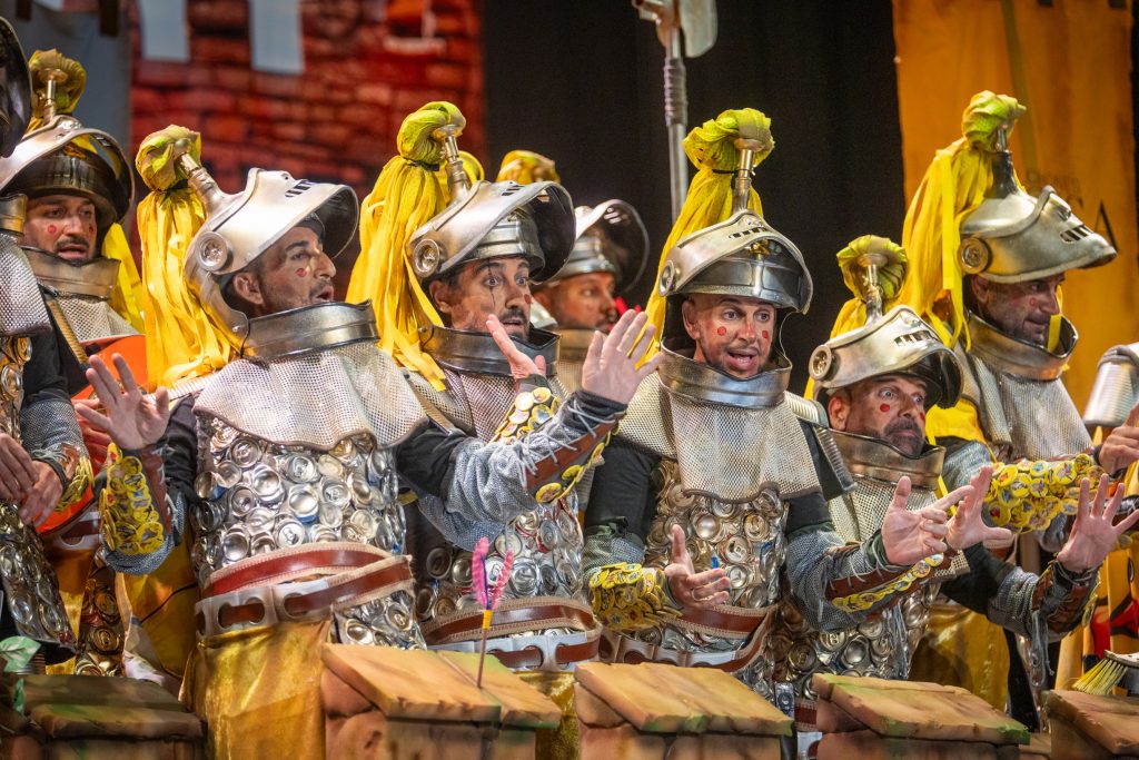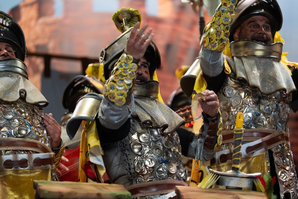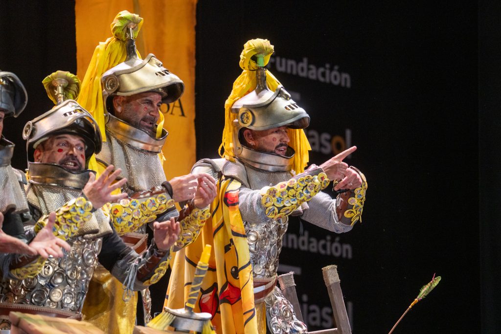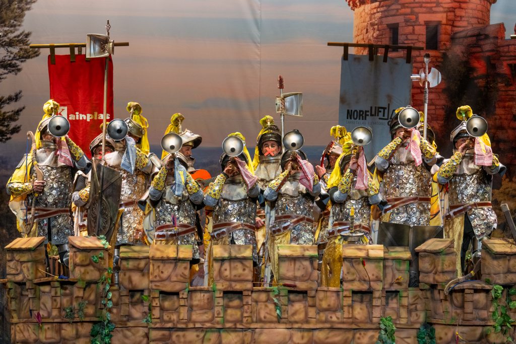 La presentación arrancó con telón cerrado, oscuridad total y suspense en la primera parte del bloque. La irrupción de los caballeros, armados con armaduras construidas a base de latas, chapas y elementos reciclados, confirmó el sello de la casa: apuesta visual, coherencia con el tipo y humor apoyado en el atrezzo. El arranque fue frío en términos de carcajada, pero efectivo en lectura estética. La música, de soniquete clásico ecijano, acompañó sin estridencias y terminó asentando el bloque, cumpliendo sin explosión humorística.