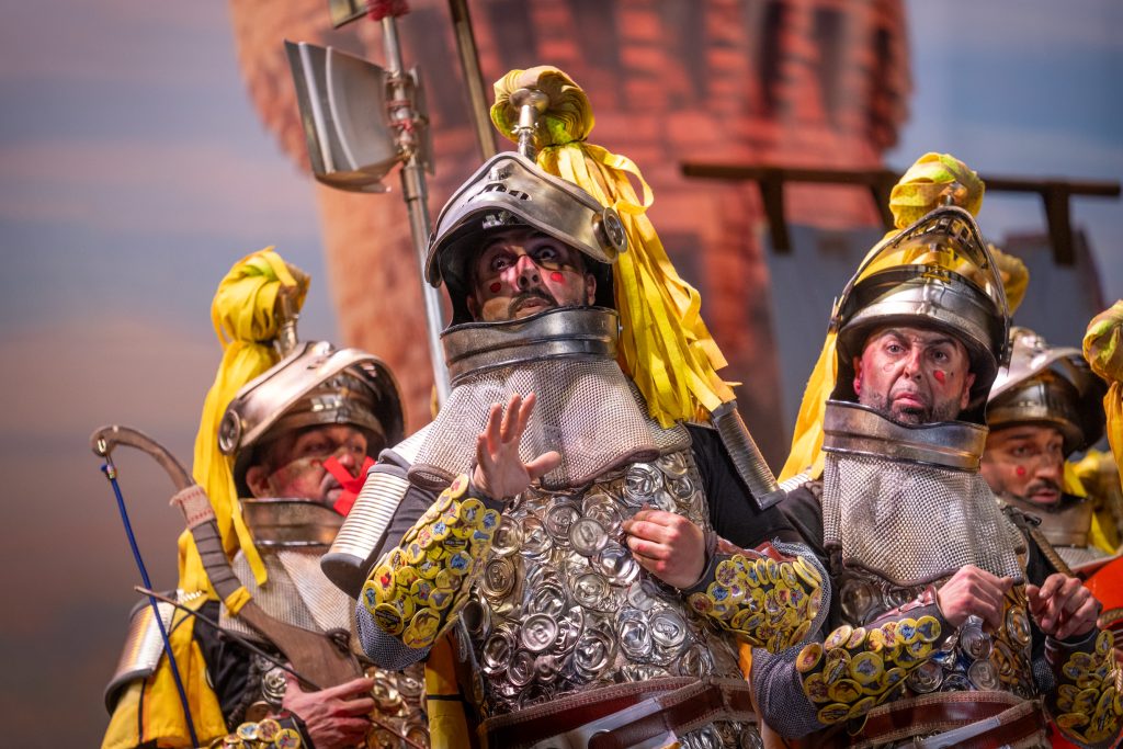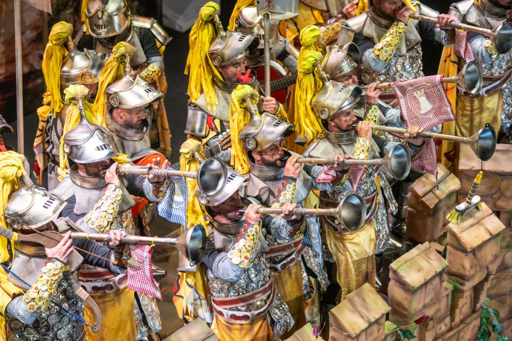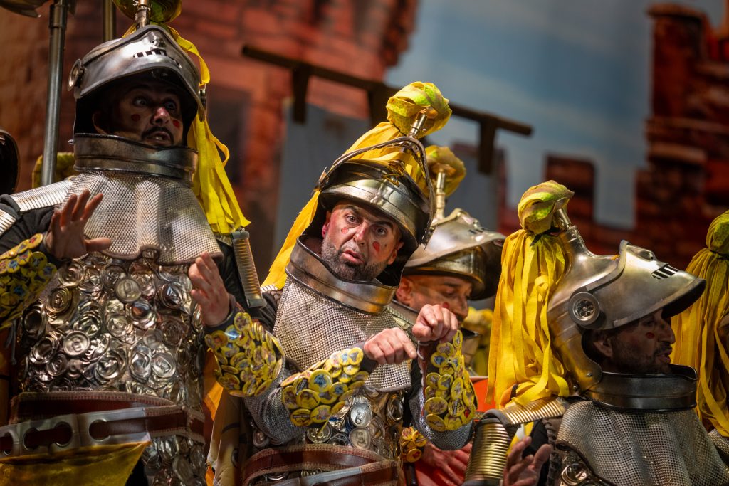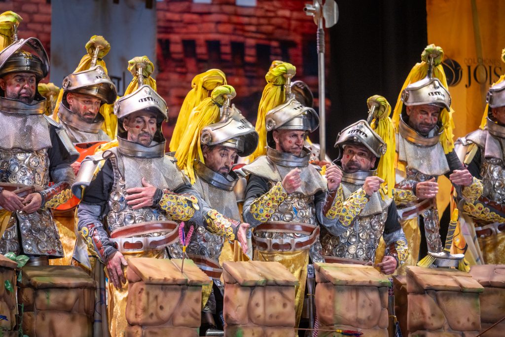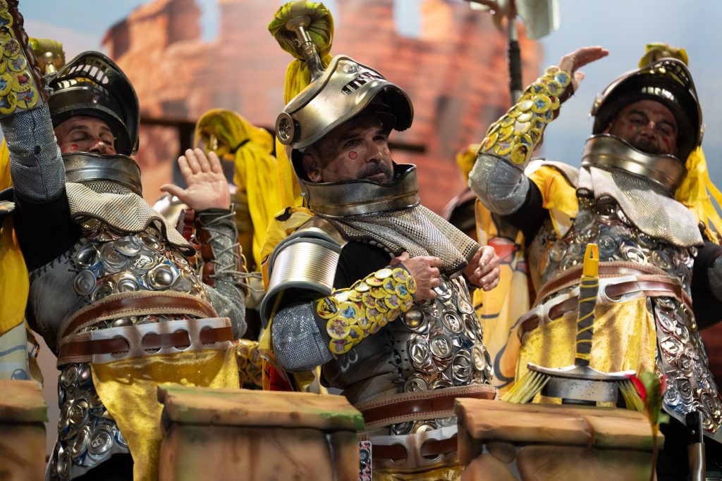 La presentación arrancó con telón cerrado, oscuridad total y suspense en la primera parte del bloque. La irrupción de los caballeros, armados con armaduras construidas a base de latas, chapas y elementos reciclados, confirmó el sello de la casa: apuesta visual, coherencia con el tipo y humor apoyado en el atrezzo. El arranque fue frío en términos de carcajada, pero efectivo en lectura estética. La música, de soniquete clásico ecijano, acompañó sin estridencias y terminó asentando el bloque, cumpliendo sin explosión humorística.