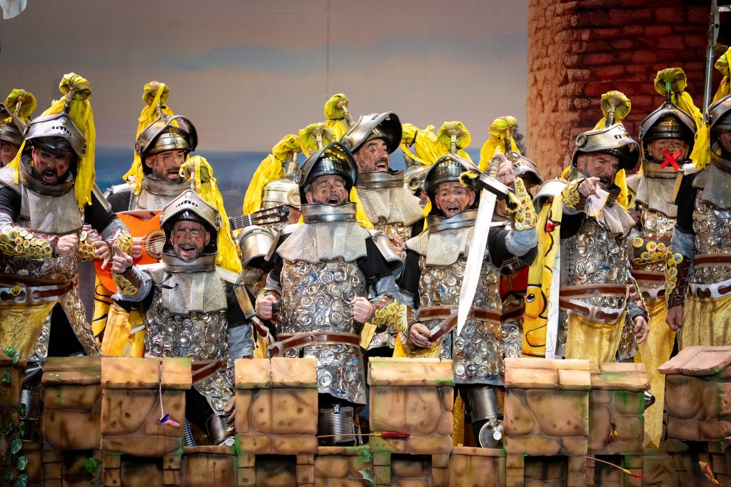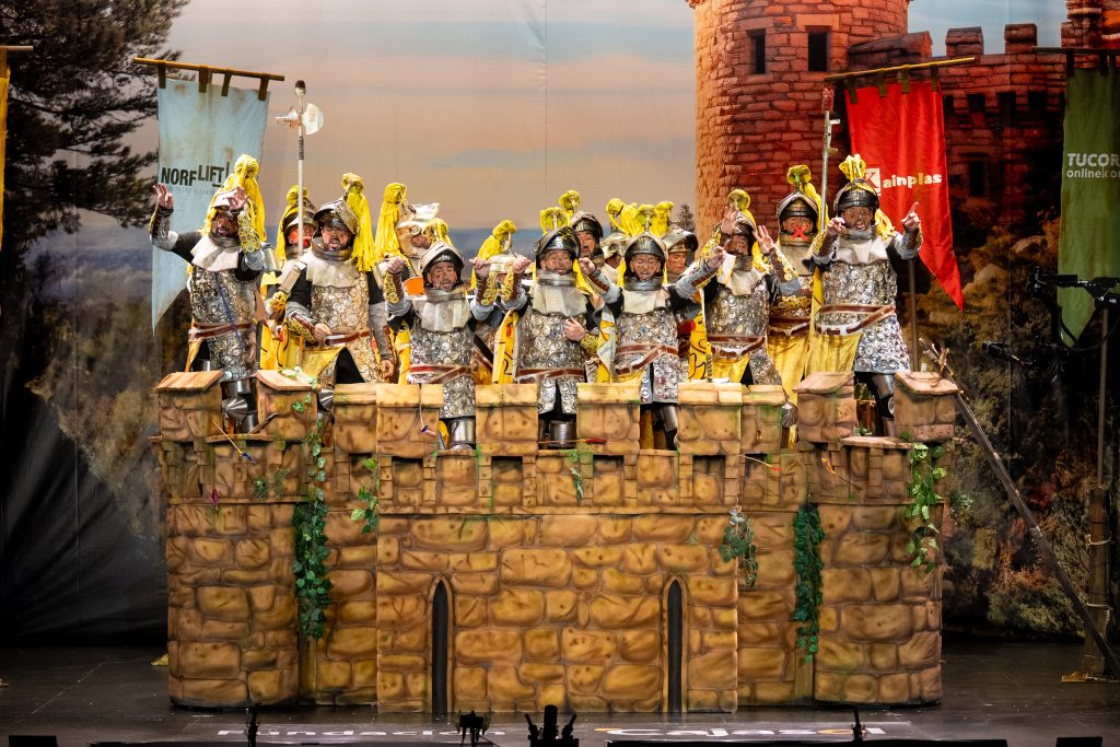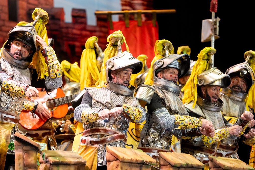 El tipo sitúa a la chirigota como un grupo de caballeros medievales encargados de custodiar un torreón. Lejos del fuerte impacto visual de sus propuestas recientes —como los caníbales o el ascensor claustrofóbico—, el planteamiento de este año apuesta por una puesta en escena más tradicional y menos aparatosa. El torreón domina el escenario y condiciona la interpretación, limitando la cercanía física con el público, lo que se deja notar especialmente en el arranque del repertorio.