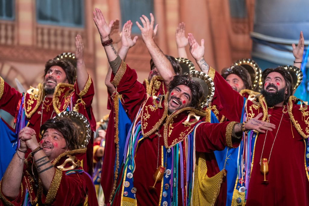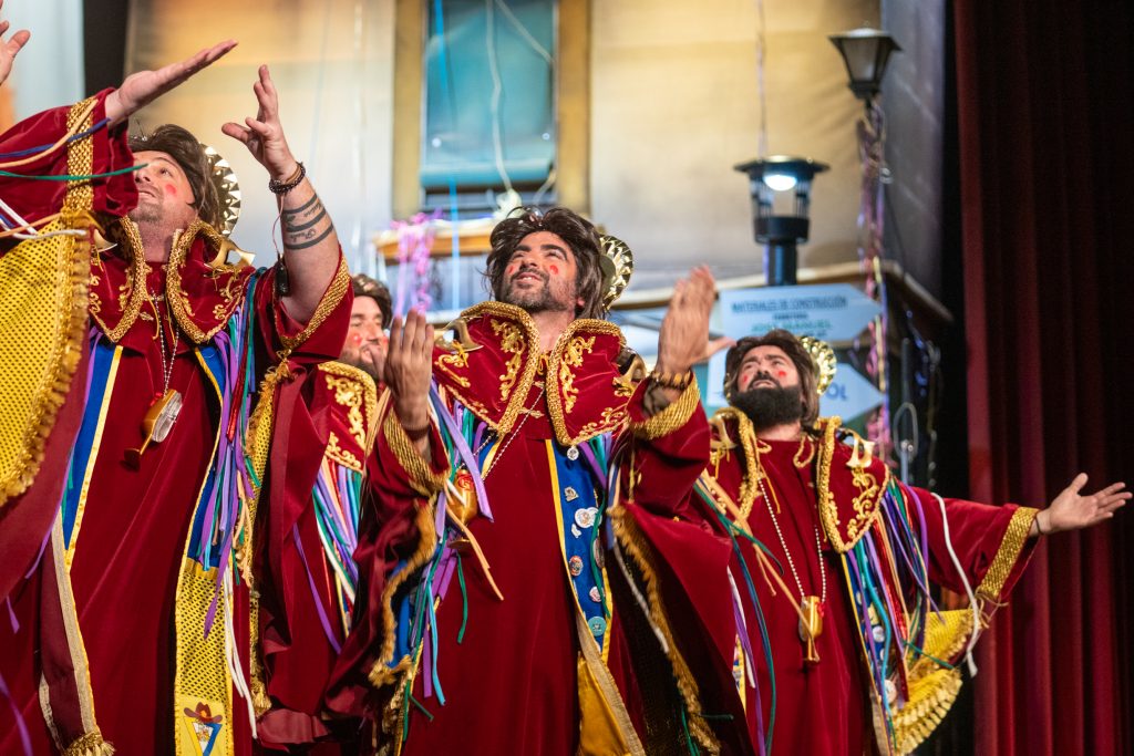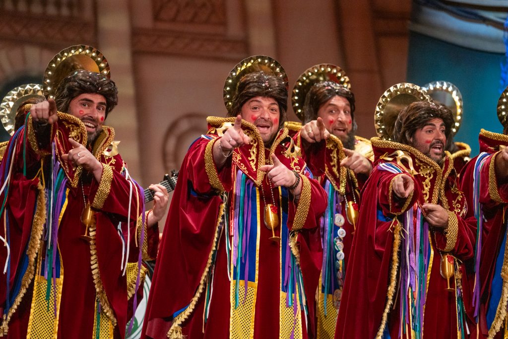 La presentación fue lo más celebrado de la actuación. Desde el primer compás, el grupo abrazó la gramática del metacarnaval: referencias al santo, plegarias, coplas que “vuelan al cielo”, callejeras, coros y comparsas suplicando repertorio, y guiños internos al aficionado. El ritmo alegre y el estribillo instrumental incitaron al baile del público y mostraron la mano del Sheriff, habitual en la creación de pasajes festivos. La escena ayudó, con halos luminosos sobre la cabeza de los componentes, y la figura del santo quedó explicada sin necesidad de excesos narrativos. La presentación marcó el tono y, quizá también, el techo de la propuesta.
