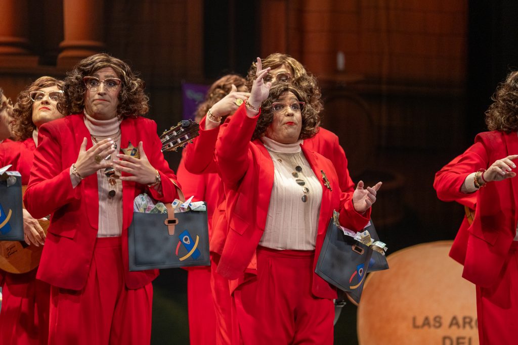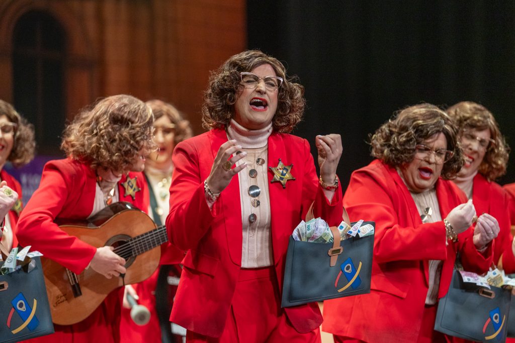 Los pasodobles elevaron el pase. El primero fue una acertada “declaración de intenciones” que comparaba el concurso con un proceso de elaboración tributaria, declarando amor a Cádiz desde el lenguaje administrativo. La música de Gallardo tuvo cuerpo, desarrollo y un vuelo poco habitual en chirigotas foráneas. El segundo pasodoble entró en materia social con decisión y apuntando alto: el cribado del cáncer de mama y la gestión sanitaria del Gobierno andaluz. La letra mencionó a la asociación Amama y señaló directamente las listas de espera y el papel del Ejecutivo, con un tono serio y reivindicativo que contrastó con el personaje de la ministra. Fue el momento más sólido del repertorio: discurso claro, remate bien planteado y música agradecida. Se notó oficio en la escritura.