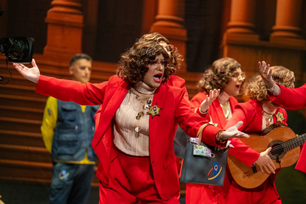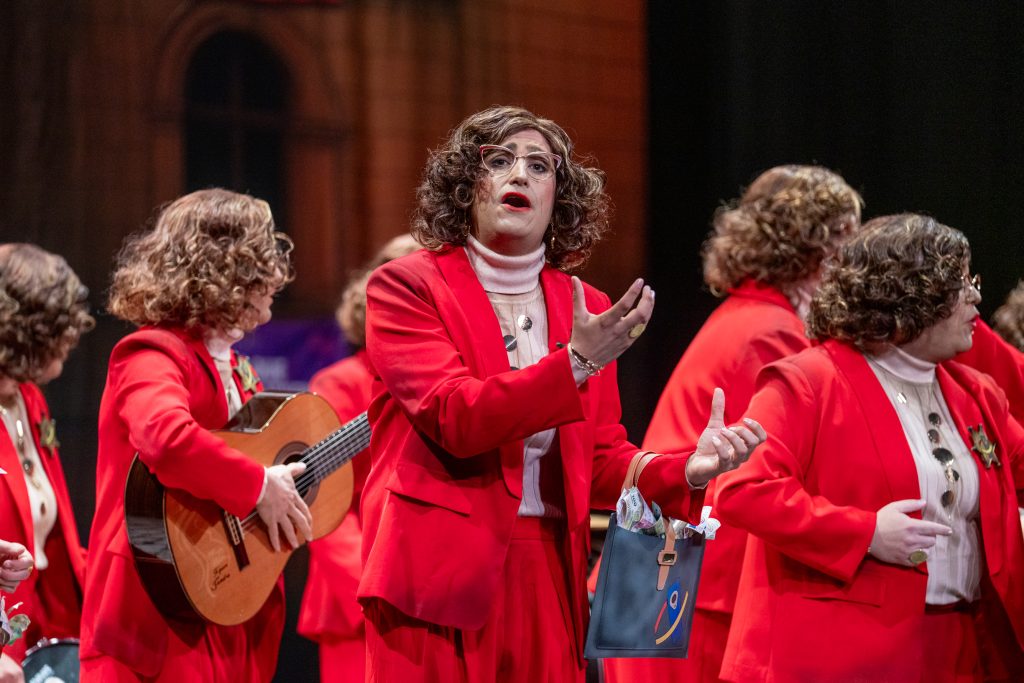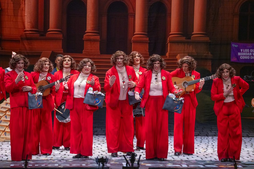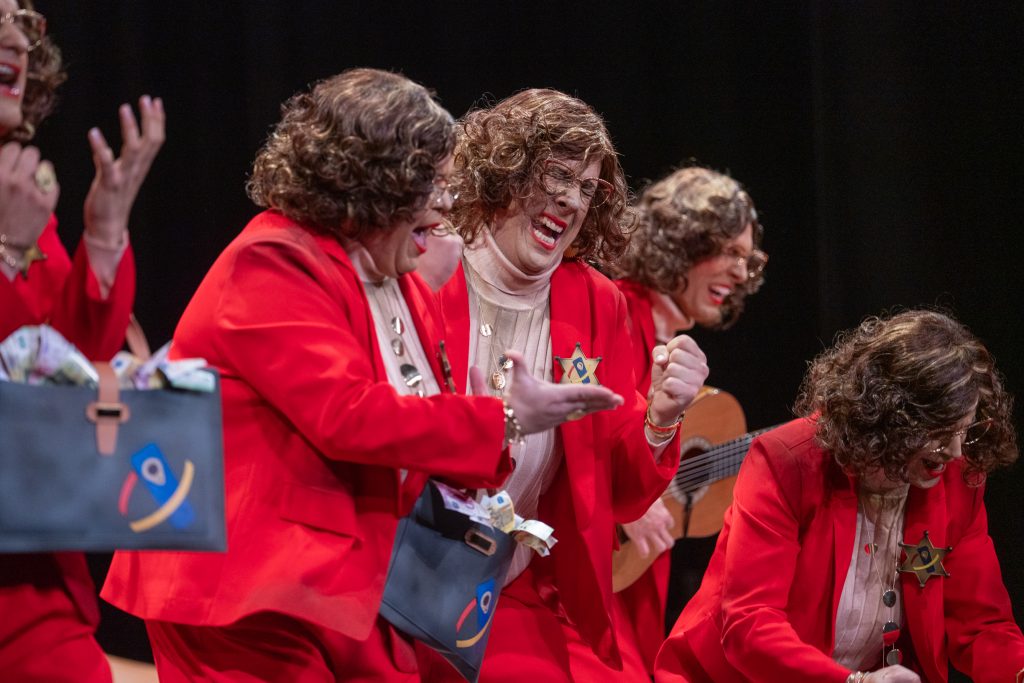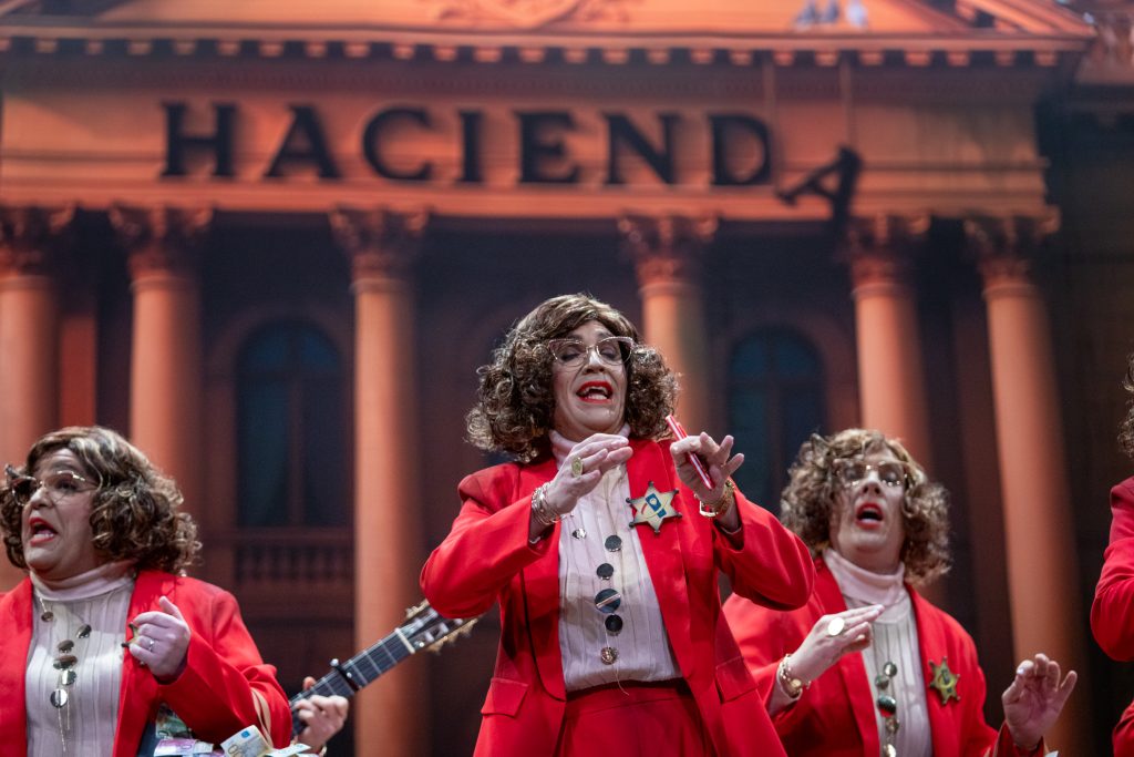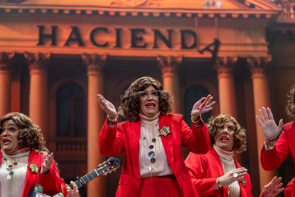 El planteamiento escénico se sostuvo con solvencia. La presentación jugó con la biografía inventada de la ministra: niña ambiciosa, sevillana de Triana con gusto por el poder y la fiscalidad. La vinculación con Hacienda permitió un par de golpes bien recibidos —“Hacienda siempre gana, será la primera vez que gane una sevillana”— pero la escena no terminó de arrancar ni en ritmo ni en energía. El personaje exige mucha pose, mucha ironía y mucho subtexto, y la chirigota se quedó a medio camino entre la imitación política y el gesto paródico.