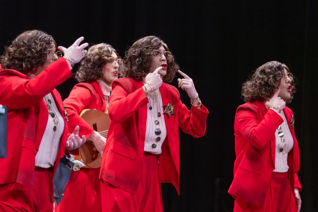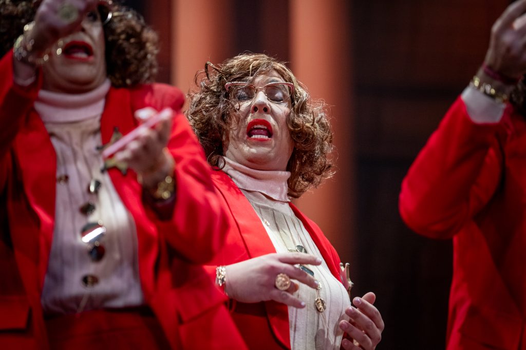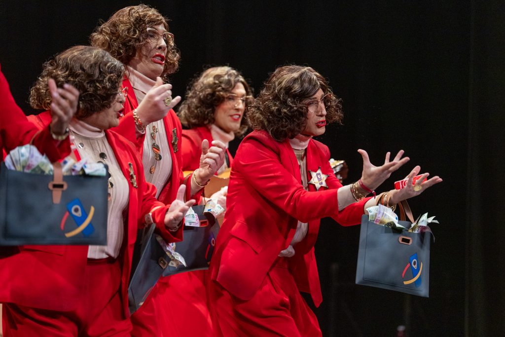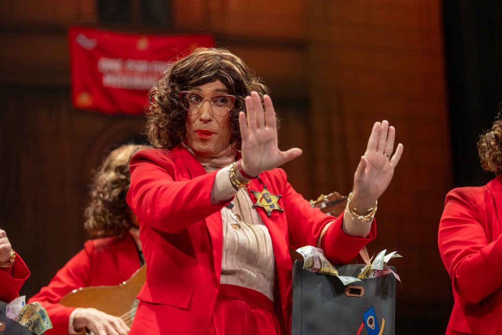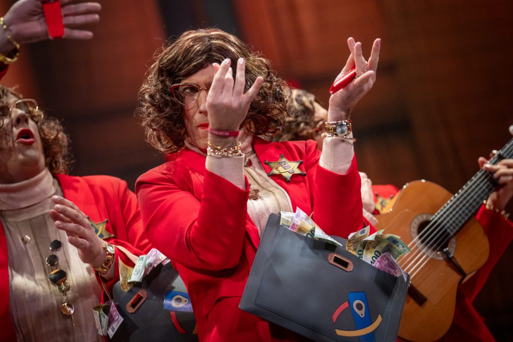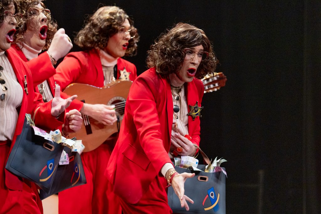 El planteamiento escénico se sostuvo con solvencia. La presentación jugó con la biografía inventada de la ministra: niña ambiciosa, sevillana de Triana con gusto por el poder y la fiscalidad. La vinculación con Hacienda permitió un par de golpes bien recibidos —“Hacienda siempre gana, será la primera vez que gane una sevillana”— pero la escena no terminó de arrancar ni en ritmo ni en energía. El personaje exige mucha pose, mucha ironía y mucho subtexto, y la chirigota se quedó a medio camino entre la imitación política y el gesto paródico.