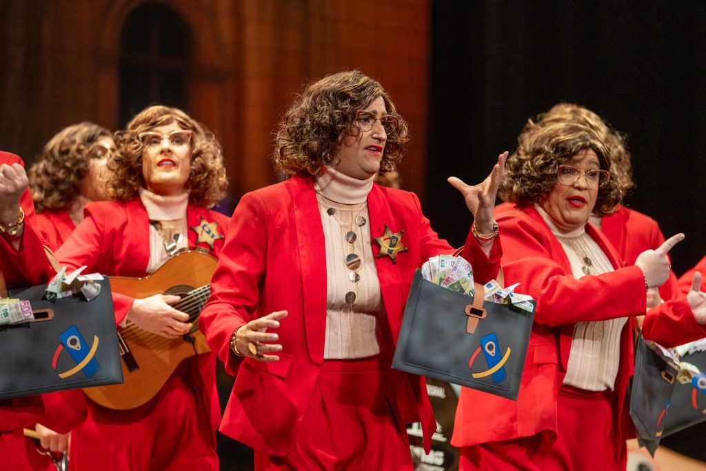 El popurrí remató el repertorio con más discurso que pamplineo. El personaje de la ministra se mantuvo, pero el eje temático derivó hacia una fiscalidad satirizada sin despliegue humorístico potente. Se apeló a los Google, a la declaración trimestral y a una administración pública que lo absorbe todo, pero el humor tendió a lo literal y el remate coral no terminó de levantar el clima. La chirigota tiene tablas y buena capacidad interpretativa, y eso se notó: el pase nunca cayó en caos ni en desorden, pero tampoco alcanzó el punto de calor que exige la modalidad para romper el teatro.