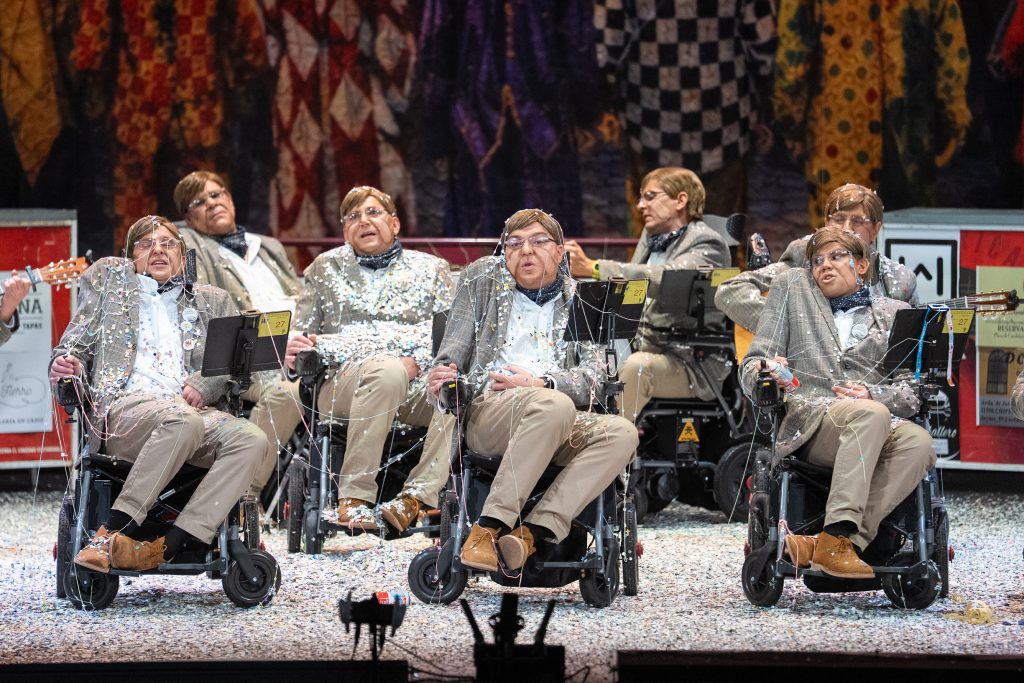 El primer pasodoble es uno de los momentos más emotivos del pase. Desde el humor y la ternura, la letra pone el foco en la tecnología de comunicación aumentativa, utilizada por personas con ELA y otras discapacidades, como herramienta para recuperar la voz y el vínculo emocional. La copla adquiere un valor simbólico al centrarse en la posibilidad de volver a decir “te quiero”, y remata con una petición clara de mayor inversión pública en tecnología y salud frente al gasto militar. Es una letra sensible, bien integrada en el personaje y con un mensaje reconocible que conecta con el público.