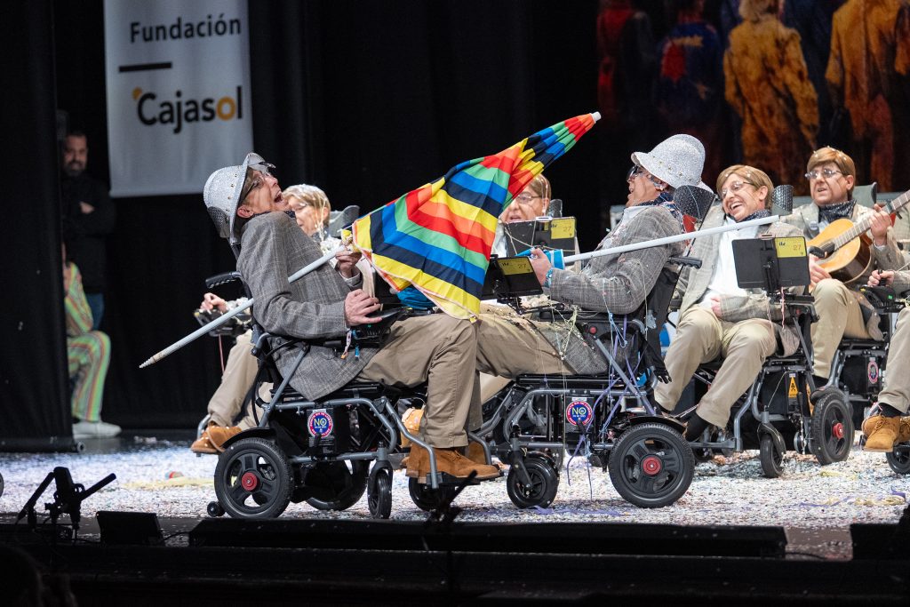 En el apartado interpretativo, el trabajo del grupo es especialmente meritorio. El tipo limita el movimiento y obliga a una precisión extrema en los tiempos, los gestos y la vocalización. La chirigota resuelve esa dificultad con solvencia, apostando por la contención como virtud y sosteniendo al personaje sin caer en la caricatura fácil.