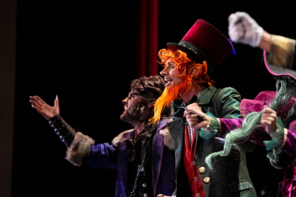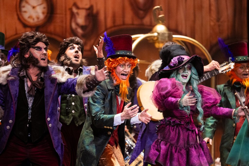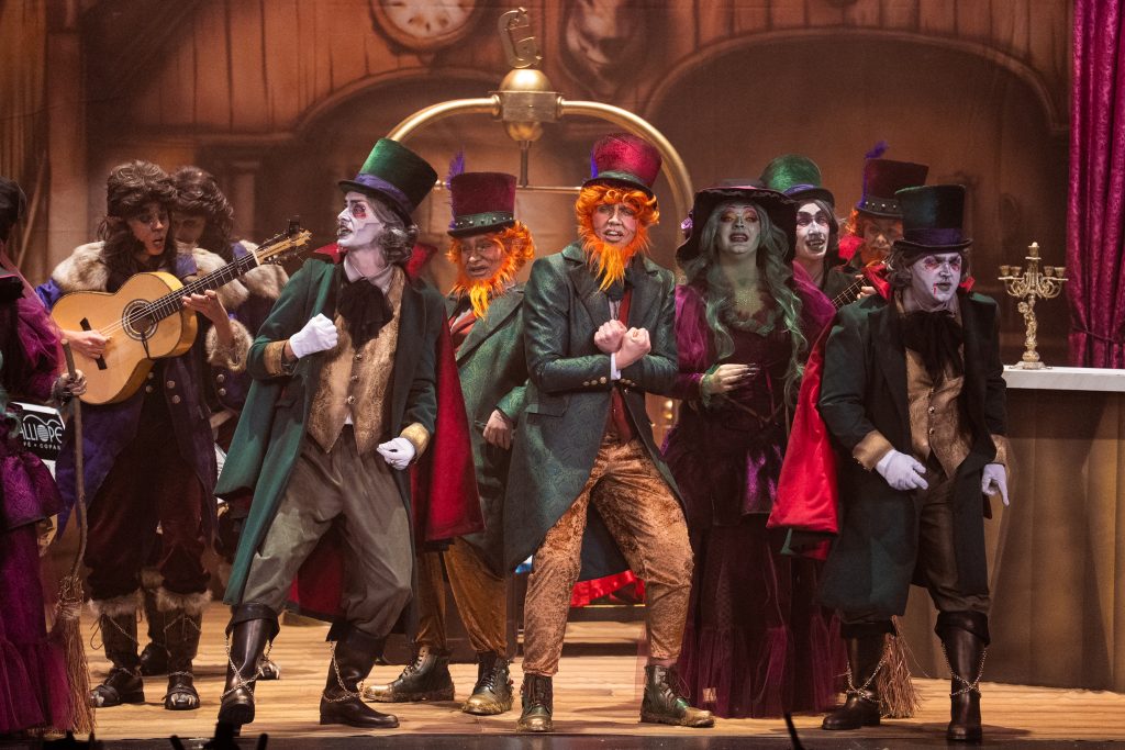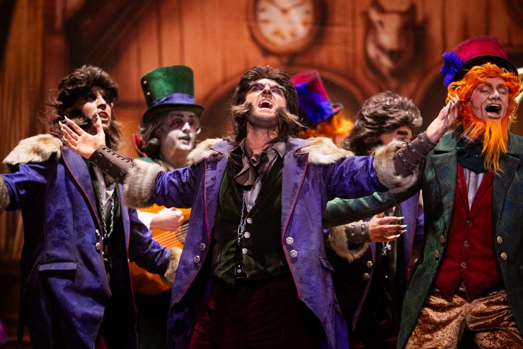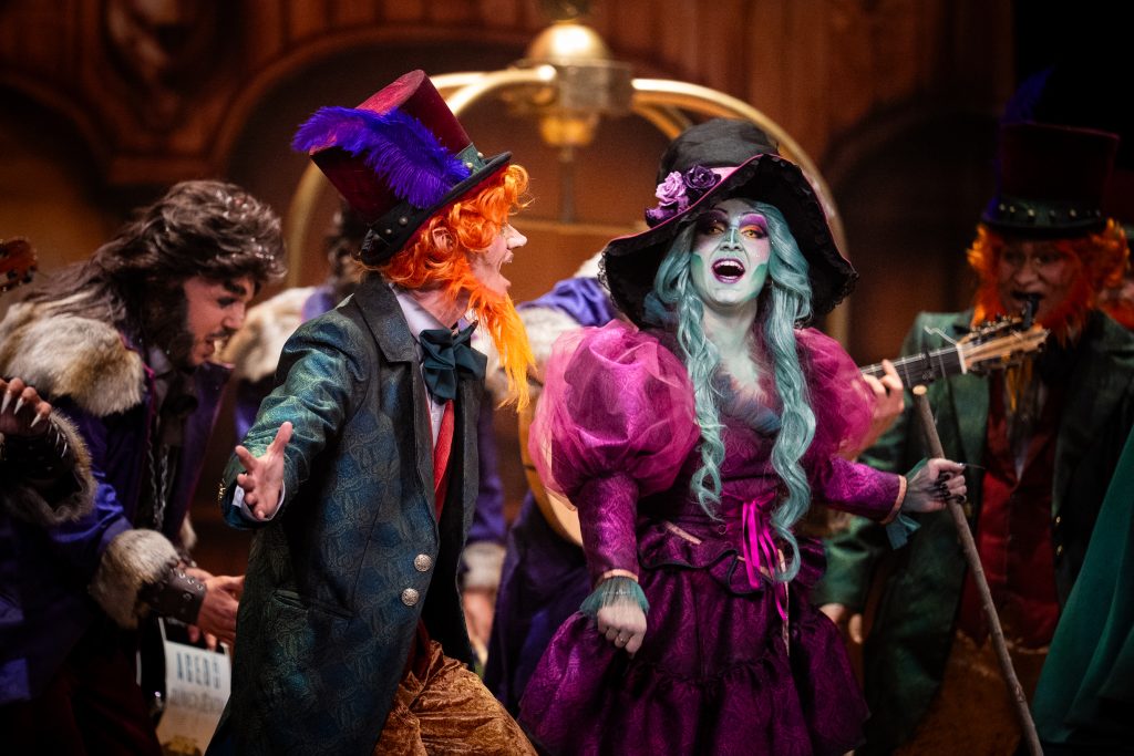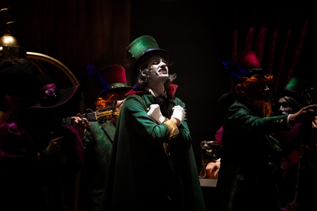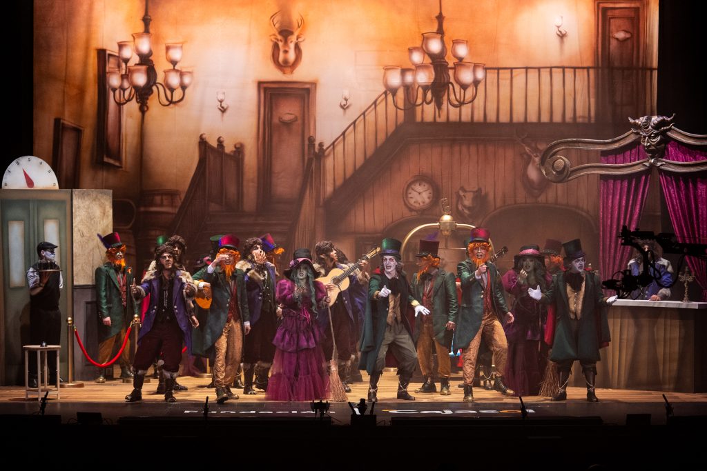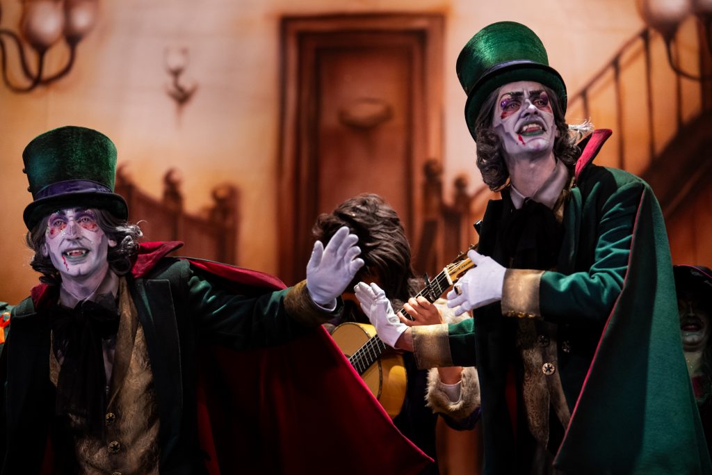 La presentación explica el código: los monstruos ocupan un hotel porque son expulsados de la sociedad “por locos, raros o enfermos” y en Cádiz encuentran un refugio paralelo: el del Carnaval. La letra plantea que lo que el mundo separa, febrero lo une, y que las máscaras, lejos de ocultar, permiten sobrevivir. Buen punto de partida. También buena presencia estética: maquillaje cuidado, tipologías reconocibles —lobos, vampiros, brujas— y un hotel construido en escena con acierto técnico. Hasta ahí, el concepto funciona.