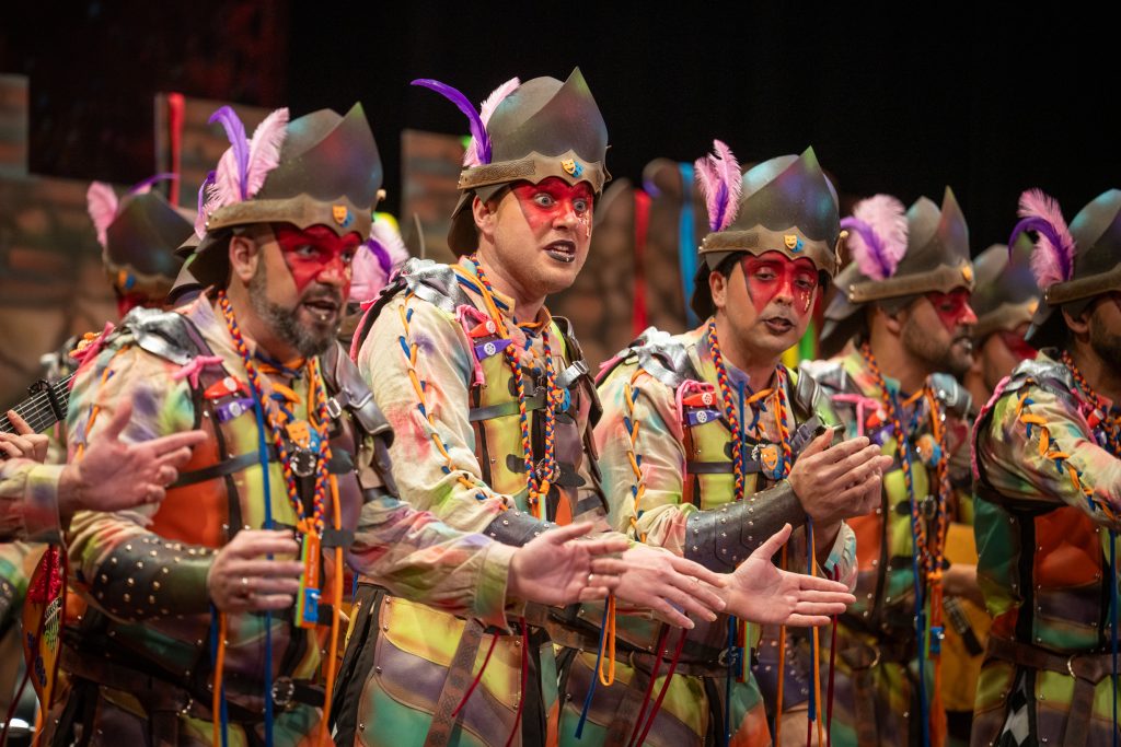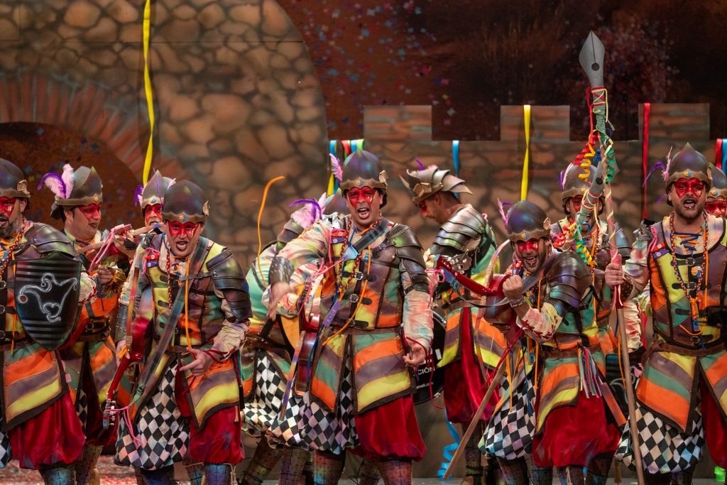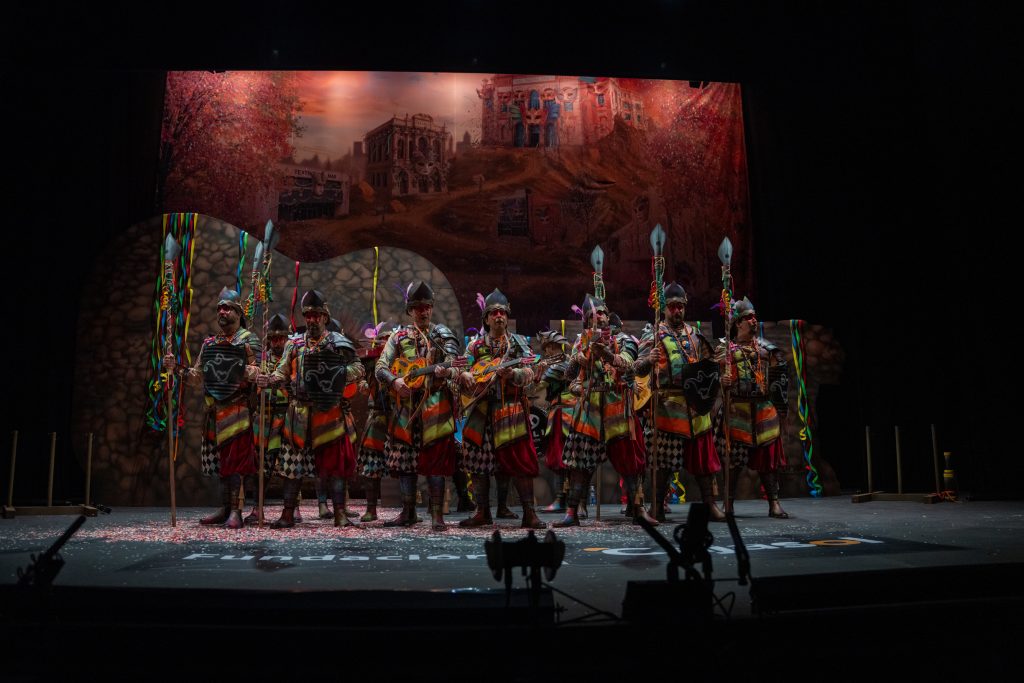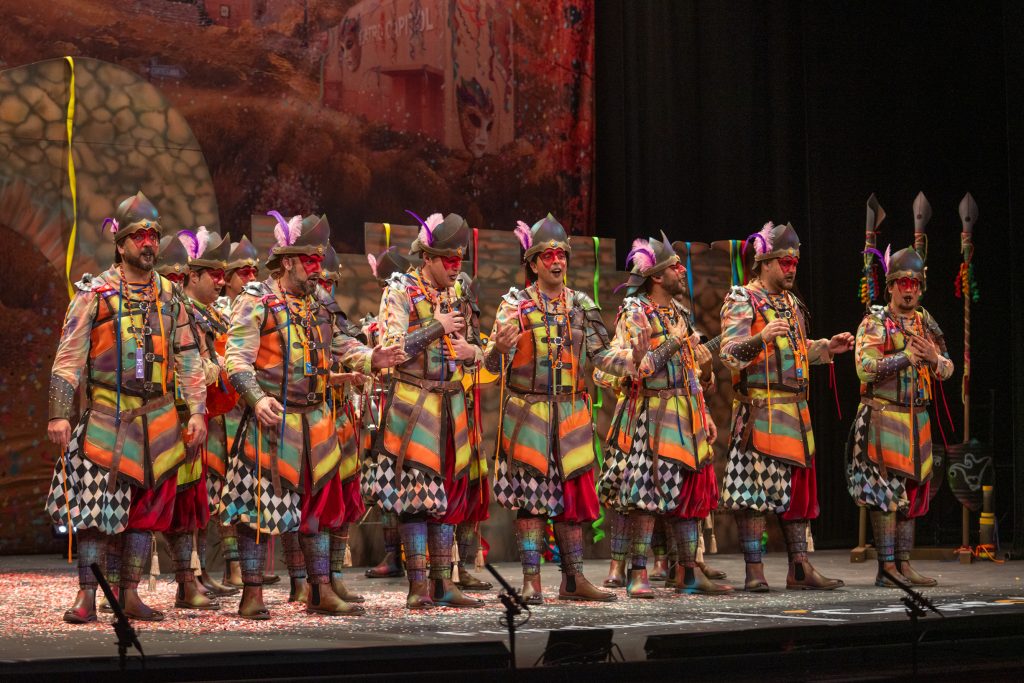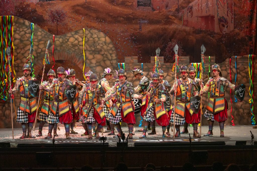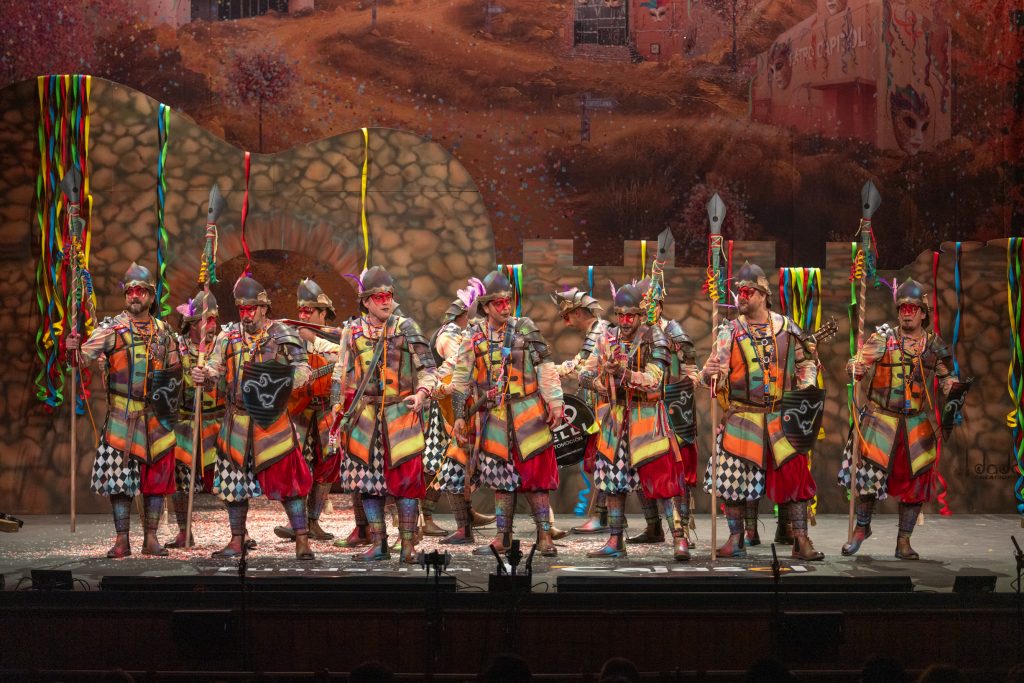 El tipo representaba a custodios de esa “ciudad prohibida”, soldados ceremoniales que custodian las puertas del templo carnavalero. El forillo fue lo más sugerente de la propuesta: el recinto fortificado adoptaba forma de guitarra, un gesto plástico que explicaba el concepto con claridad visual. En lo interpretativo, la presentación arrastró problemas de afinación, empaste y vocalización, además de una evidente falta de cohesión entre cuerdas. La colocación de voces no permitió que el grupo abriera el sonido en ningún momento y la entrada al primer pasodoble llegó sin haber asentado tono ni ritmo.