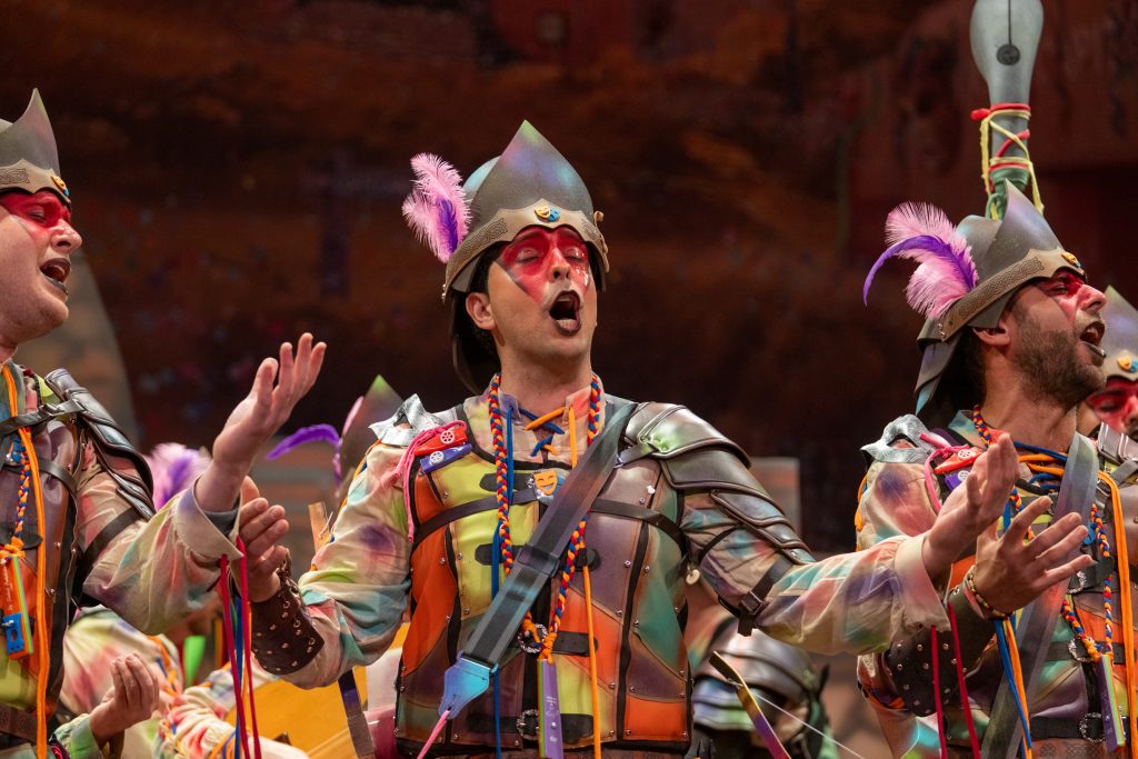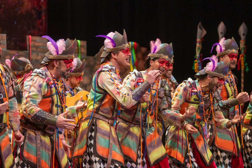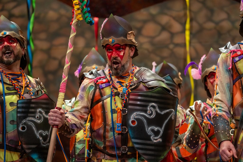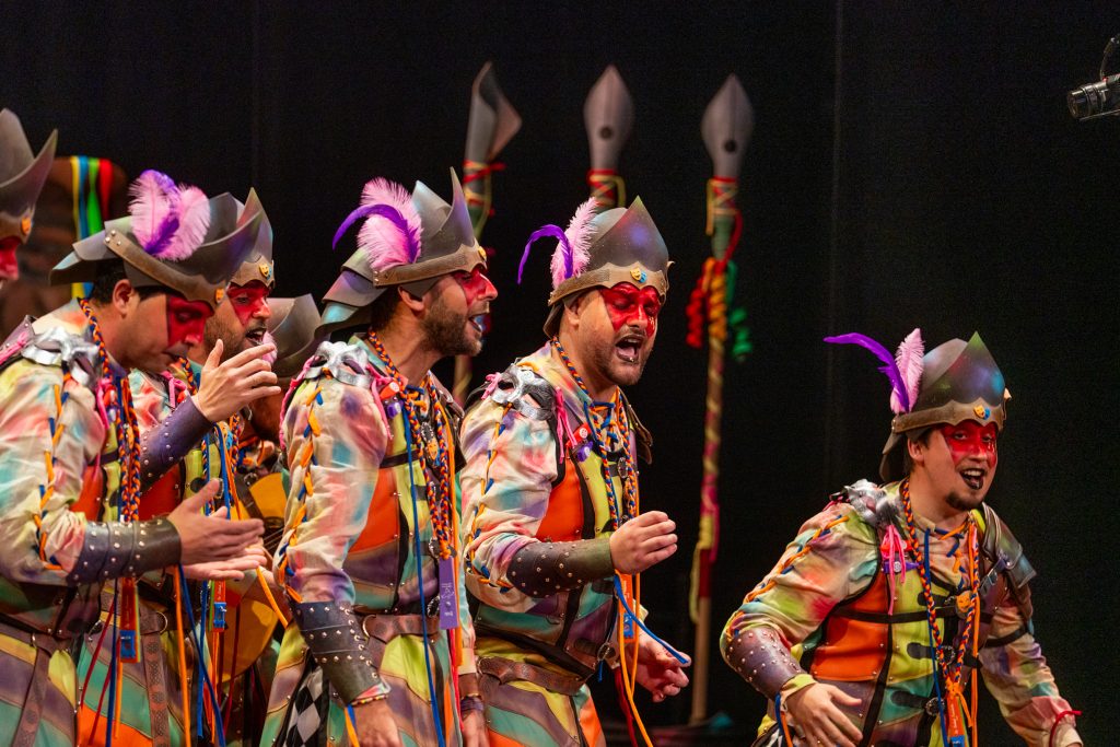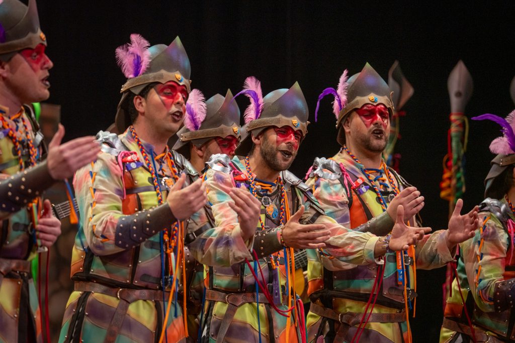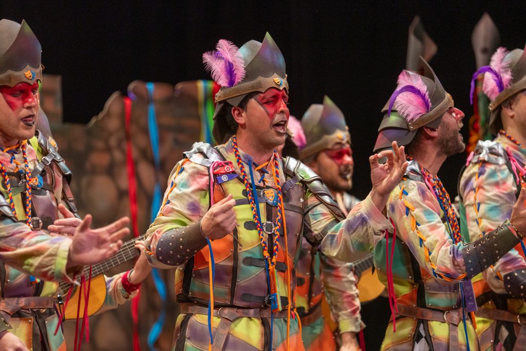 El tipo representaba a custodios de esa “ciudad prohibida”, soldados ceremoniales que custodian las puertas del templo carnavalero. El forillo fue lo más sugerente de la propuesta: el recinto fortificado adoptaba forma de guitarra, un gesto plástico que explicaba el concepto con claridad visual. En lo interpretativo, la presentación arrastró problemas de afinación, empaste y vocalización, además de una evidente falta de cohesión entre cuerdas. La colocación de voces no permitió que el grupo abriera el sonido en ningún momento y la entrada al primer pasodoble llegó sin haber asentado tono ni ritmo.