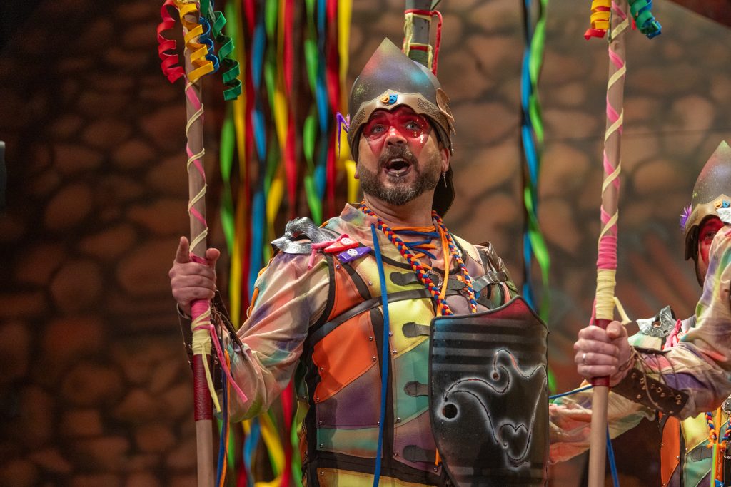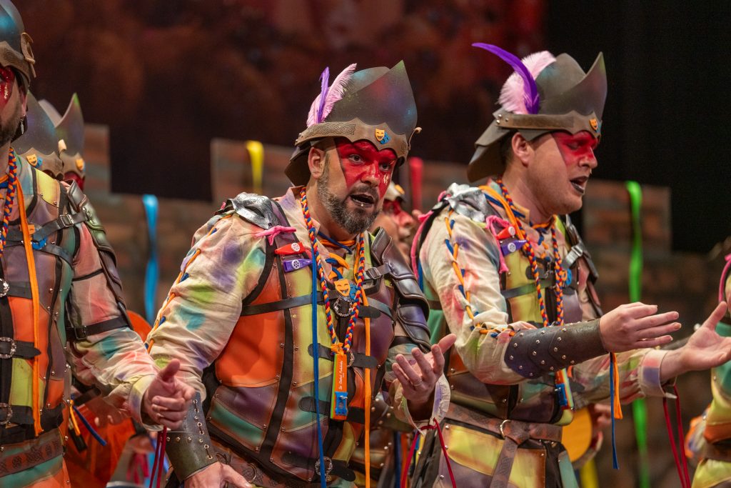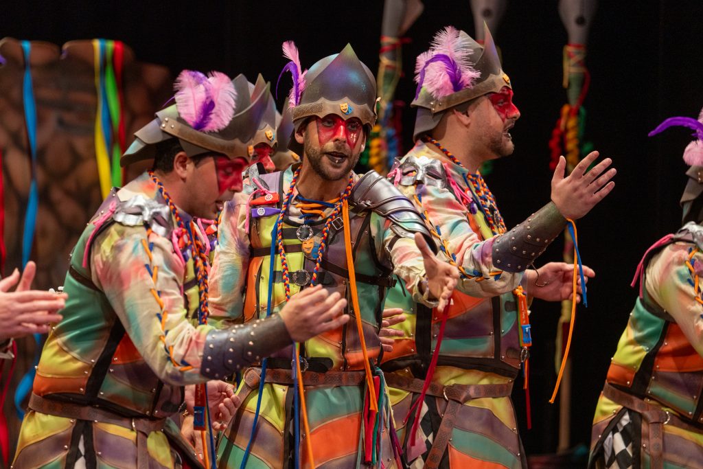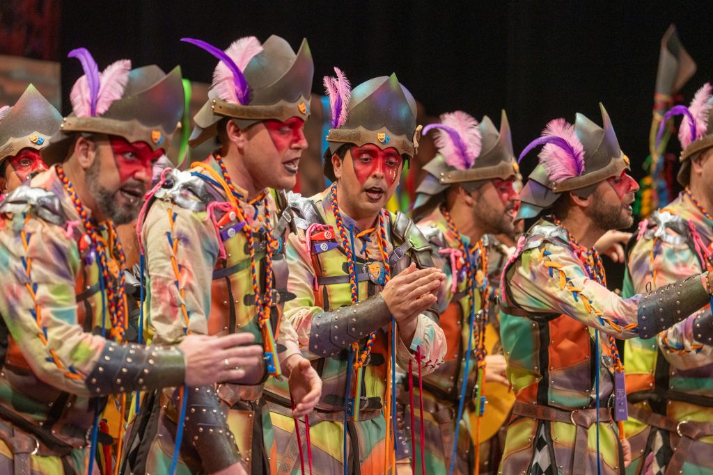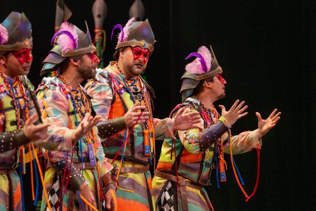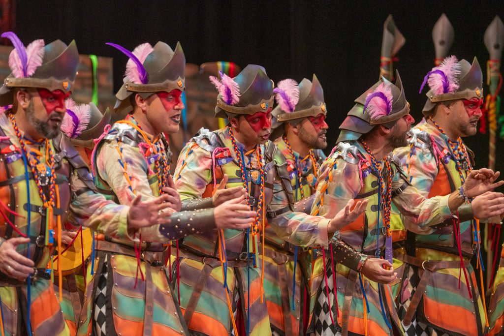 El tipo representaba a custodios de esa “ciudad prohibida”, soldados ceremoniales que custodian las puertas del templo carnavalero. El forillo fue lo más sugerente de la propuesta: el recinto fortificado adoptaba forma de guitarra, un gesto plástico que explicaba el concepto con claridad visual. En lo interpretativo, la presentación arrastró problemas de afinación, empaste y vocalización, además de una evidente falta de cohesión entre cuerdas. La colocación de voces no permitió que el grupo abriera el sonido en ningún momento y la entrada al primer pasodoble llegó sin haber asentado tono ni ritmo.