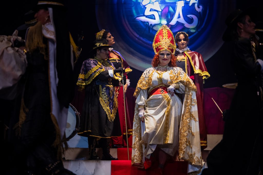 La presentación actúa como una declaración de principios. Con una melodía que remite a la tarantela italiana, en guiño al término “camorra”, la comparsa expone sin rodeos los ejes de su discurso: connivencia con el poder, impunidad histórica y uso interesado de la moral religiosa. No busca el golpe efectista, sino marcar el tono grave y desafiante que recorrerá todo el pase. Musicalmente suena compacta y segura, con un grupo plenamente convencido de lo que está contando.