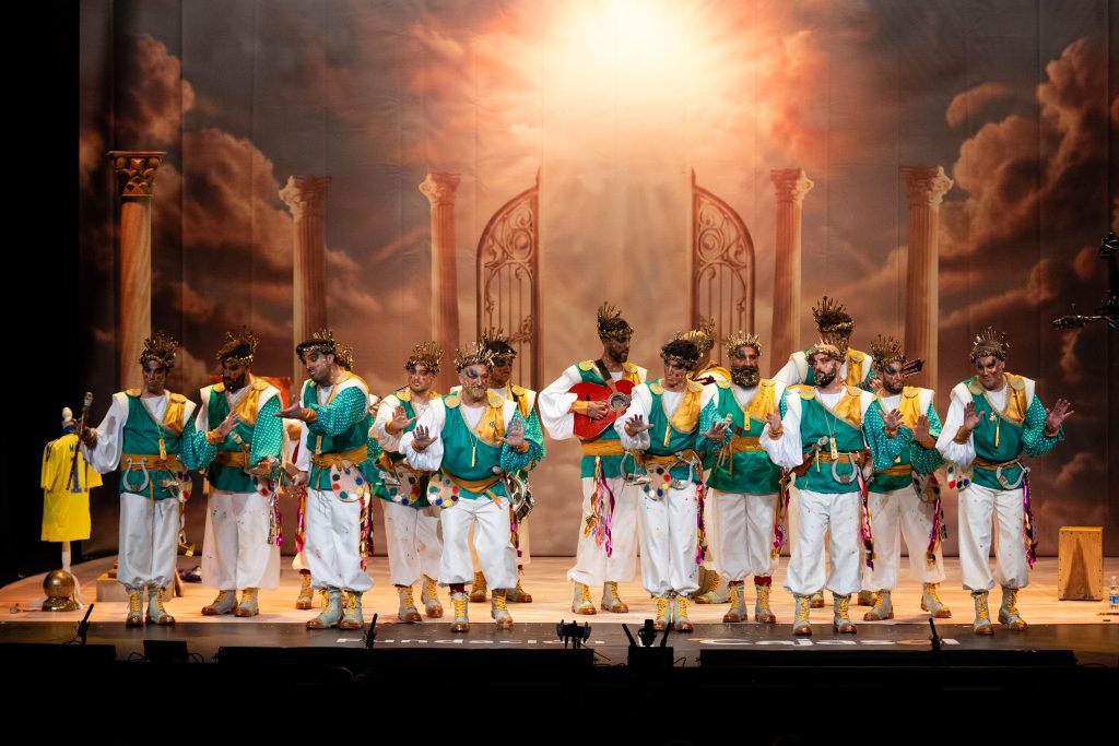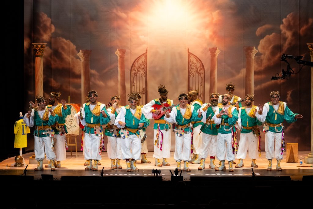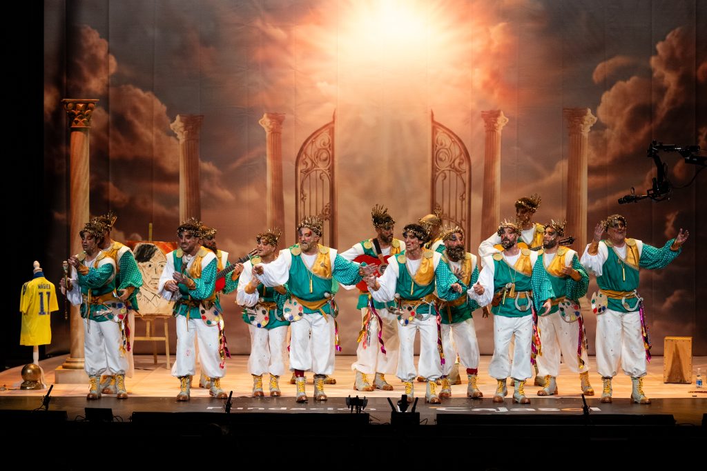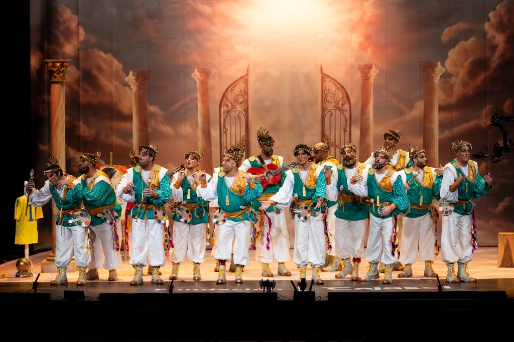 La comparsa algecireña presentó ‘La gracia divina’, un tipo de dioses que reparten la “gracia” desde el Olimpo, con un desarrollo simbólico que no terminó de cuajar ni en lo musical ni en lo conceptual.