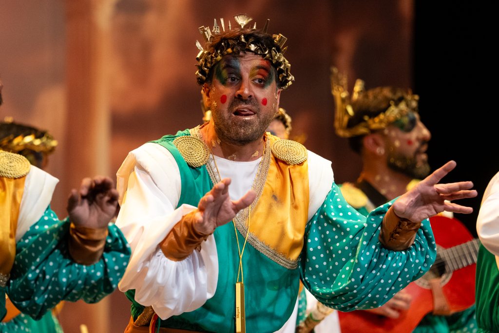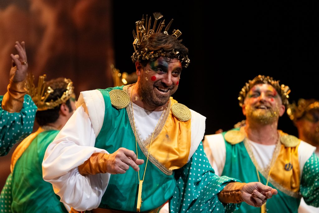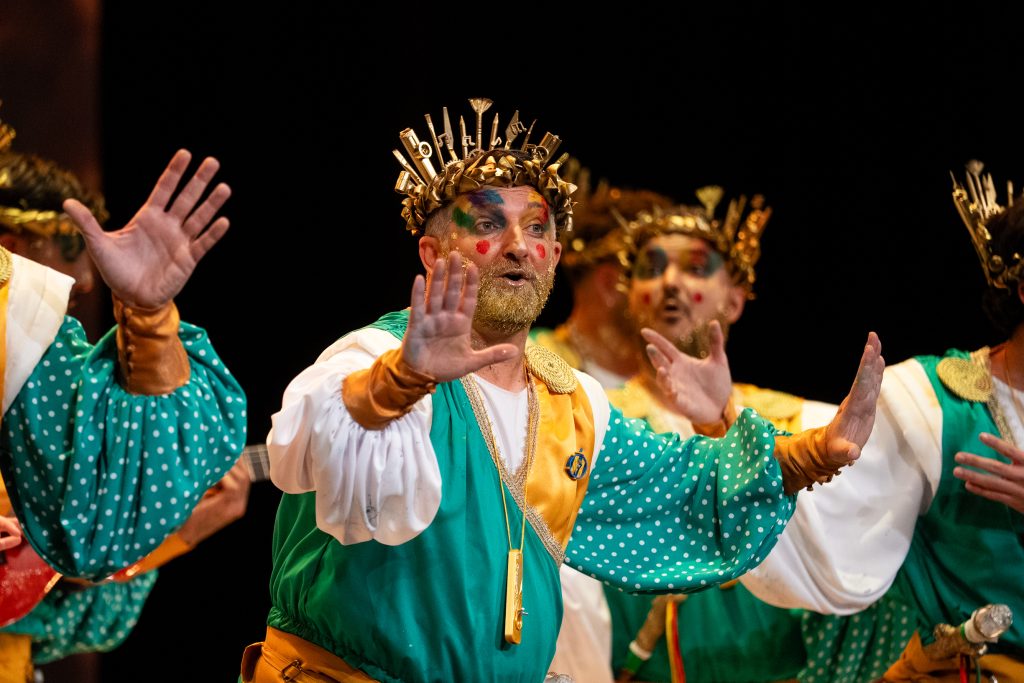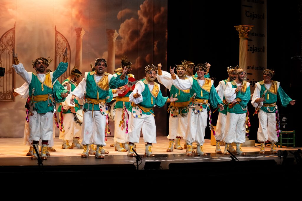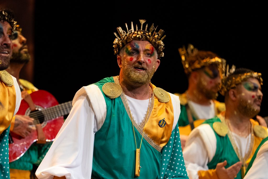 La comparsa algecireña presentó ‘La gracia divina’, un tipo de dioses que reparten la “gracia” desde el Olimpo, con un desarrollo simbólico que no terminó de cuajar ni en lo musical ni en lo conceptual.