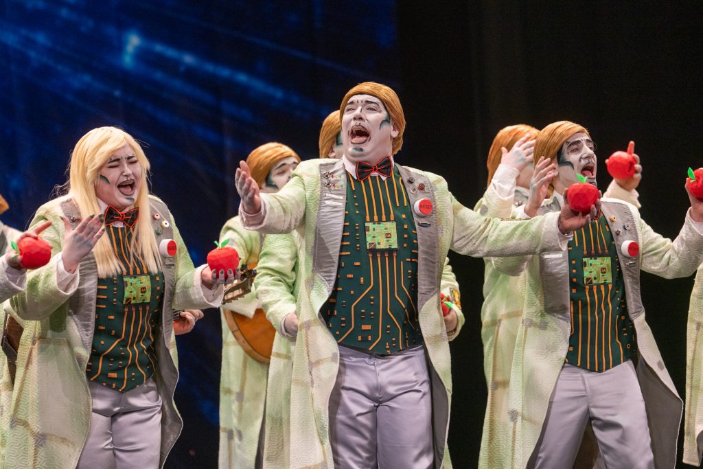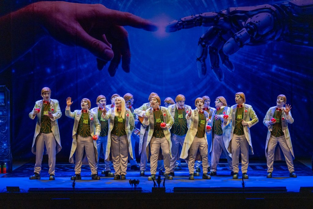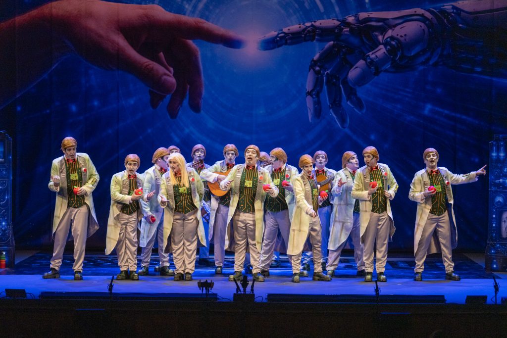 El tipo se introdujo desde la presentación a través del personaje “Vicente”, asistente digital que sustituye virtualmente las capacidades humanas: “lo virtuoso de su mente por sapiencia artificial”. El recurso se apoyó en una estética de futuro cercano, con referencias a la creación de Adán reinterpretada por IA, y el símbolo de la manzana como detonante del conocimiento. La idea era potente en lo conceptual, con posibilidades para el contraste emocional y la crítica social, aunque el desarrollo escénico fue poco visible y la caracterización se quedó corta en impacto visual, lo que restó fuerza dramática a una idea central que pedía más contundencia.