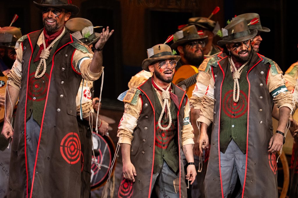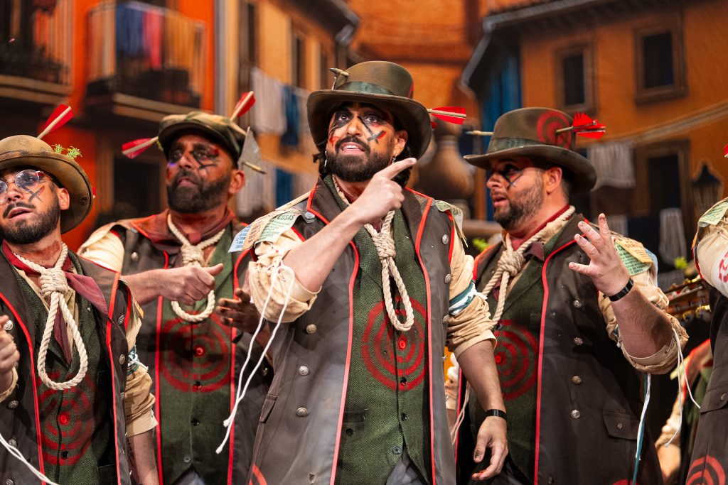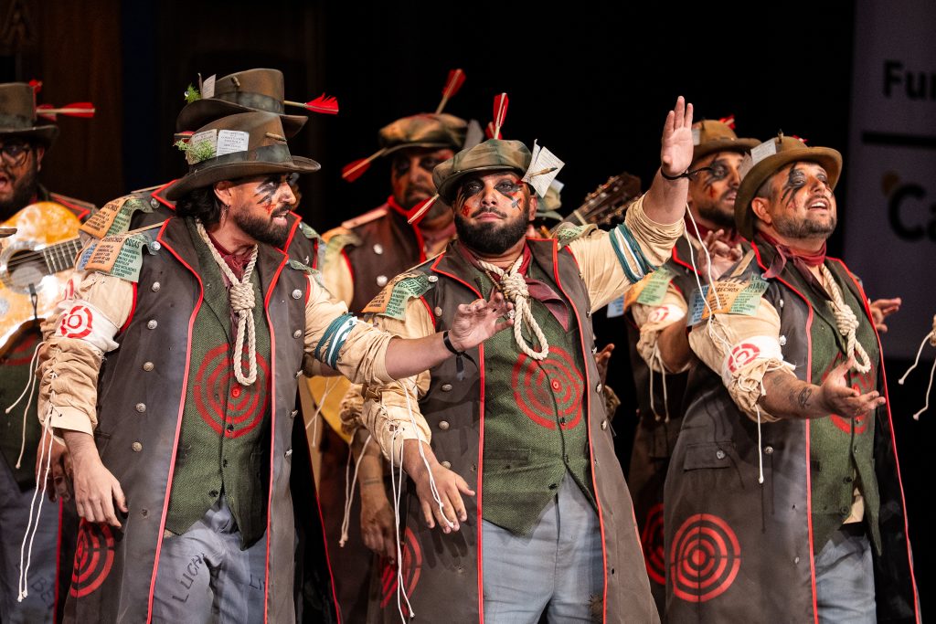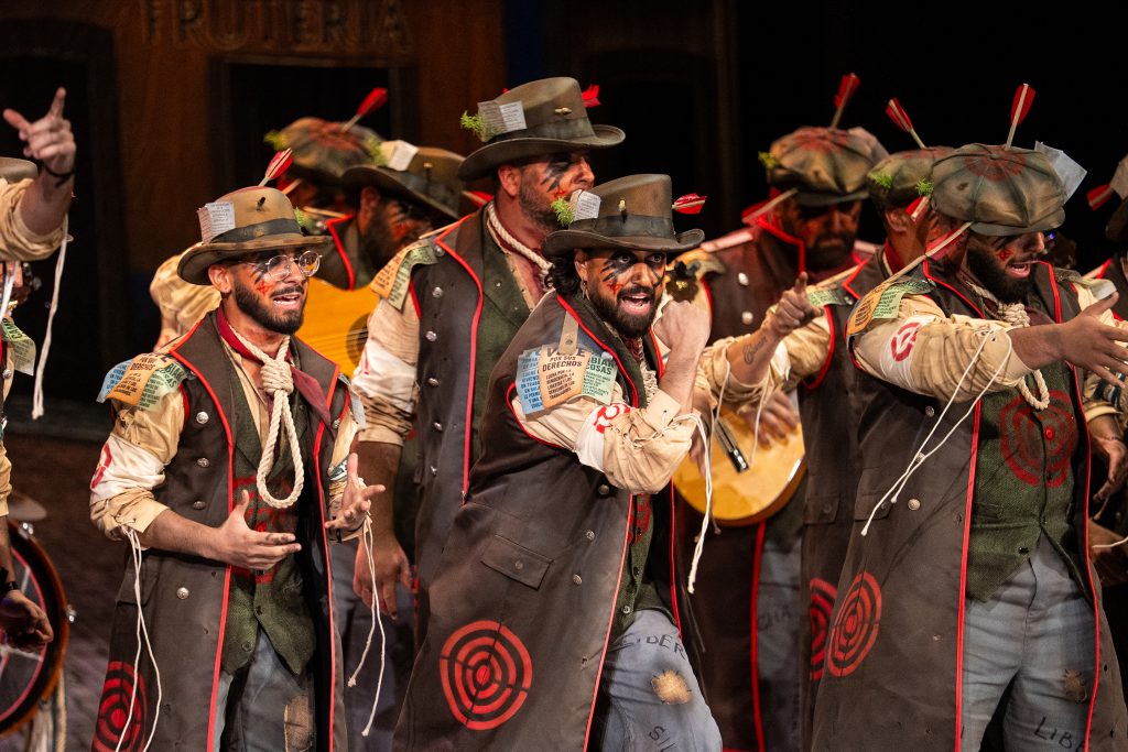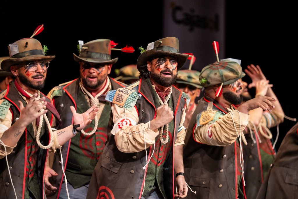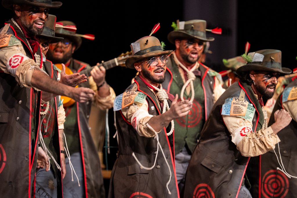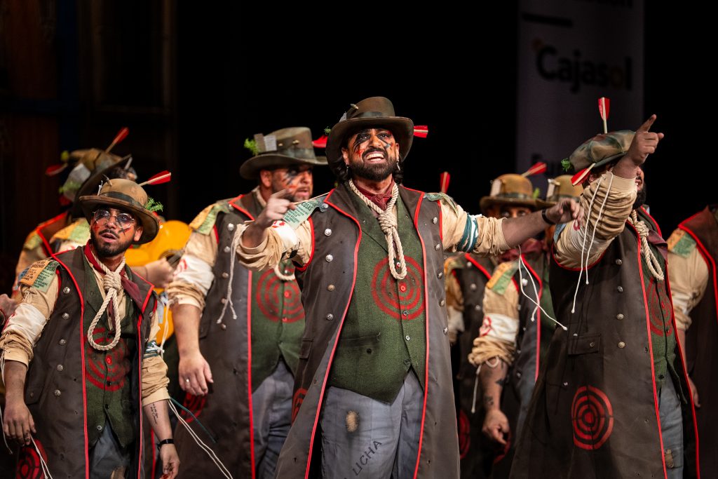 La comparsa sevillana ‘Los señalaos’, procedente de Alcalá de Guadaíra y conocida como la agrupación del Masita, compareció con un repertorio construido sobre la figura del individuo señalado por pensar distinto y expresarse en contra del poder. El tipo escénico representó a personajes con dianas, flechas, sogas y marcas visibles en sombreros y gabardinas, formando un discurso centrado en la rebeldía, la insumisión y la defensa de la palabra frente al silencio.