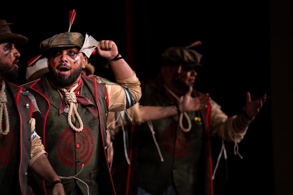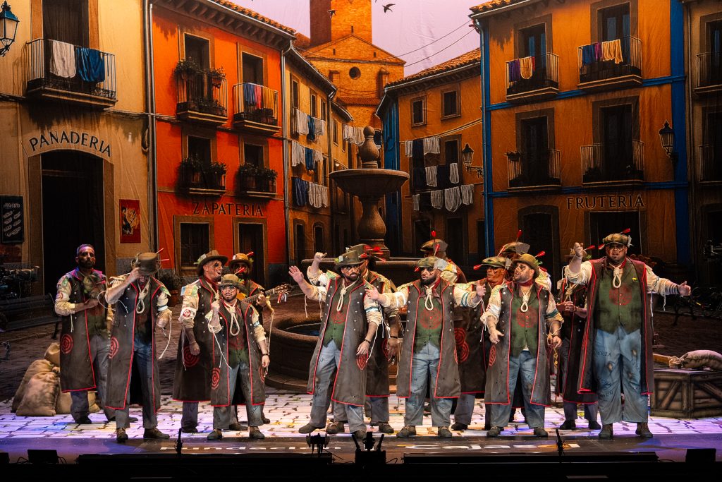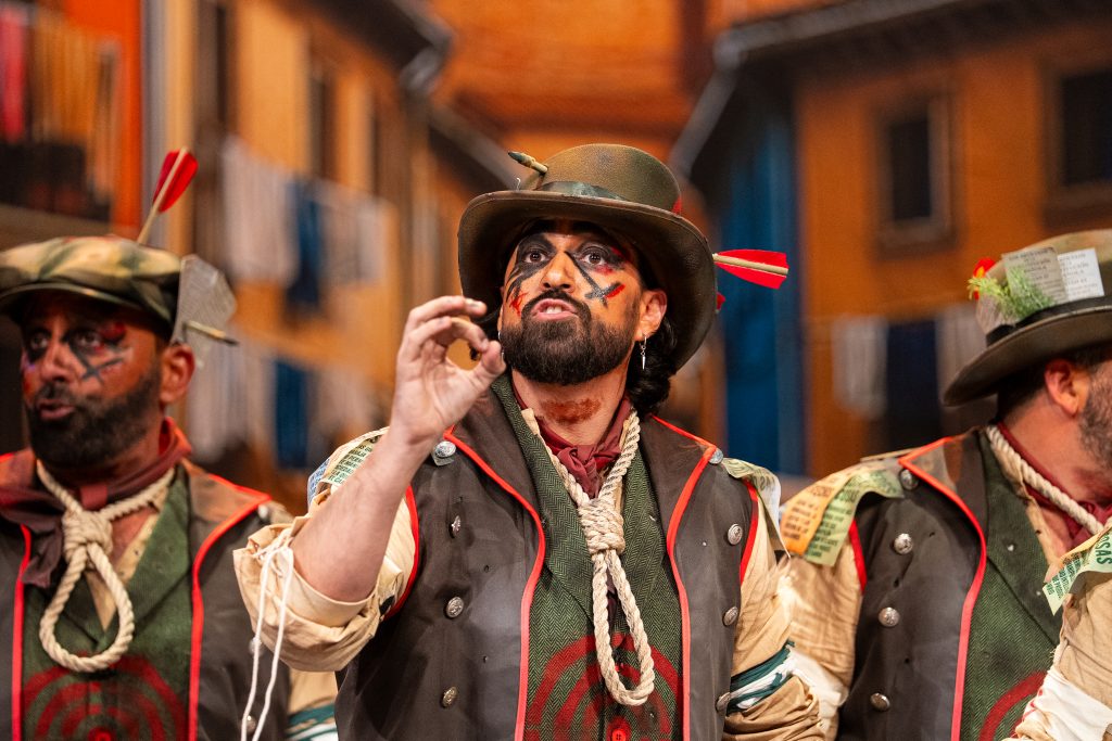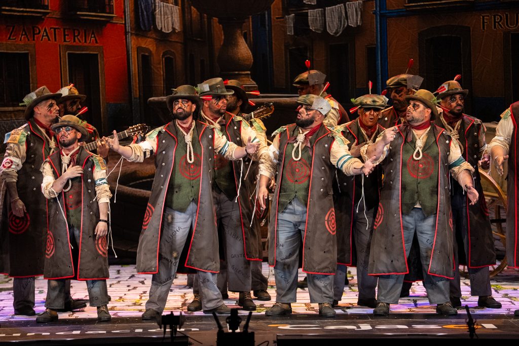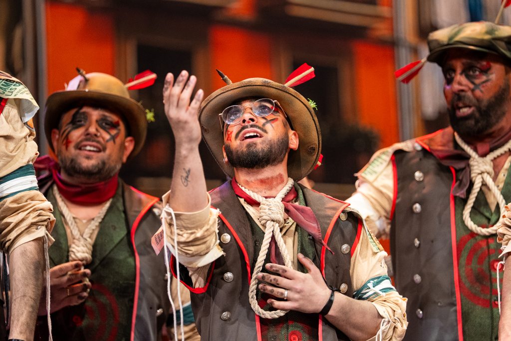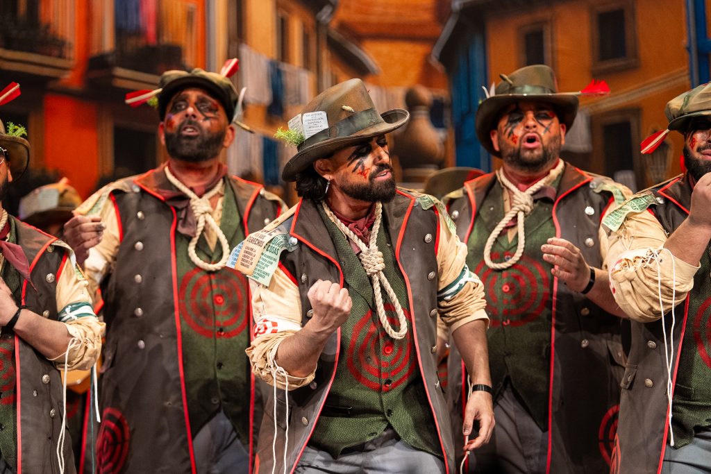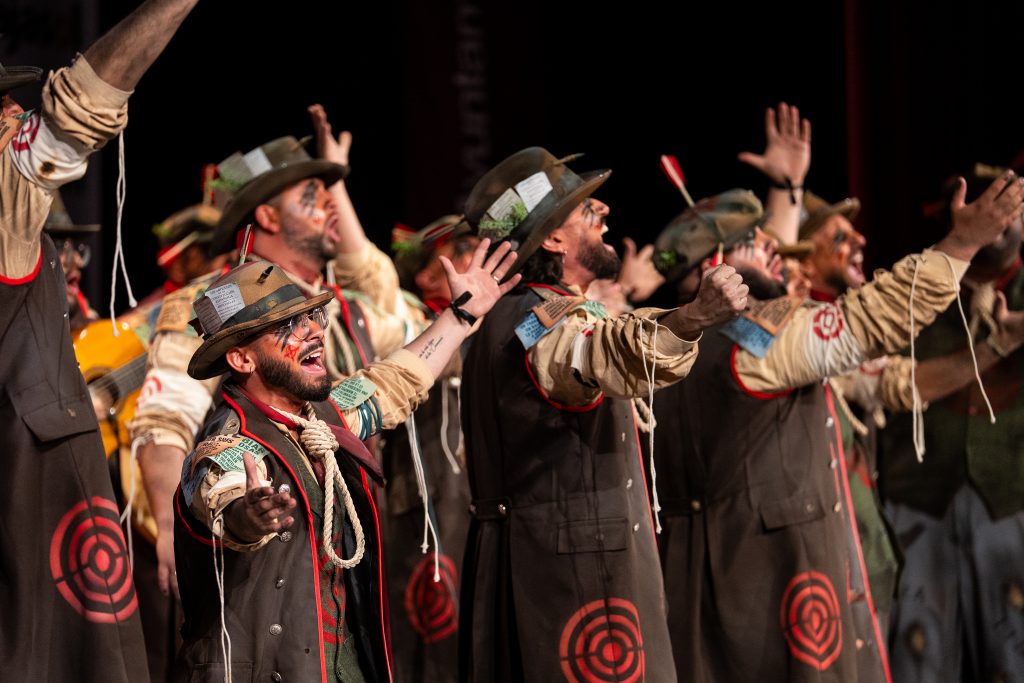 La comparsa sevillana ‘Los señalaos’, procedente de Alcalá de Guadaíra y conocida como la agrupación del Masita, compareció con un repertorio construido sobre la figura del individuo señalado por pensar distinto y expresarse en contra del poder. El tipo escénico representó a personajes con dianas, flechas, sogas y marcas visibles en sombreros y gabardinas, formando un discurso centrado en la rebeldía, la insumisión y la defensa de la palabra frente al silencio.