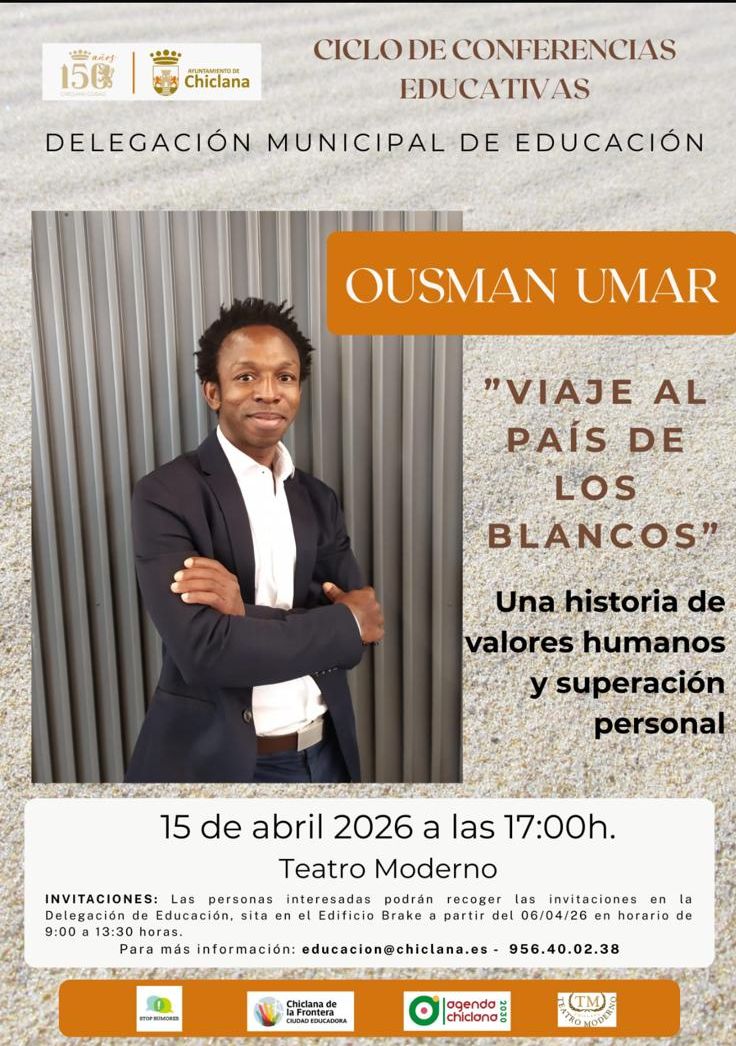 El Teatro Moderno de Chiclana acogerá el próximo 15 de abril, a las 17.00 horas, la conferencia de Ousman Umar en Chiclana, una iniciativa organizada por la Delegación Municipal de Educación dentro de su Programa de Conferencias Educativas.
