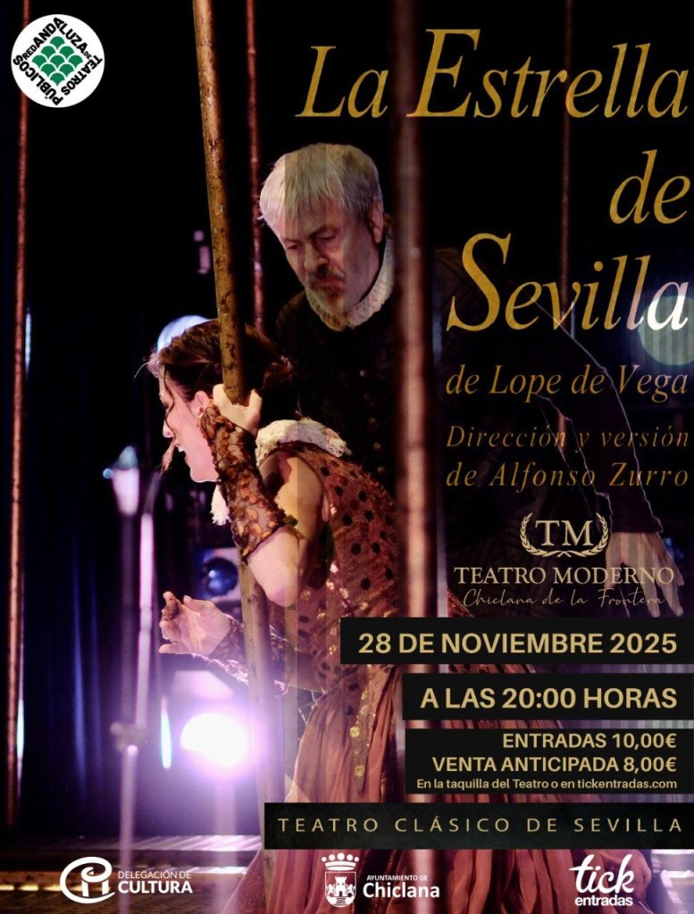 El Teatro Moderno de Chiclana acogerá este viernes 28 de noviembre, a las 20:00 horas, la puesta en escena de La Estrella de Sevilla, una de las tragedias más representativas del Siglo de Oro español. El montaje llega de la mano de la compañía Teatro Clásico de Sevilla, bajo la dirección de Alfonso Zurro, con el propósito de acercar al público una obra fundamental del repertorio clásico que reflexiona sobre el ejercicio del poder y la libertad ciudadana.